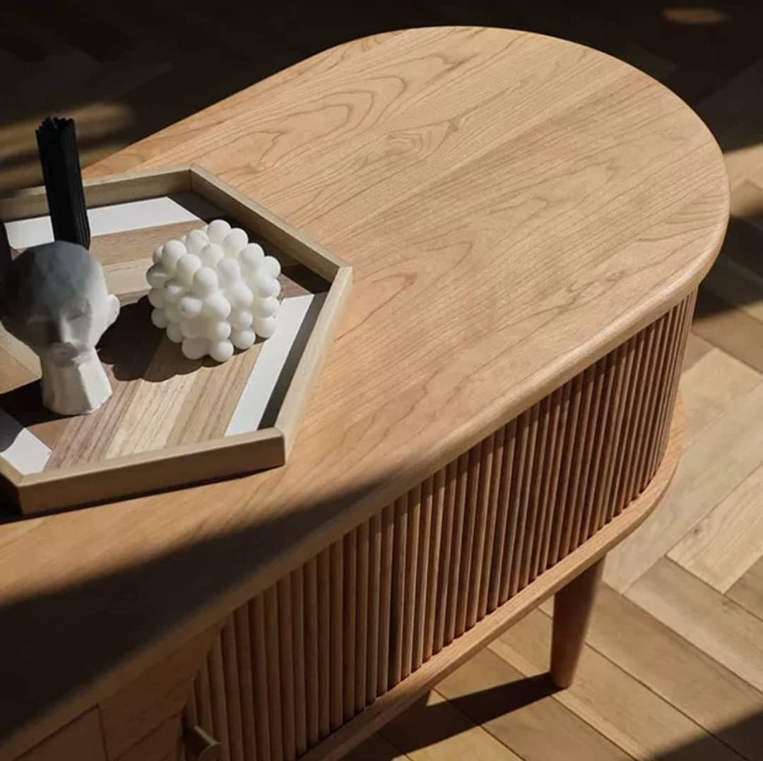 Плавные, без острых углов, формы. Оригинальный дизайн, оптимальное использование пространства. Изготовлена целиком из массива ароматного вишневого дерева. Размеры на фото.