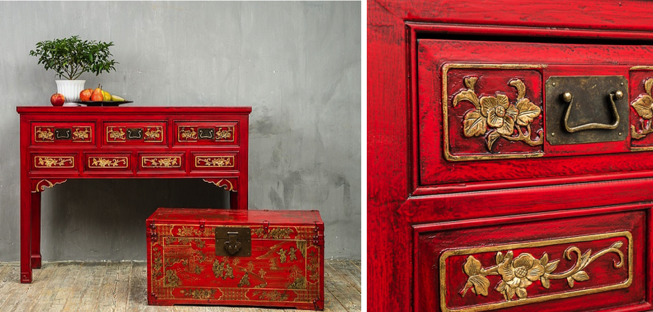 Консоль Imperior Red – стол для хранения ритуальных предметов. Династия Цин Такой стол был комбинированным вариантом стола Ань (письменного стола) и выдвижными ящиками. Такая модель сочетала демонстративные задачи с функцией хранения. Консоль Imperior Red искусно украшена резьбой и изображениям трав и драконов, которые означали власть и бдительность.