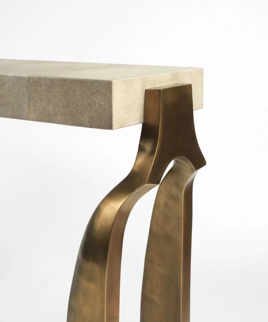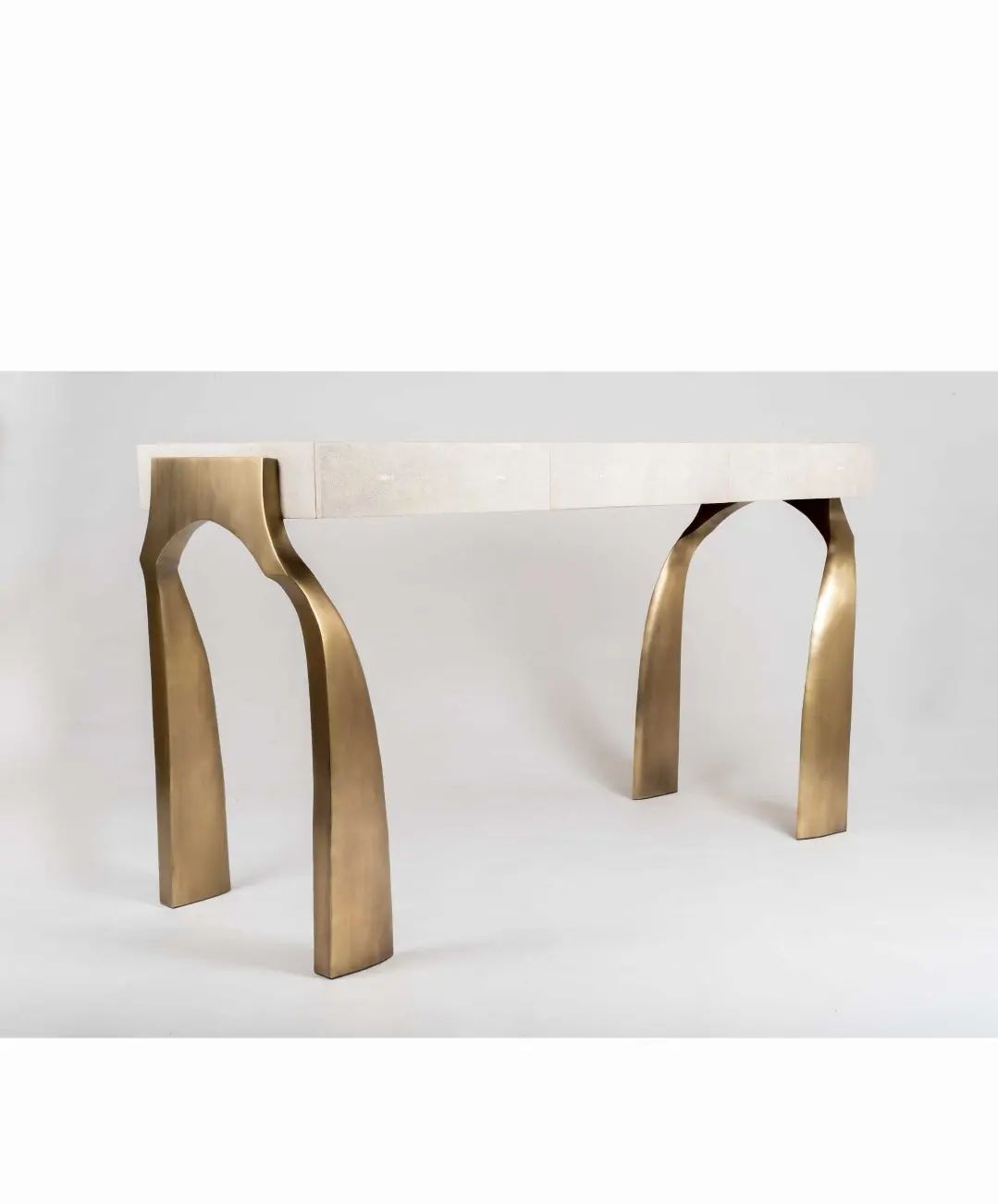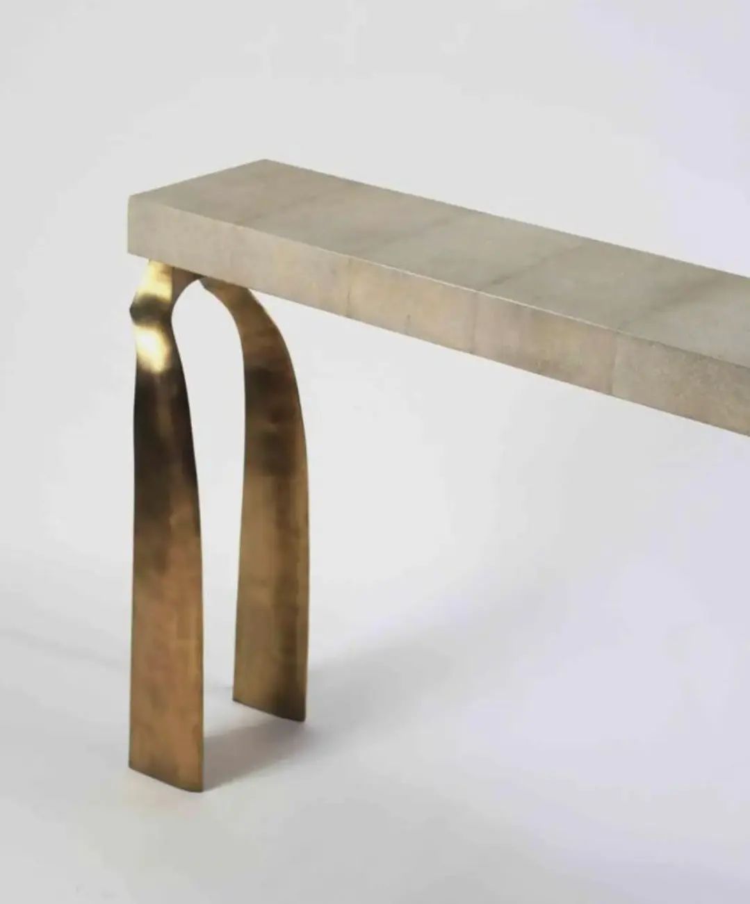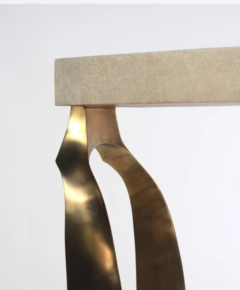 Уникальная консоль с легкой отсылкой к античности. Благородная, стильная и штучная красота для вашего личного пространства. 100% ручная работа. Столешница – мрамор с обработанной под шагрень (кожа ската) поверхностью, очаровательное подстолье – патинированная (состаренная) латунь.