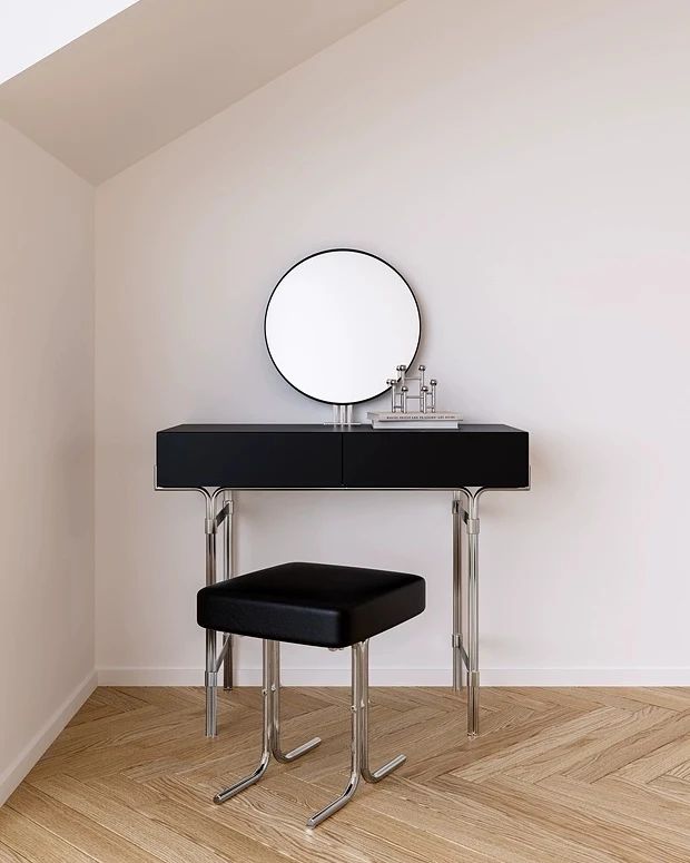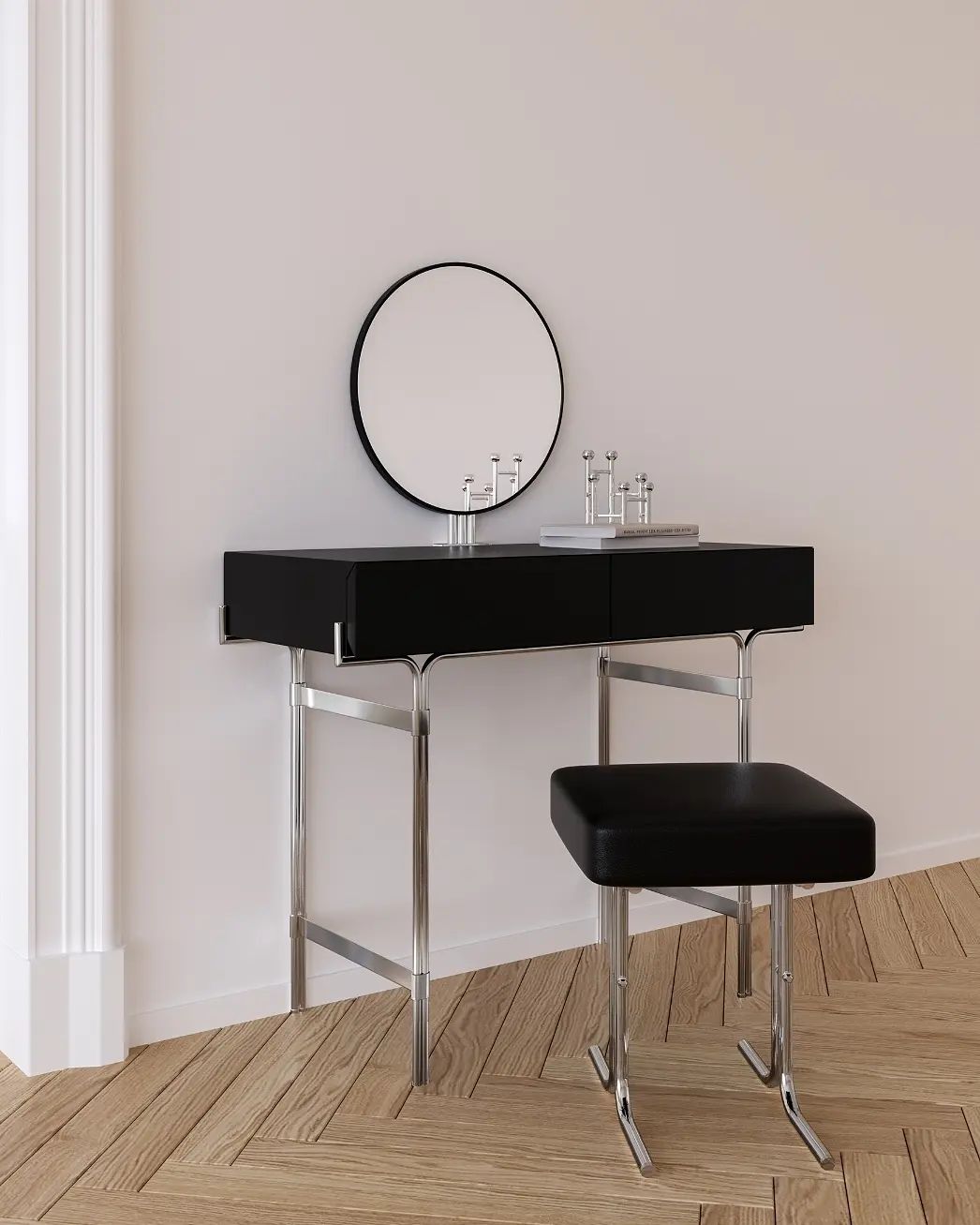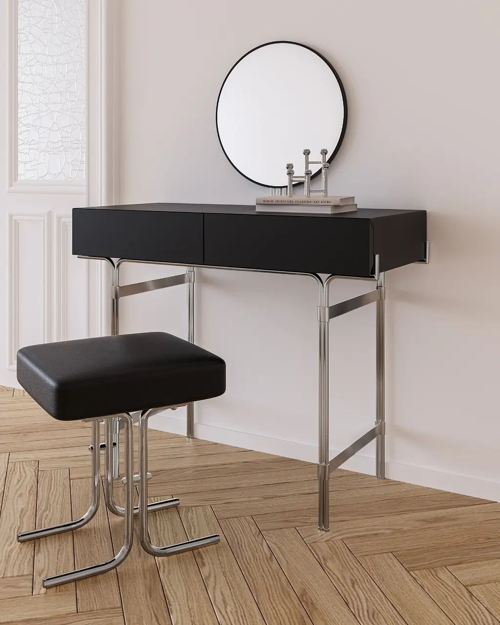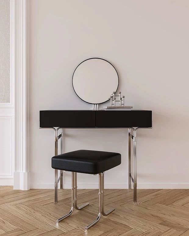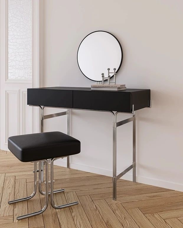 Роскошный консольный/туалетный столик с зеркалом и стульчиком. Прекрасный современный дизайн и очаровательное сочетание нержавеющей стали с насыщенным чёрным цветом. Столик моментально преобразит интерьер вашей спальни и подарит много приятных минут, которые вы посвятите только себе.