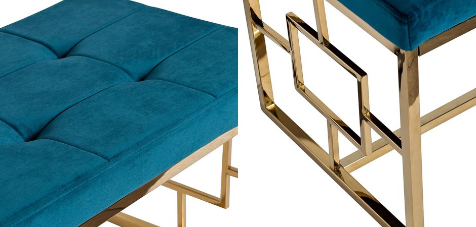 Велюровая банкетка глубокого бирюзового цвета с мягким сиденьем прямоугольной формы, декорированная пуговицами-капитоне на золотистом основании с четким геометрическим орнаментом из нержавеющей стали.