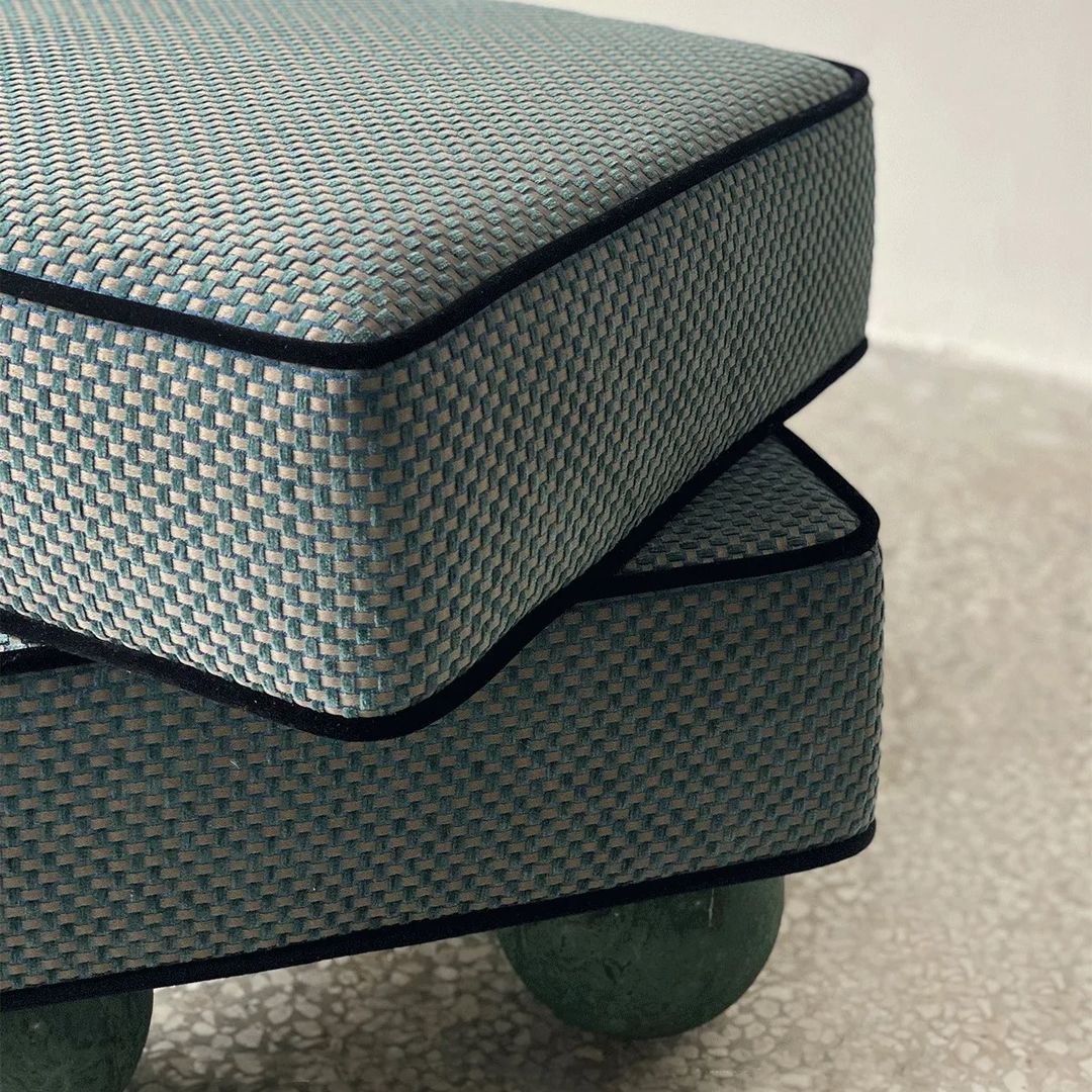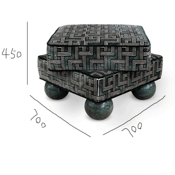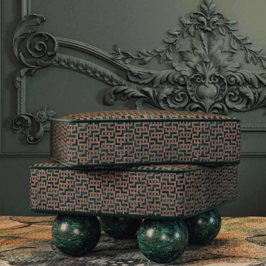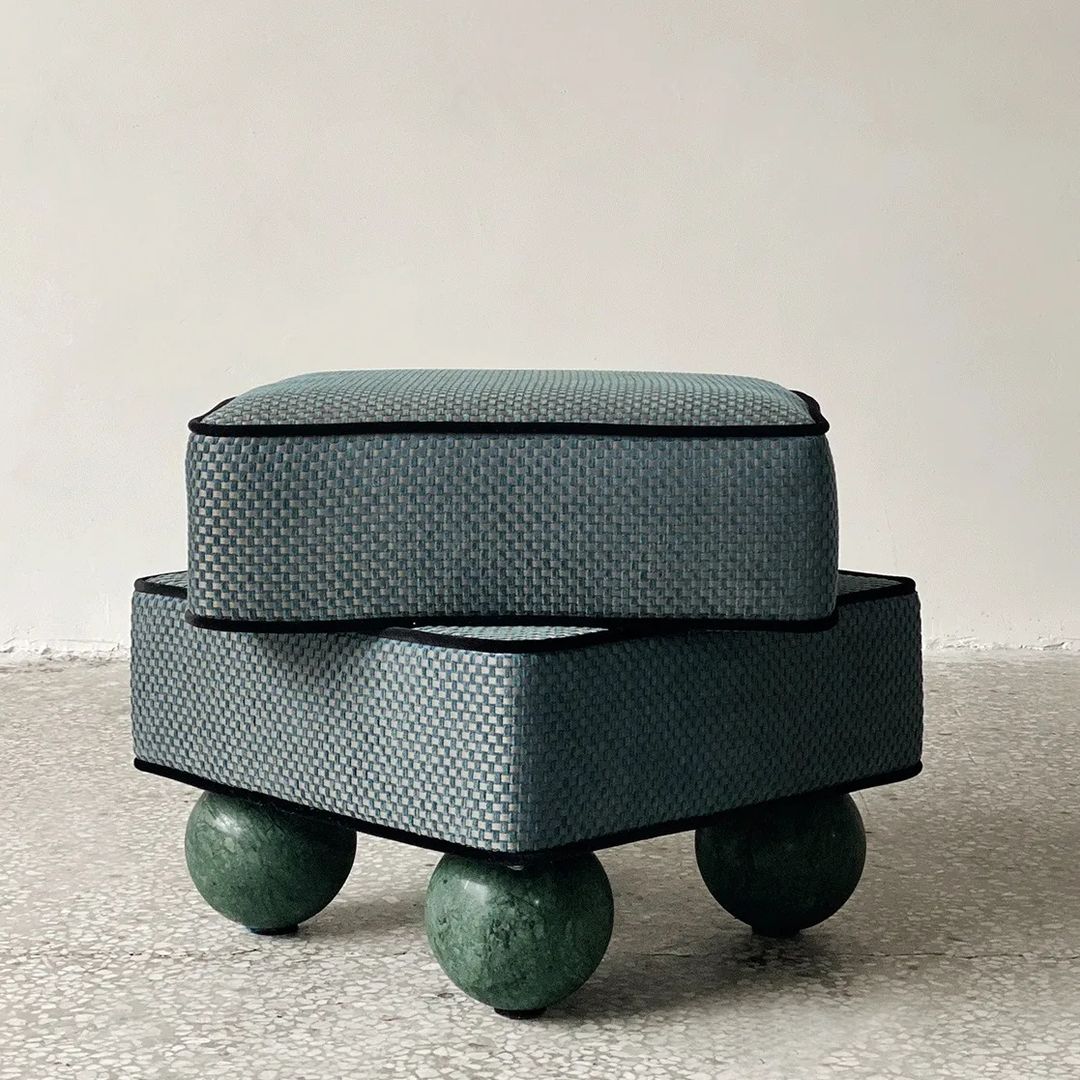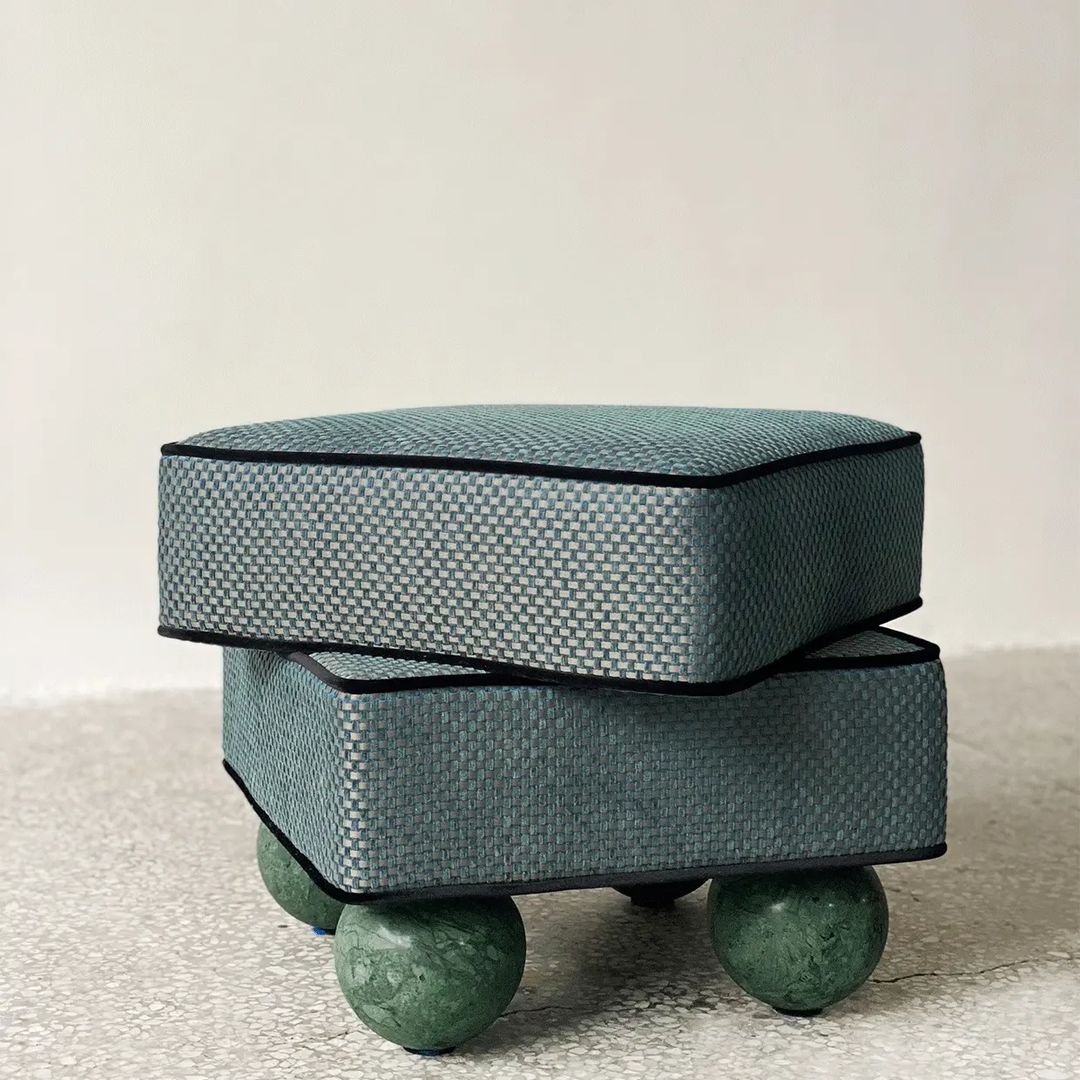 Очаровательный пуфик Monsterior Shop. Классное решение для современного, уникального интерьера. Натуральный зелёный мрамор, варианты обивки – на фото.