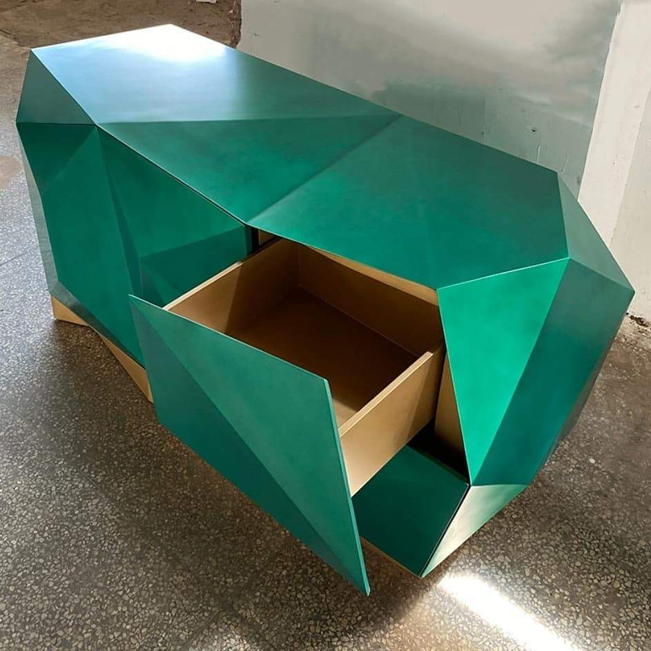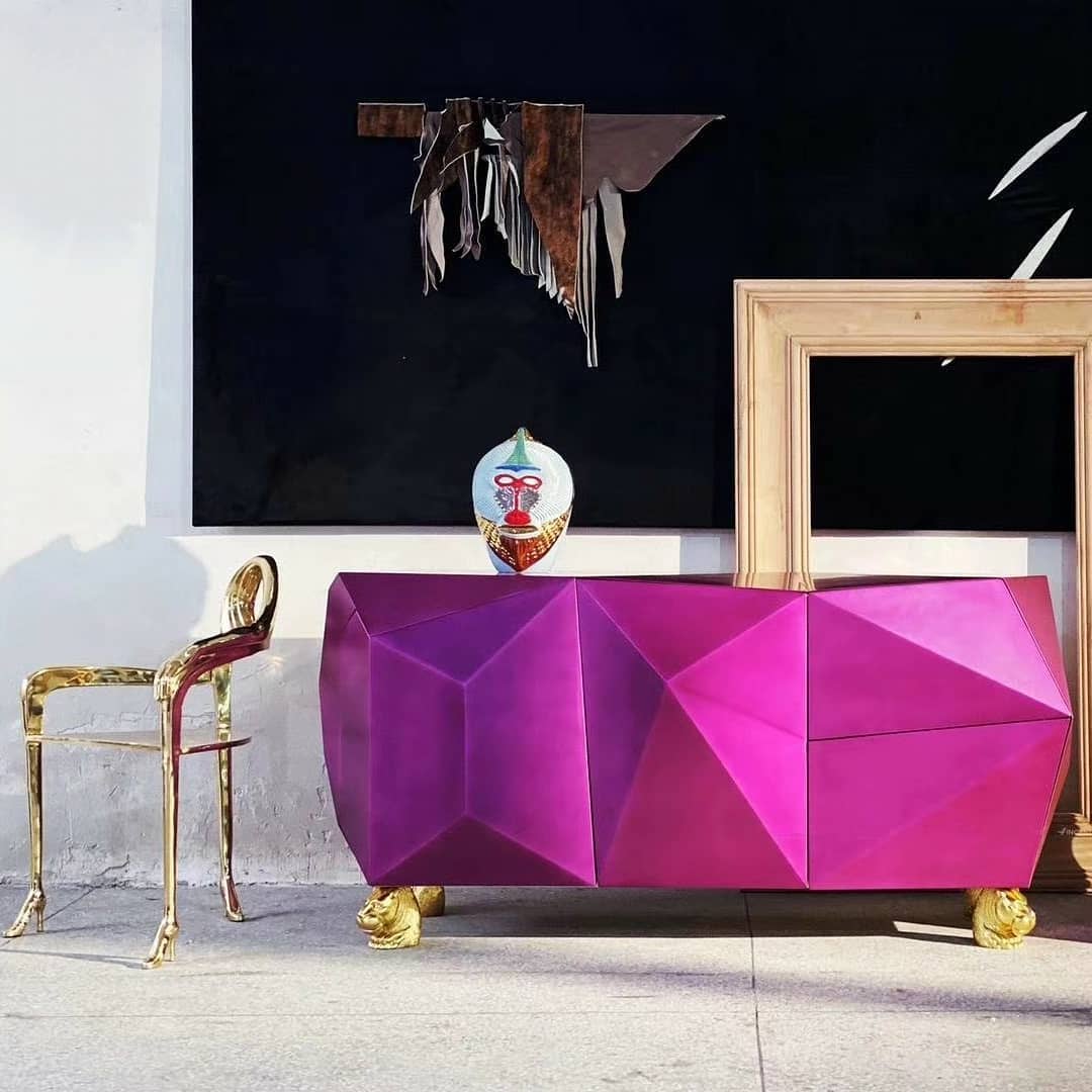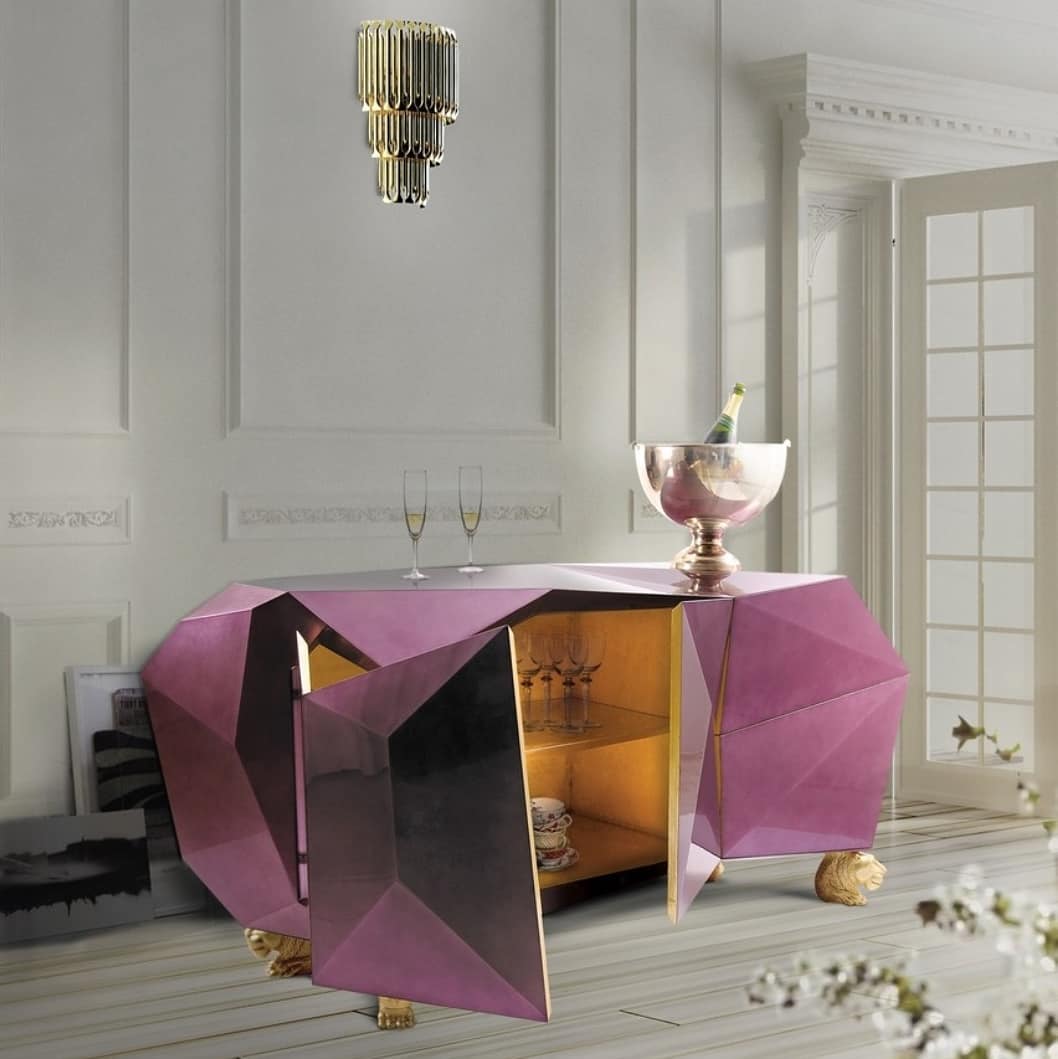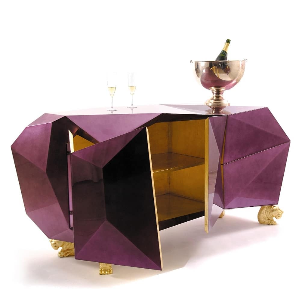 «Аметистовый Алмаз» – уникальная тумба (шкаф, буфет) в стиле арт-деко. Прекрасное и яркое решение для стильного и богатого интерьера вашей гостиной. В этом «алмазе» великолепно всё – и дизайн, и цвет, и фасад, и внутреннее сусально-золотое убранство полочек.