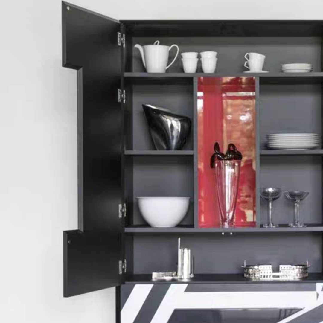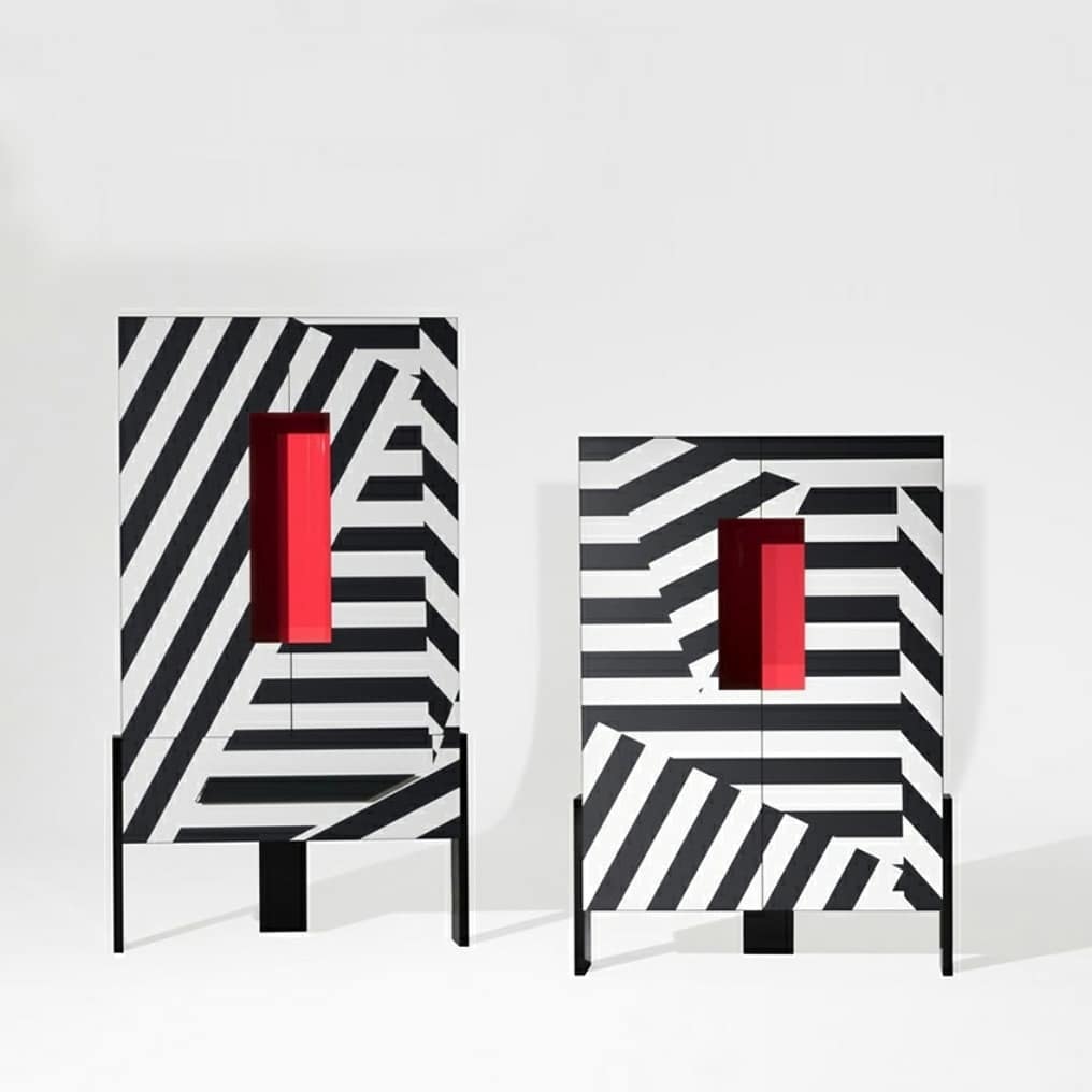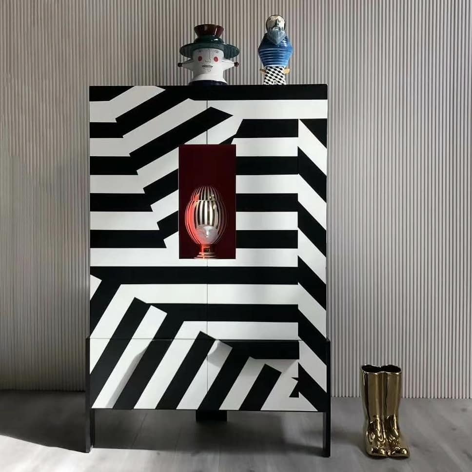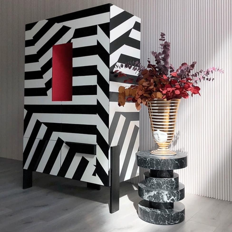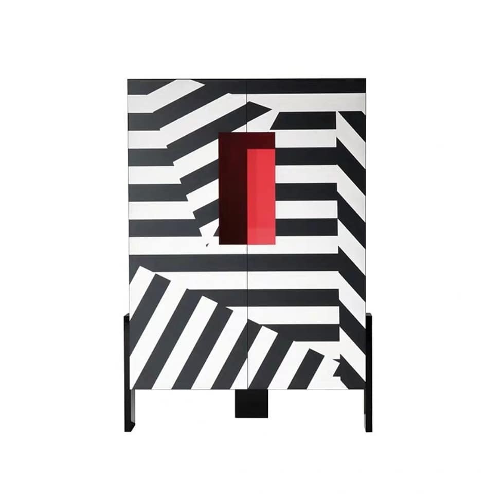 Оригинальный бар, который может использоваться и как шкафчик, и в нём чувствуется явное влияние концептуального искусства. Отлично впишется в интерьер творческих людей, и тех, кто к нему неравнодушен. При использовании его в качестве бара – обладает уникальным индикатором насыщения напитками – если все черные и белые линии на фасаде станут симметричными, то это верный сигнал: хватит!