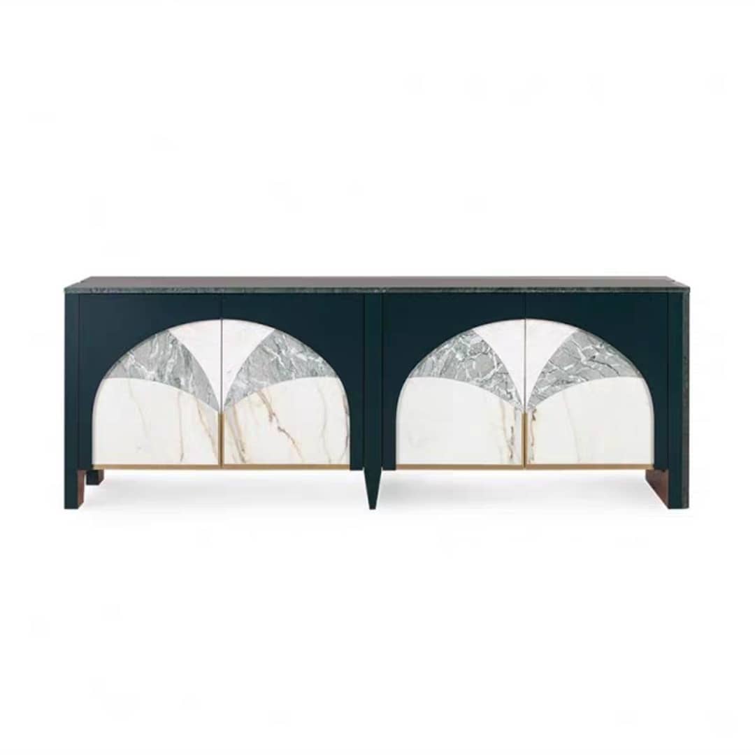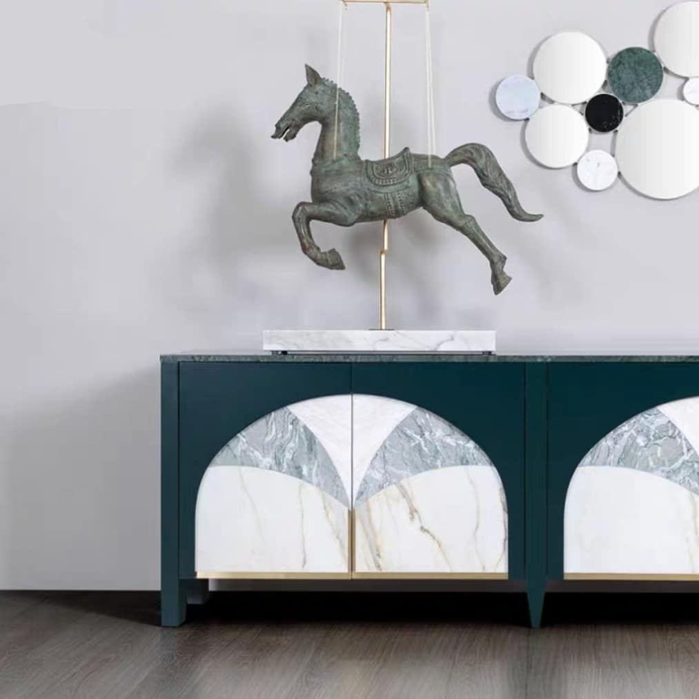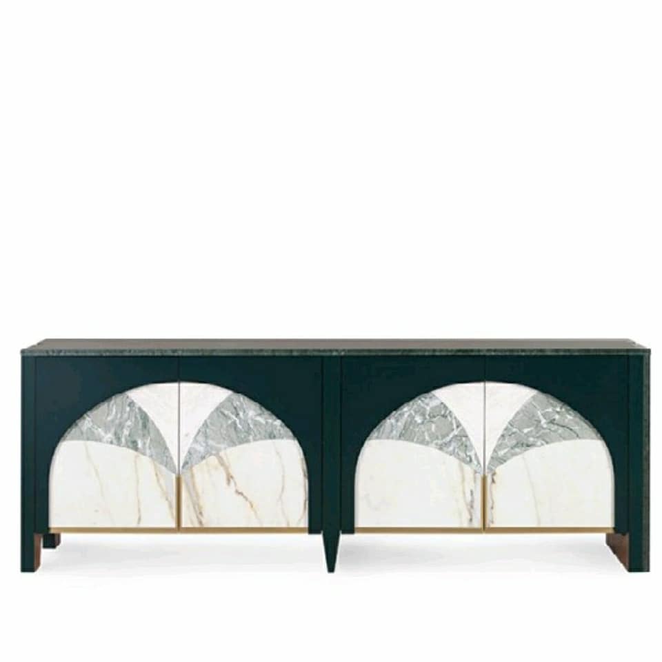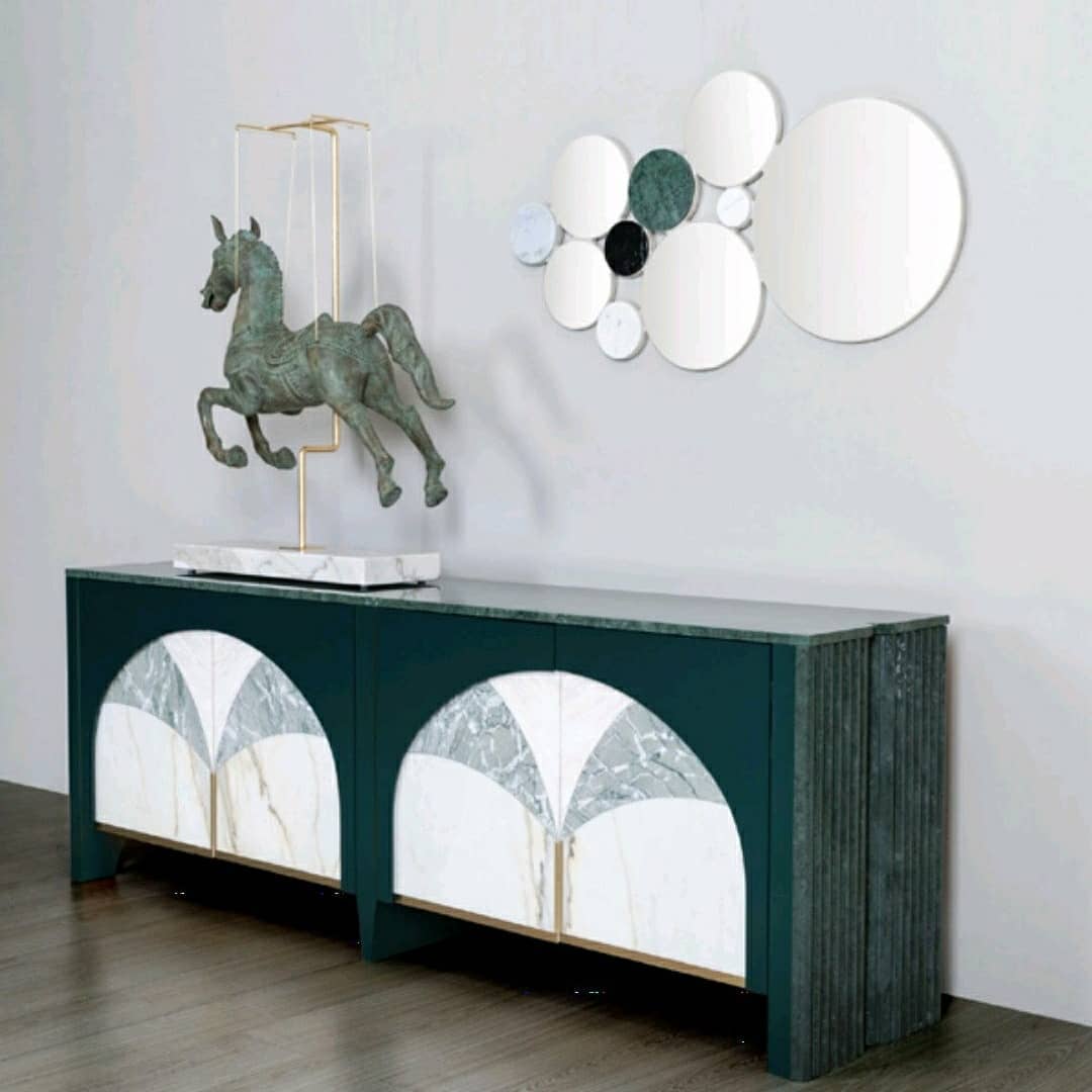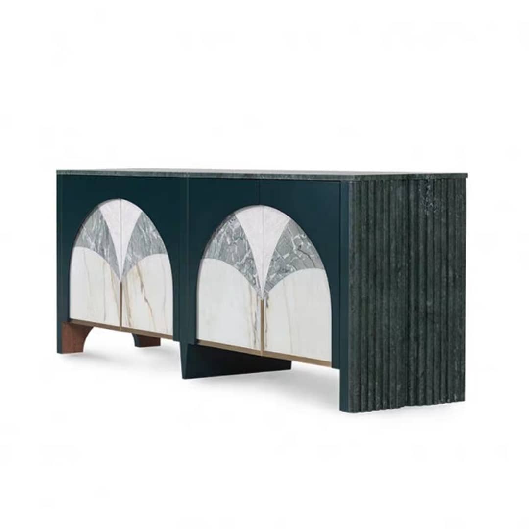 Дизайнерская тумба, благородного темно-изумрудного цвета, с оригинальными «арочными» вставками – на дверцах. Красота сочетания массива дерева и натурального мрамора дополнена ручками и декоративной вставкой из блестящей латуни. Размеры – на фото.