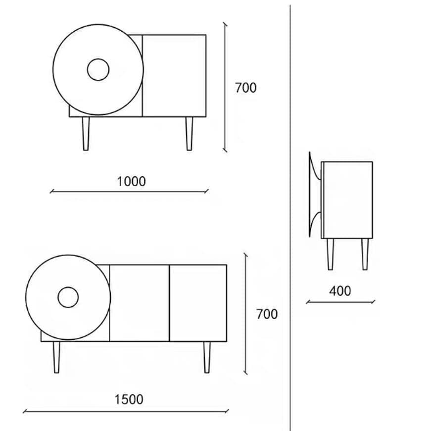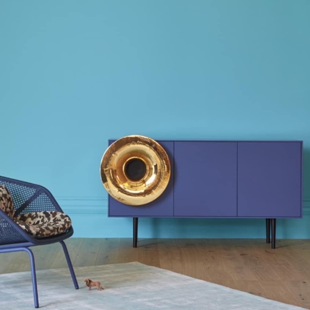 Оригинальный шкаф-тумба, который идеально бы вписался в ясную концепцию минимализма, если бы не фантастическая декоративная деталь – стилизованный рупор граммофона из нержавеющей стали, со специальным покрытием.