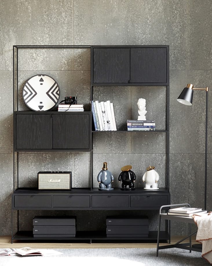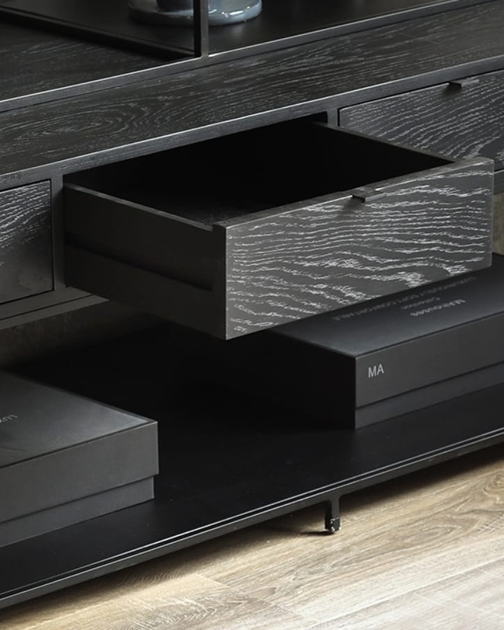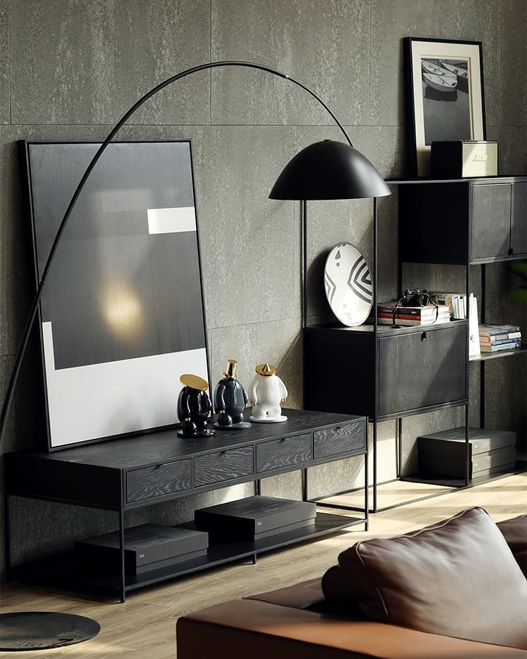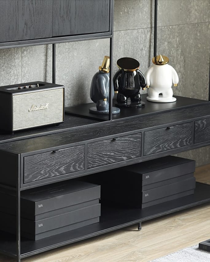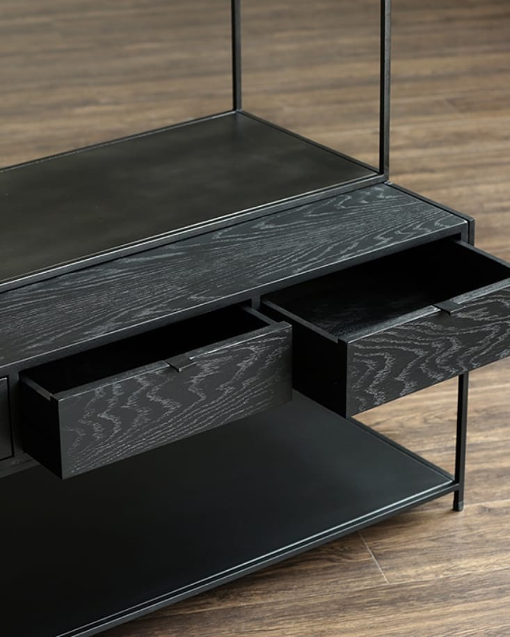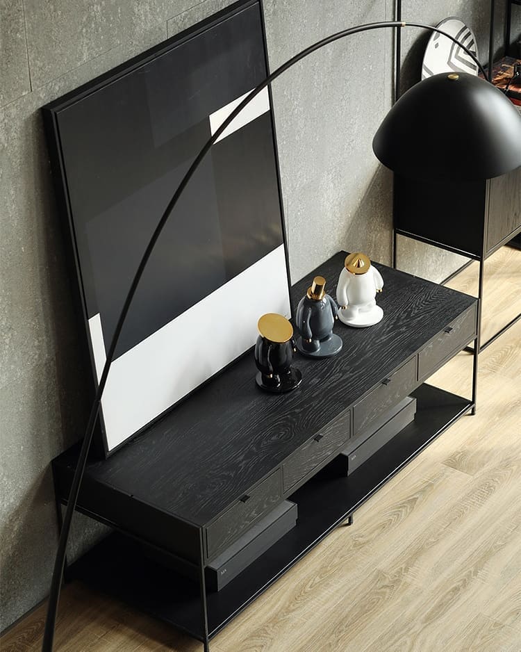 Стильный, нарядный «дуэт» – дизайнерский стеллаж и тумба. Они кажутся единым целым, и идеально подходят друг к другу, но можно приобрести их и по отдельности. Вечная востребованная классика черного бескомпромиссного цвета.