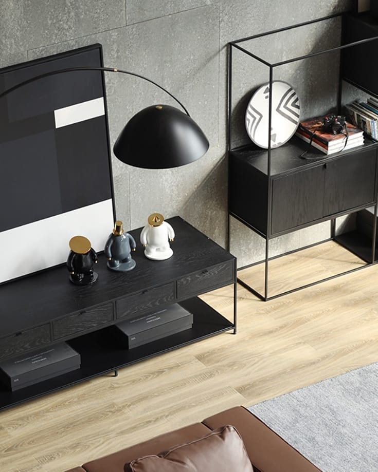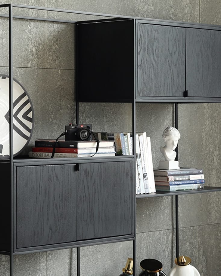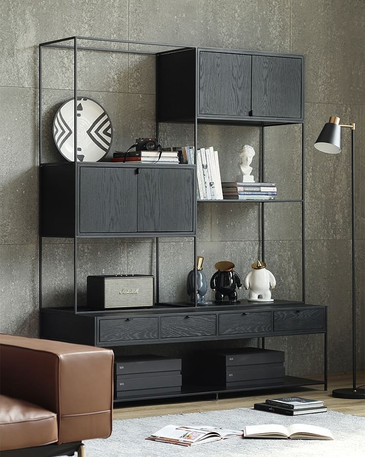 Стильный, нарядный «дуэт» – дизайнерский стеллаж и тумба. Они кажутся единым целым, и идеально подходят друг к другу, но можно приобрести их и по отдельности. Вечная востребованная классика черного бескомпромиссного цвета.