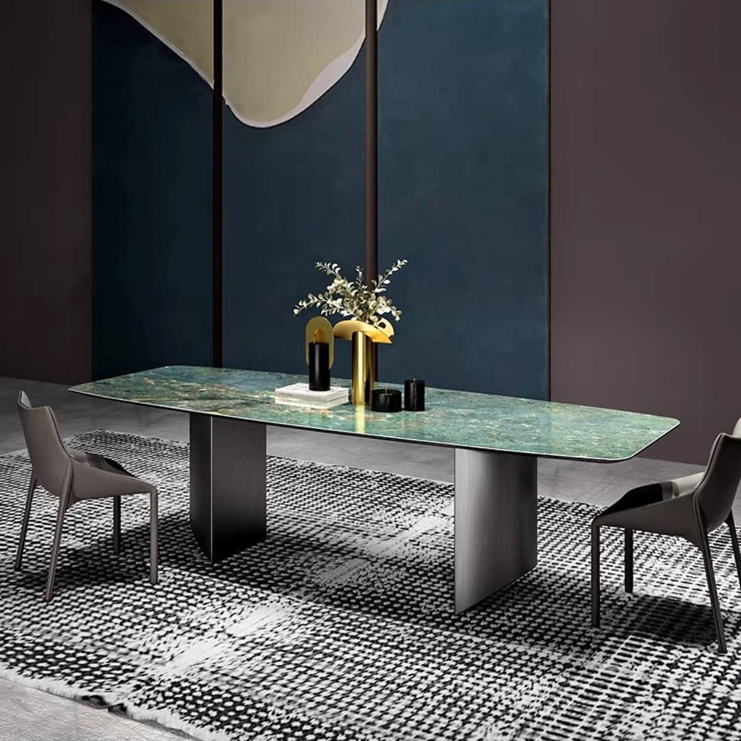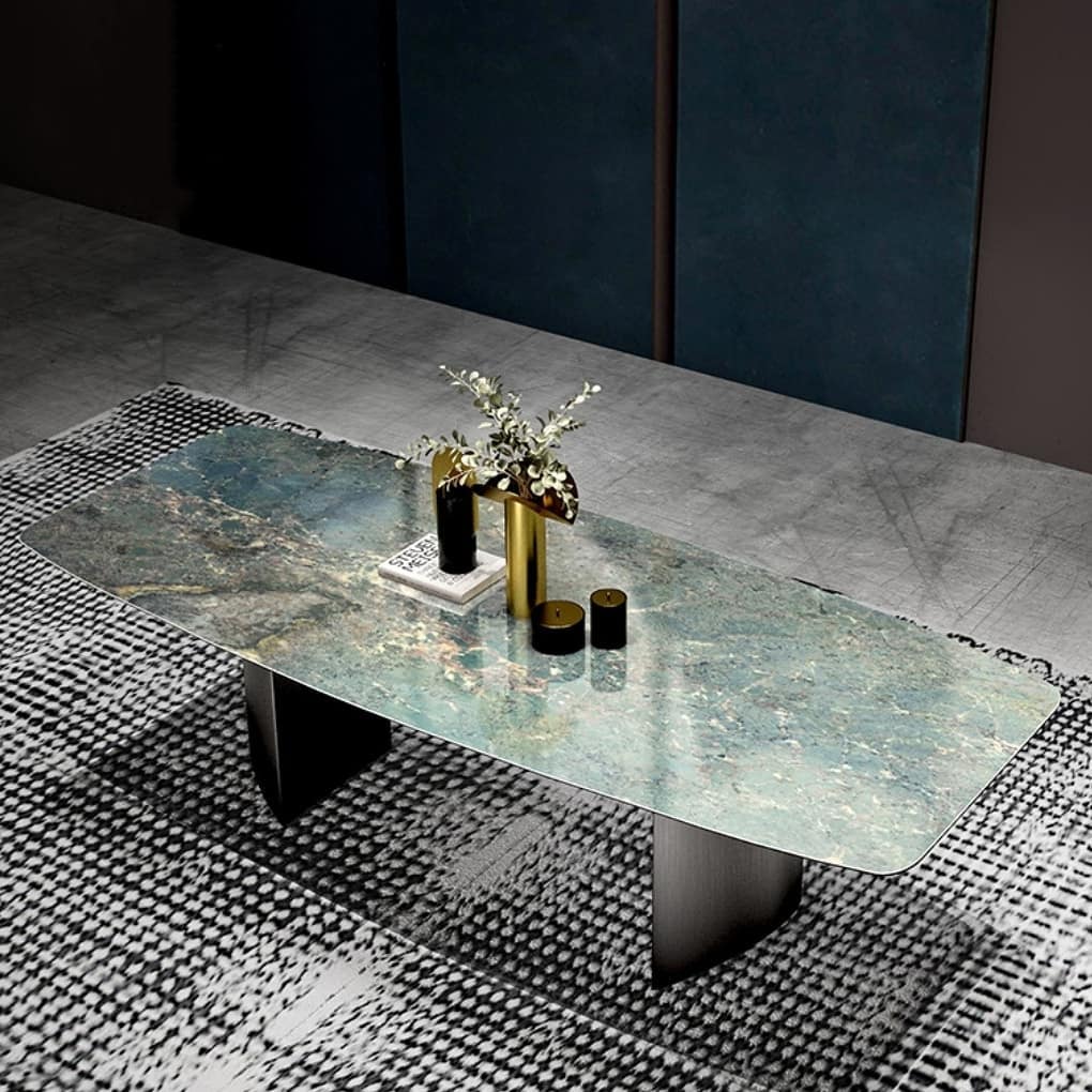 Роскошный обеденный стол со столешницей из спеченного камня – современного материла, твердость которого превышает твердость магматических пород. Очаровательный дизайн, комфорт, практичность и супер-долговечность. Отличное решение для современного уникального интерьера гостиной или кухонного острова.