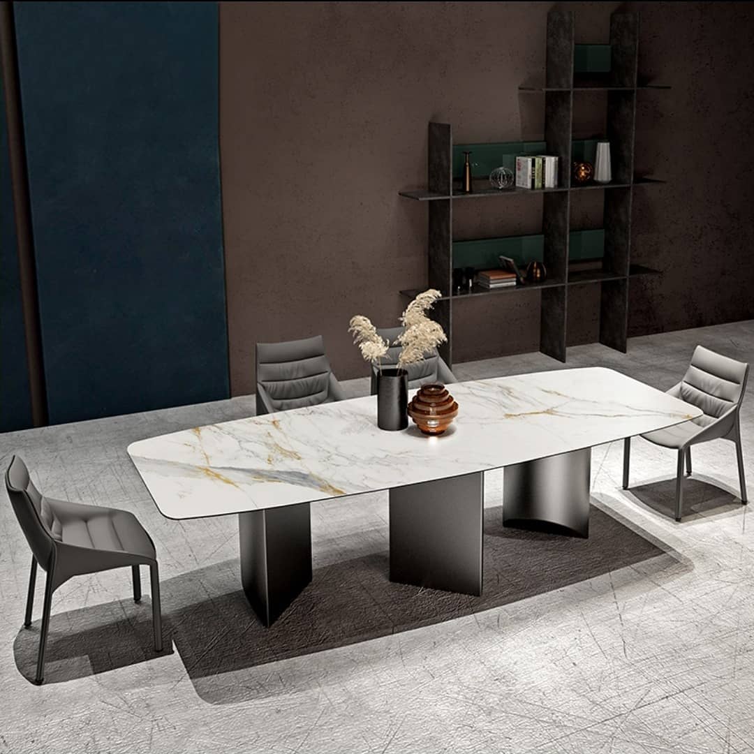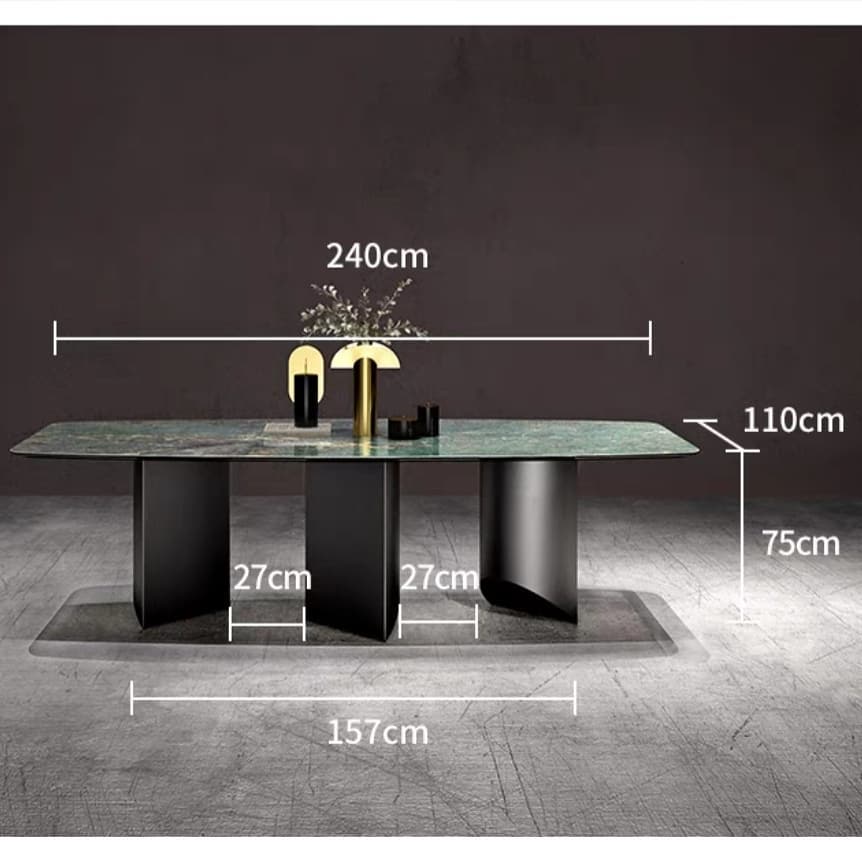 Роскошный обеденный стол со столешницей из спеченного камня – современного материла, твердость которого превышает твердость магматических пород. Очаровательный дизайн, комфорт, практичность и супер-долговечность. Отличное решение для современного уникального интерьера гостиной или кухонного острова.