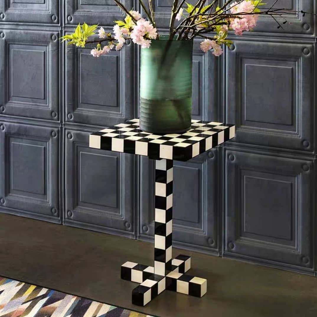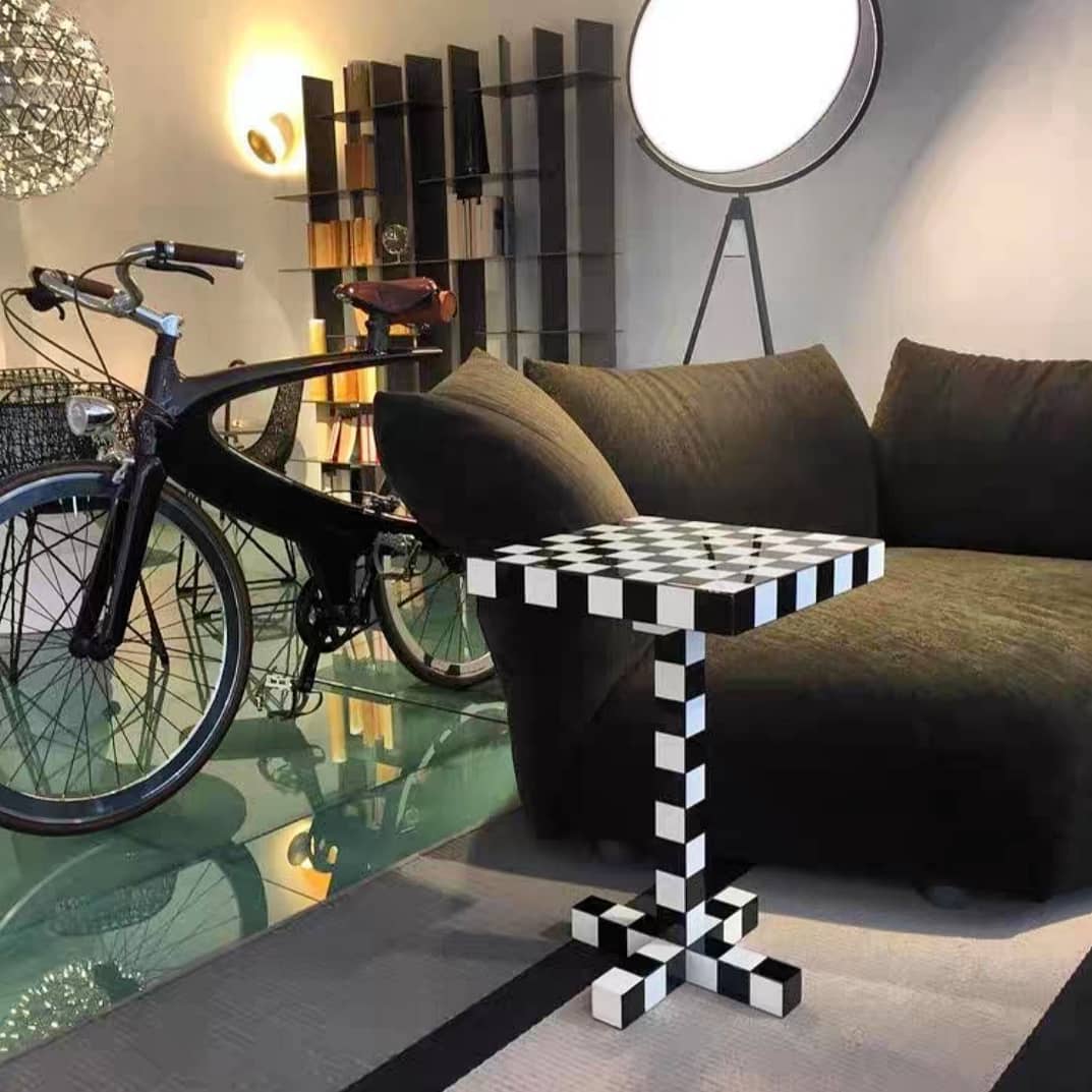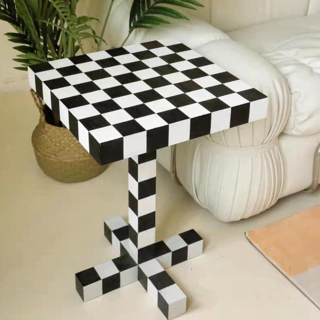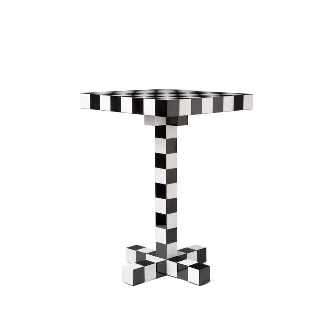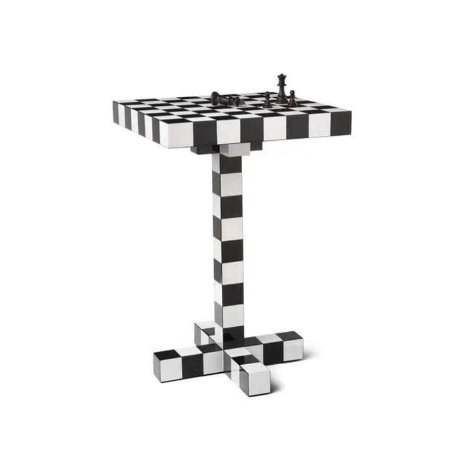 Полноценный черно-белый набор клеток на доске-столешнице. Ручная работа, массив дерева. Уже сейчас этот дизайнерский столик пользуется популярностью не только у любителей шахмат, но и у всех, кто ценит оригинальность интерьера, кто любит в нем яркие, неожиданные элементы.