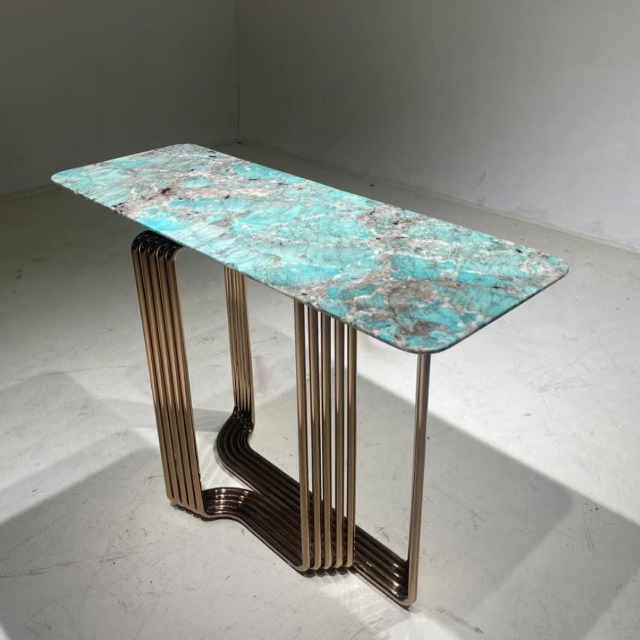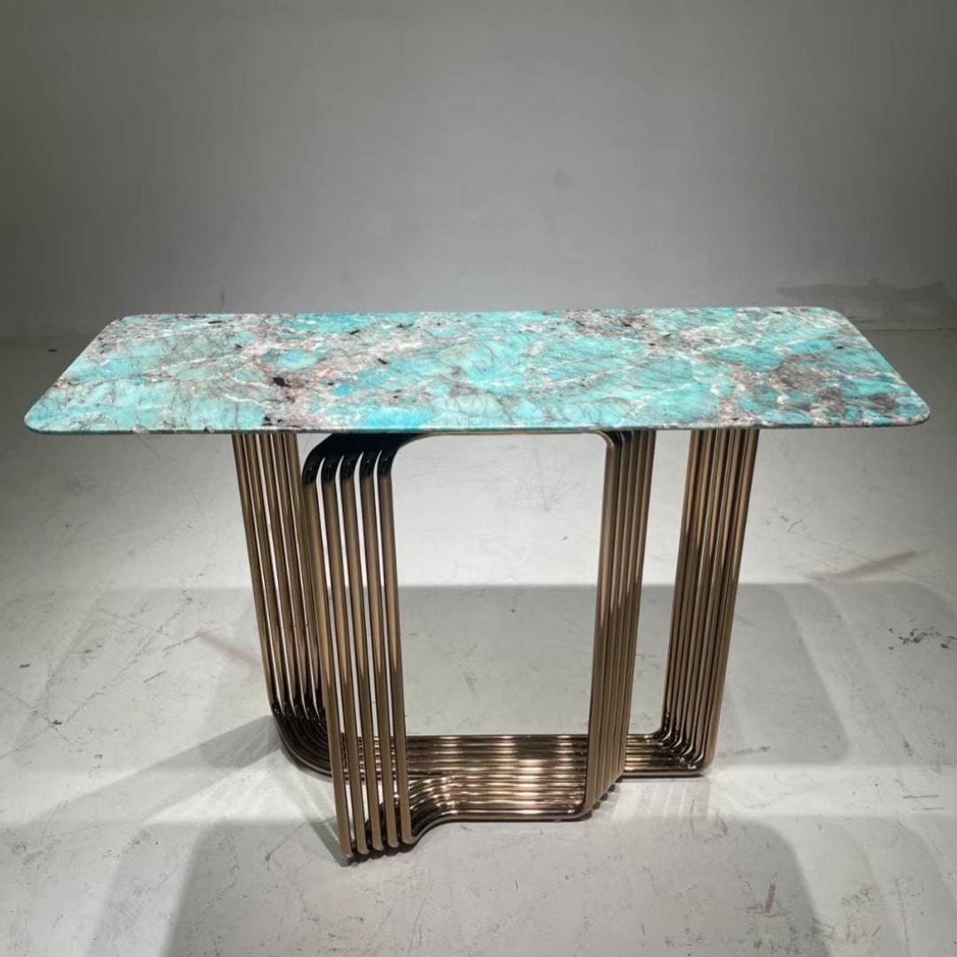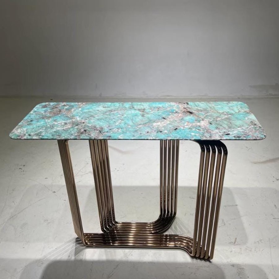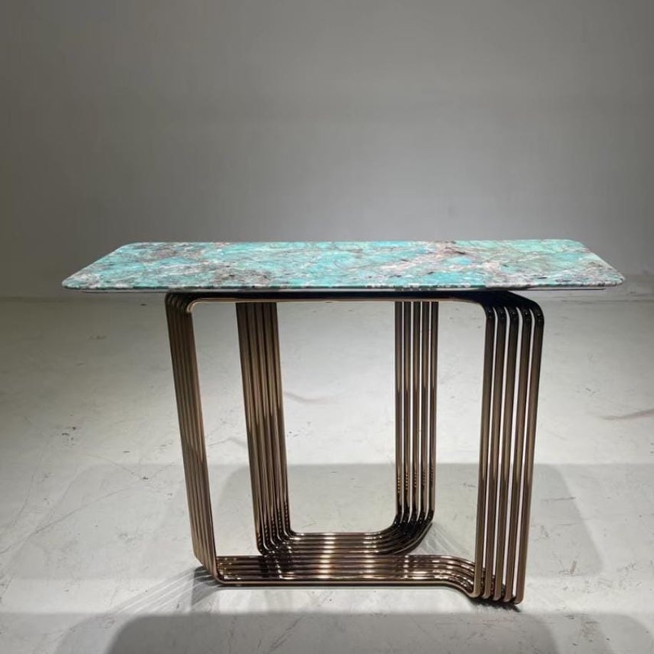 Роскошный консольный столик с бесподобной столешницей из натурального, отборного амазонита. Верный и яркий выбор для современного, уникального интерьера. Каждый столик – неповторим! Подстолье – нержавеющая сталь со специальным покрытием.