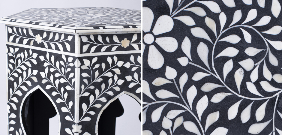 Табурет Inlaid Bone East, табурет ручной работы из массива дерева с роскошной инкрустацией из натуральной кости в виде стилизованных цветочков. Выполнен в в сочетании двух цветов: белого (кости) и черного.