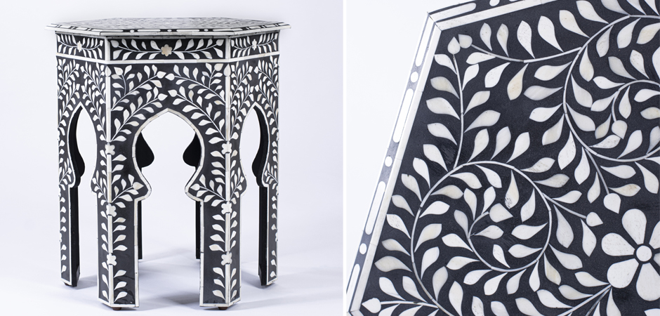 Характерным для данной мебельной серии является черно-белая цветовая гамма, обильное украшение ее поверхностей инкрустацией из натуральной кости, а также наличие флористических, либо этнических мотивов в орнаменте.