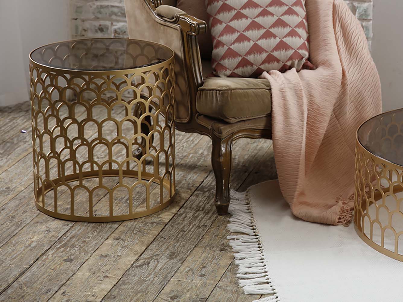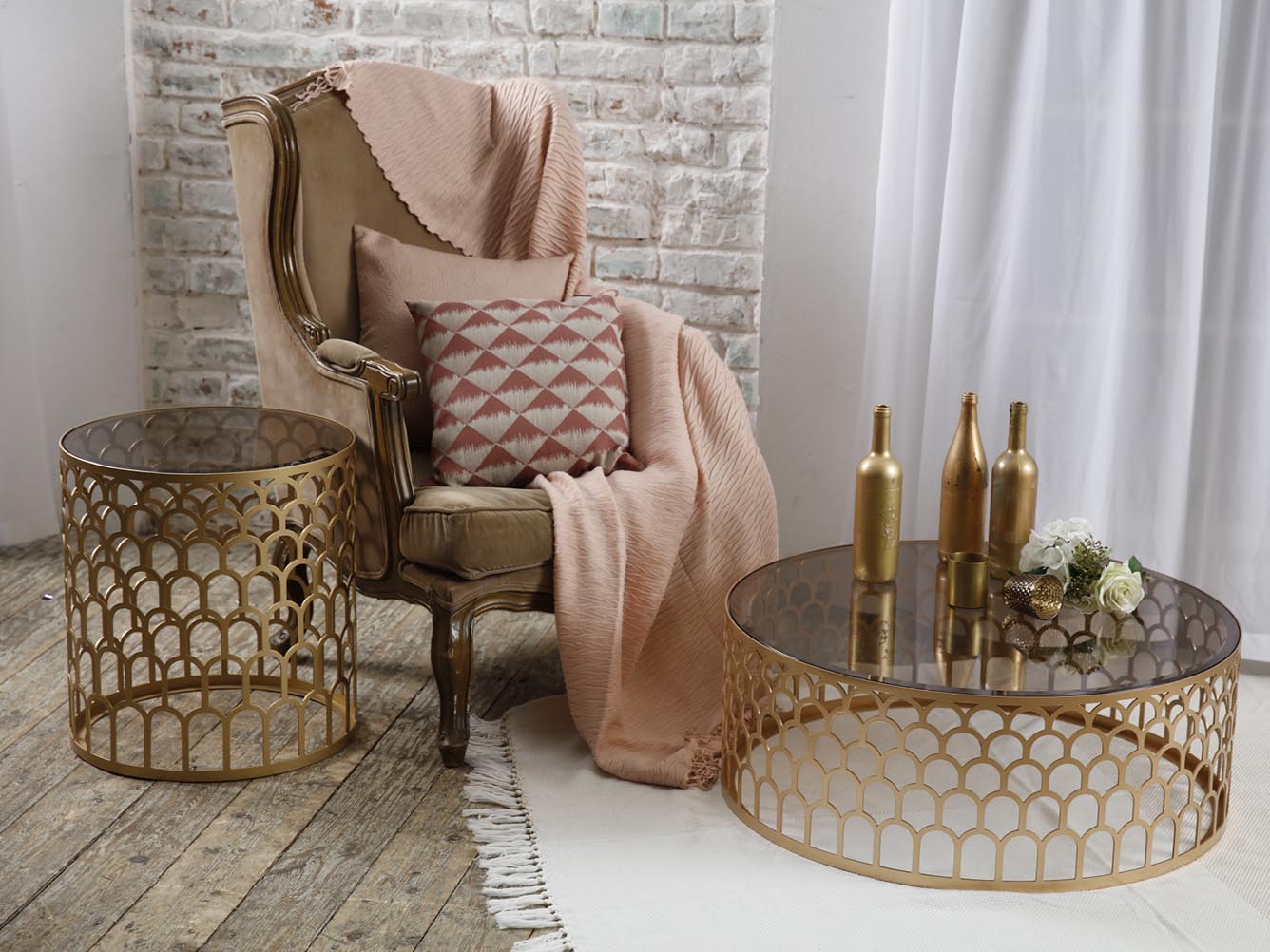 Золотое металлическое подстолье дизайнерского журнального столика АРМУР украшает столешница из высококачественного закаленного стекла. Столик идеально подойдет для гостиной или спальни, дополняя изяществом Ваш интерьер.