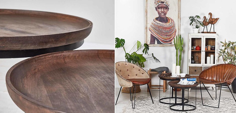 Стиль в сочетании с практичностью рождает поистине прекрасные предметы. Этот комплект кофейных столиков создан из металла и массива тика. Столешницы имеют уходящие вверх края, а это значит, что с этого столика точно ничего не упадет
