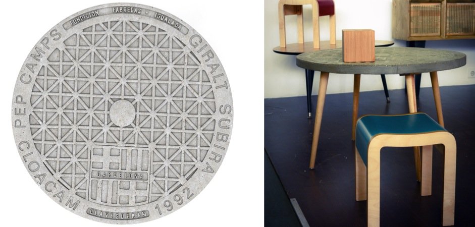 Концептуальный дизайнерский столик со столешницей из бетона на ножках из натуральной березы.