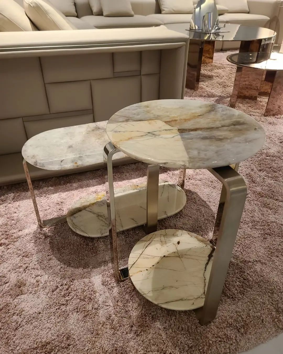 Шикарная линейка приставных столиков. Яркое решение для современного стильного интерьера. Столешницы из отборного кварцита Патагония, подстолье – нержавеющая сталь с отделкой на выбор.