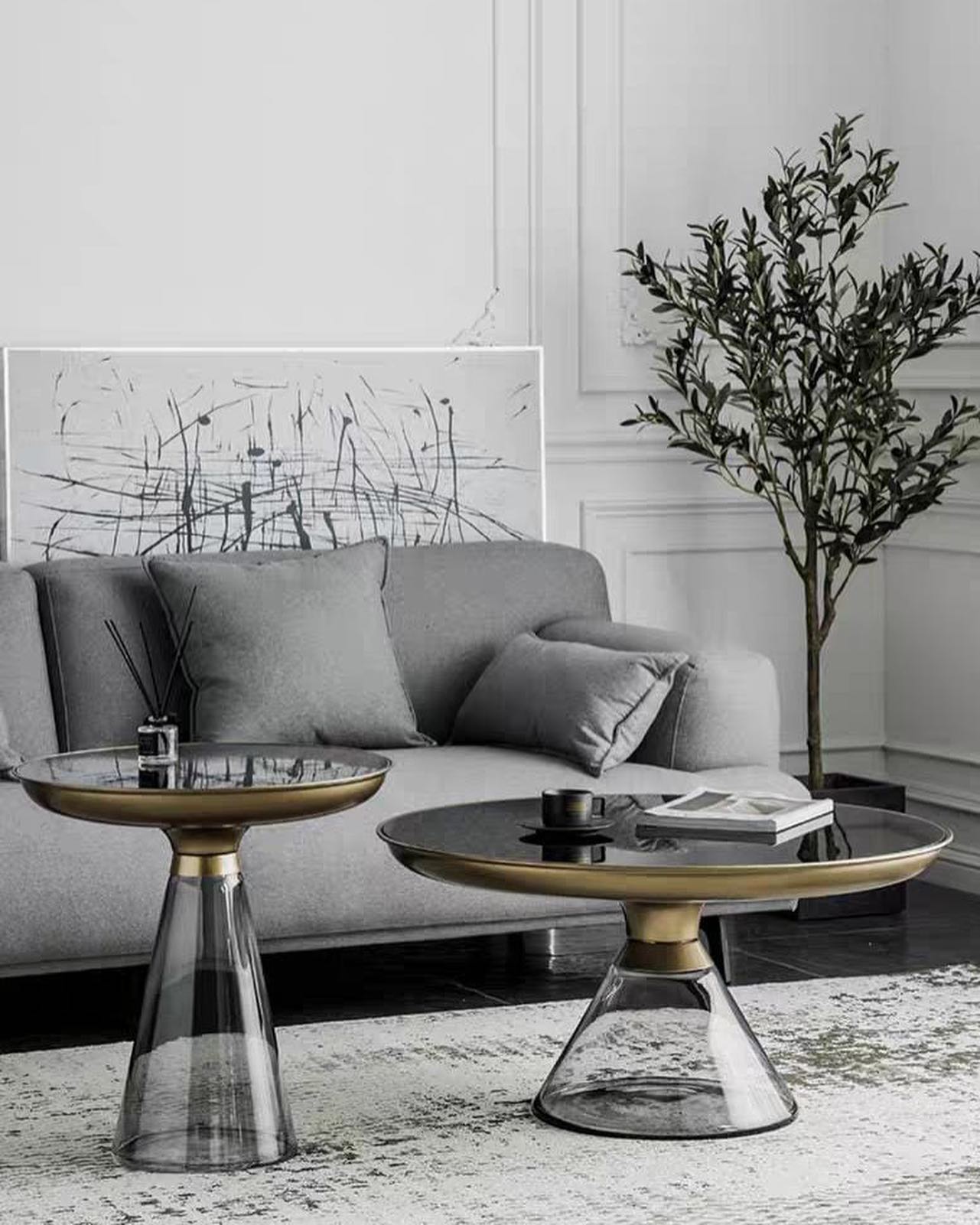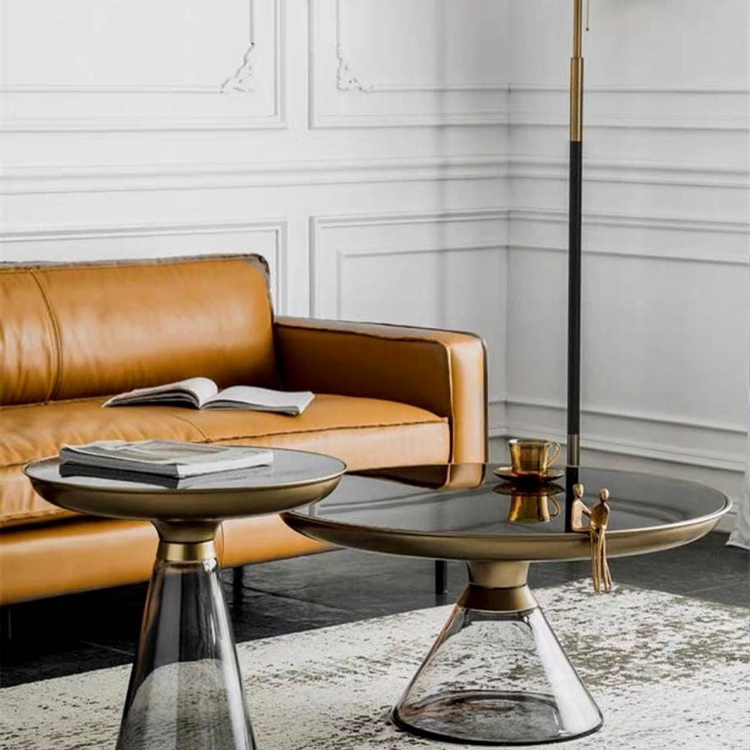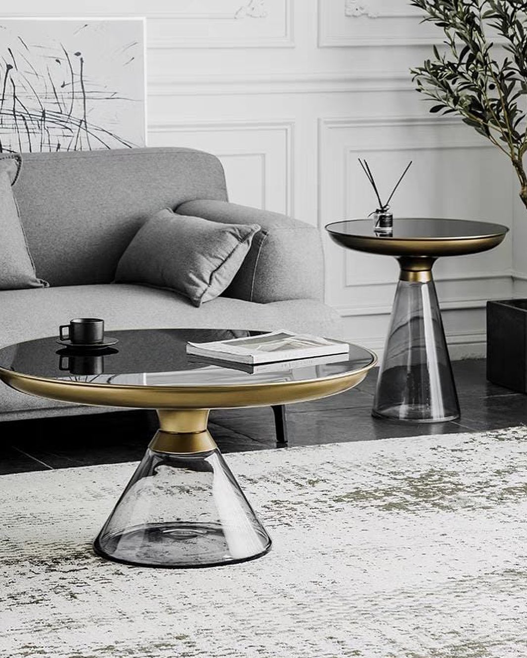 Изящные дизайнерские приставные/журнальные столики Monsterior Shop. Стильное и яркое решение для современной гостиной. Латунь, закалённое, супер-прочное стекло.
