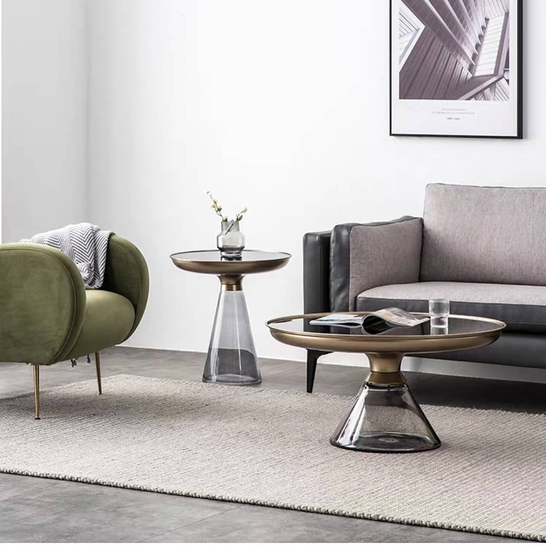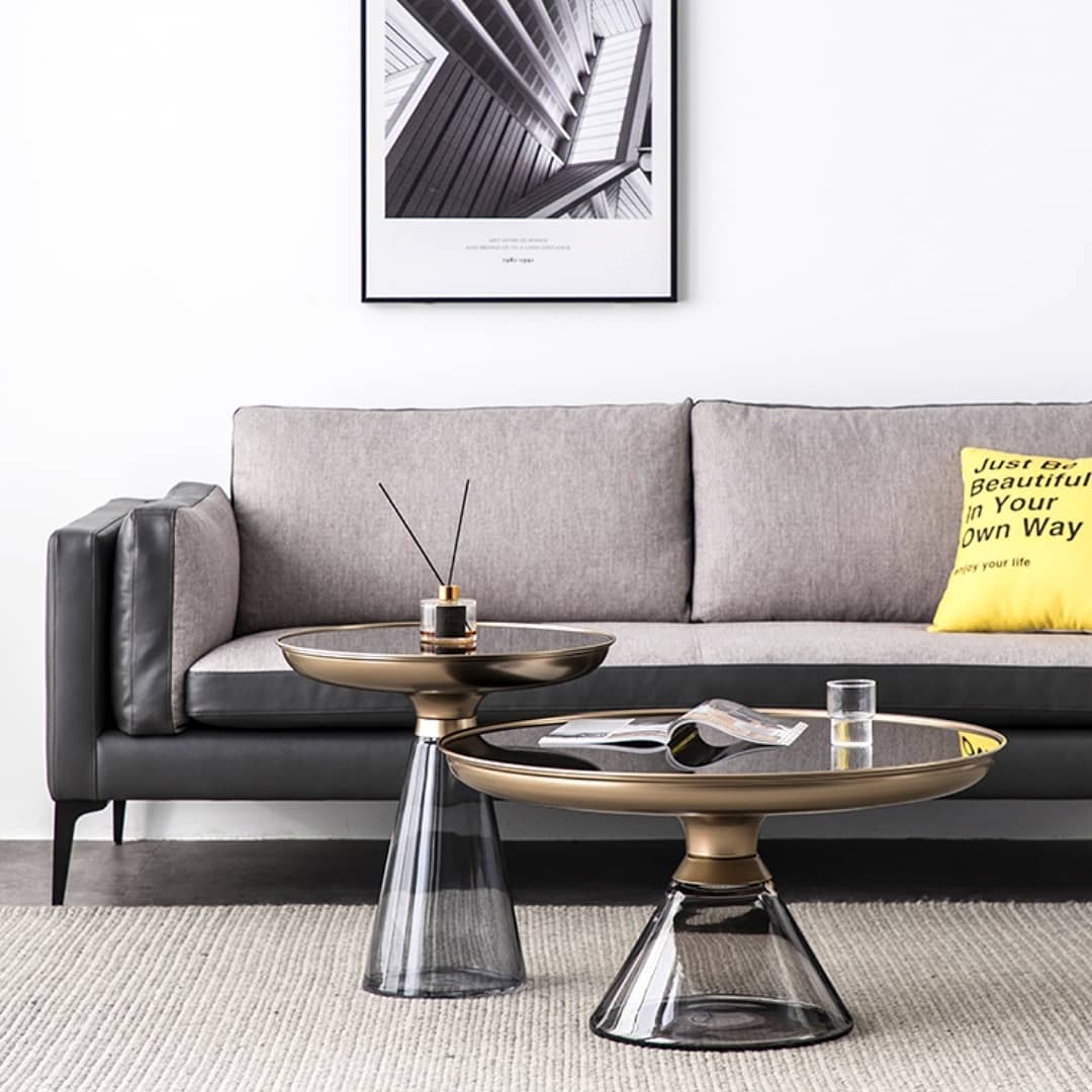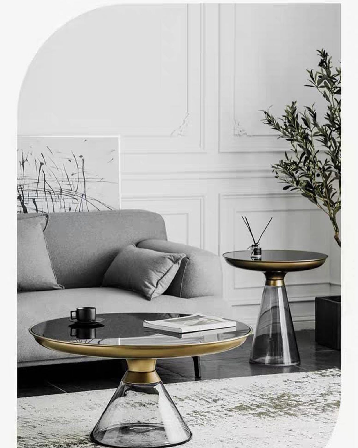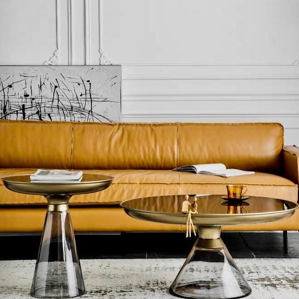 Изящные дизайнерские приставные/журнальные столики Monsterior Shop. Стильное и яркое решение для современной гостиной. Латунь, закалённое, супер-прочное стекло.