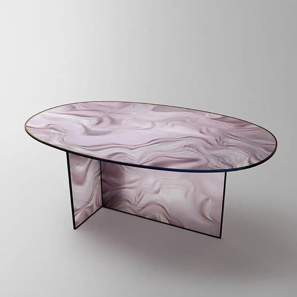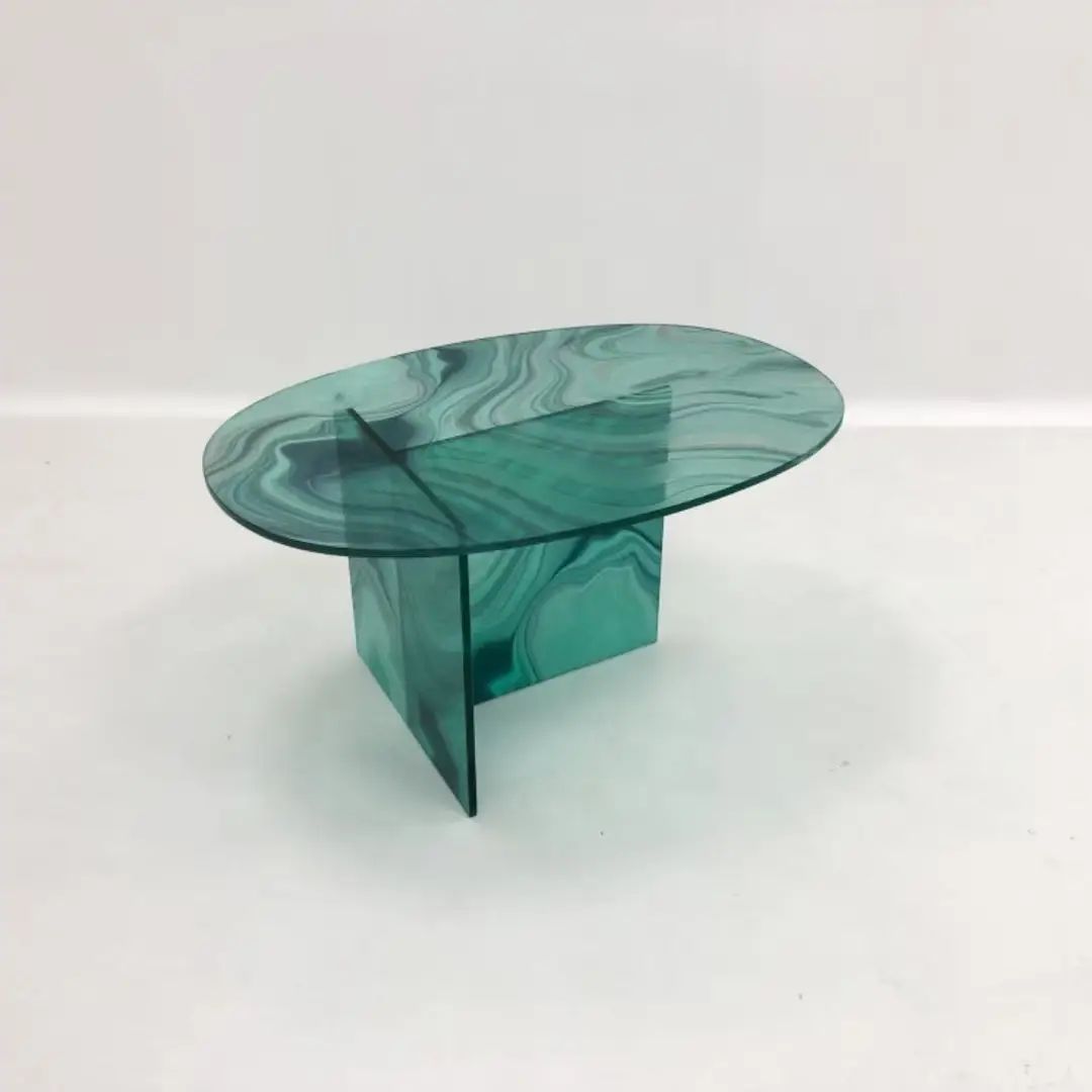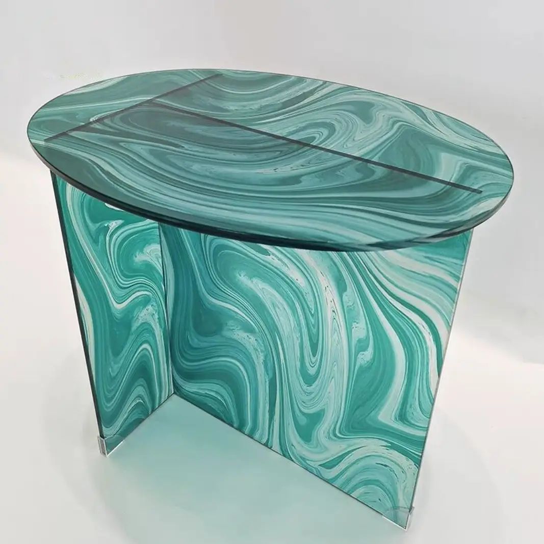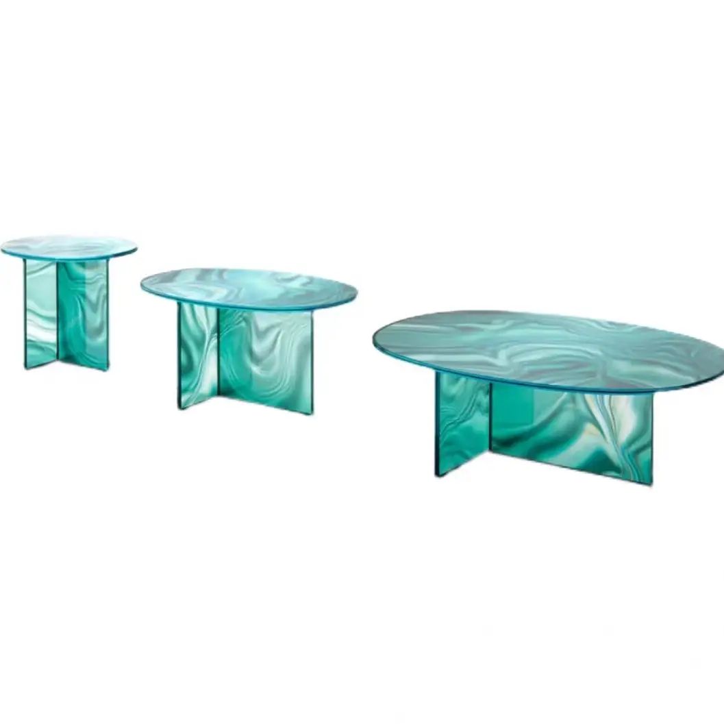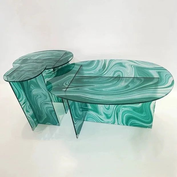 Очаровательное трио дизайнерских приставных/столиков. Чистейшее калёное стекло, ручная работа. Отличное решение для стильного современного интерьера гостиной, спальни, студии, лаунж-зоны и т.д. Можно приобрести столики вместе, а можно по отдельности. Два прекрасных цвета – морская волна и сиреневый, на выбор.