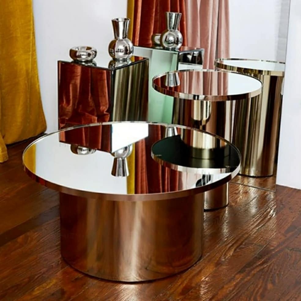 Роскошные приставные (журнальные) столики, в которых прекрасно и оригинально – всё! Отличное решение в стиле модерна, классная единая концепция – столики так похожи на две башни, одна из которых вытянулась вверх, а другая – вширь. И вместе или порознь, но они моментально добавят позитивной яркости в ваши гостиные и (или) спальни. А ещё в них можно смотреться, ведь это не просто столики, а столики-зеркала. И даже в одиночестве посидеть пятничным вечером за таким столиком – прикольно и необычно. Словно общаешься со своим двойником из Зазеркалья.