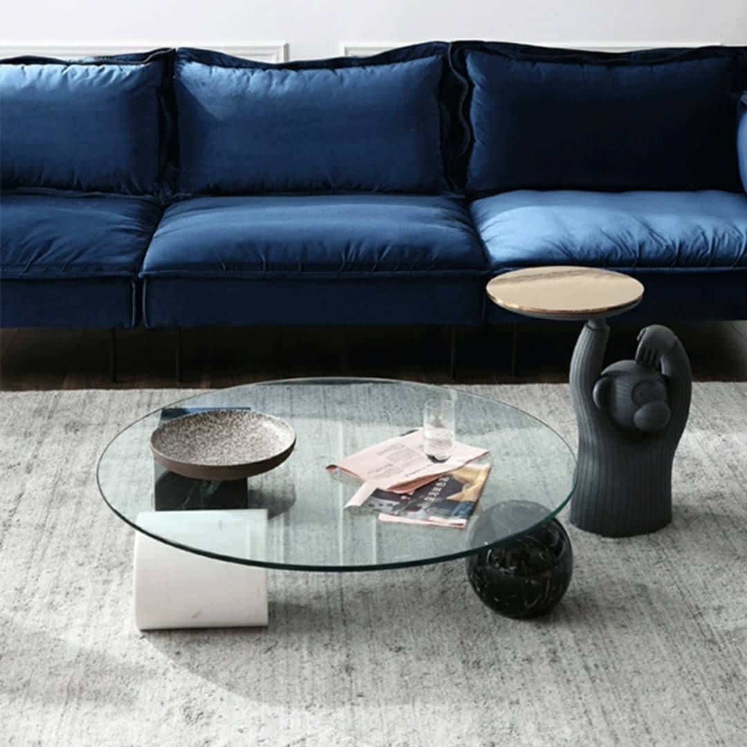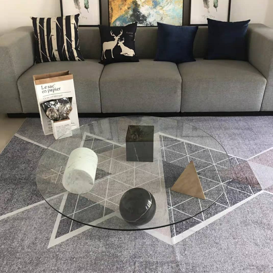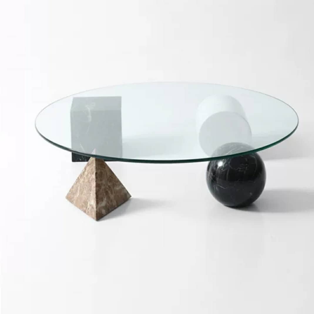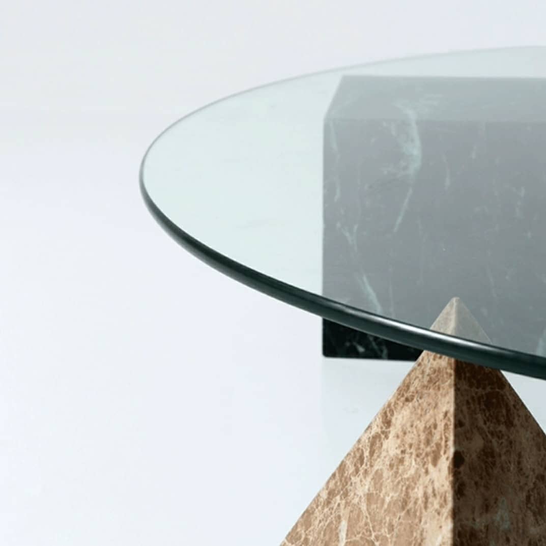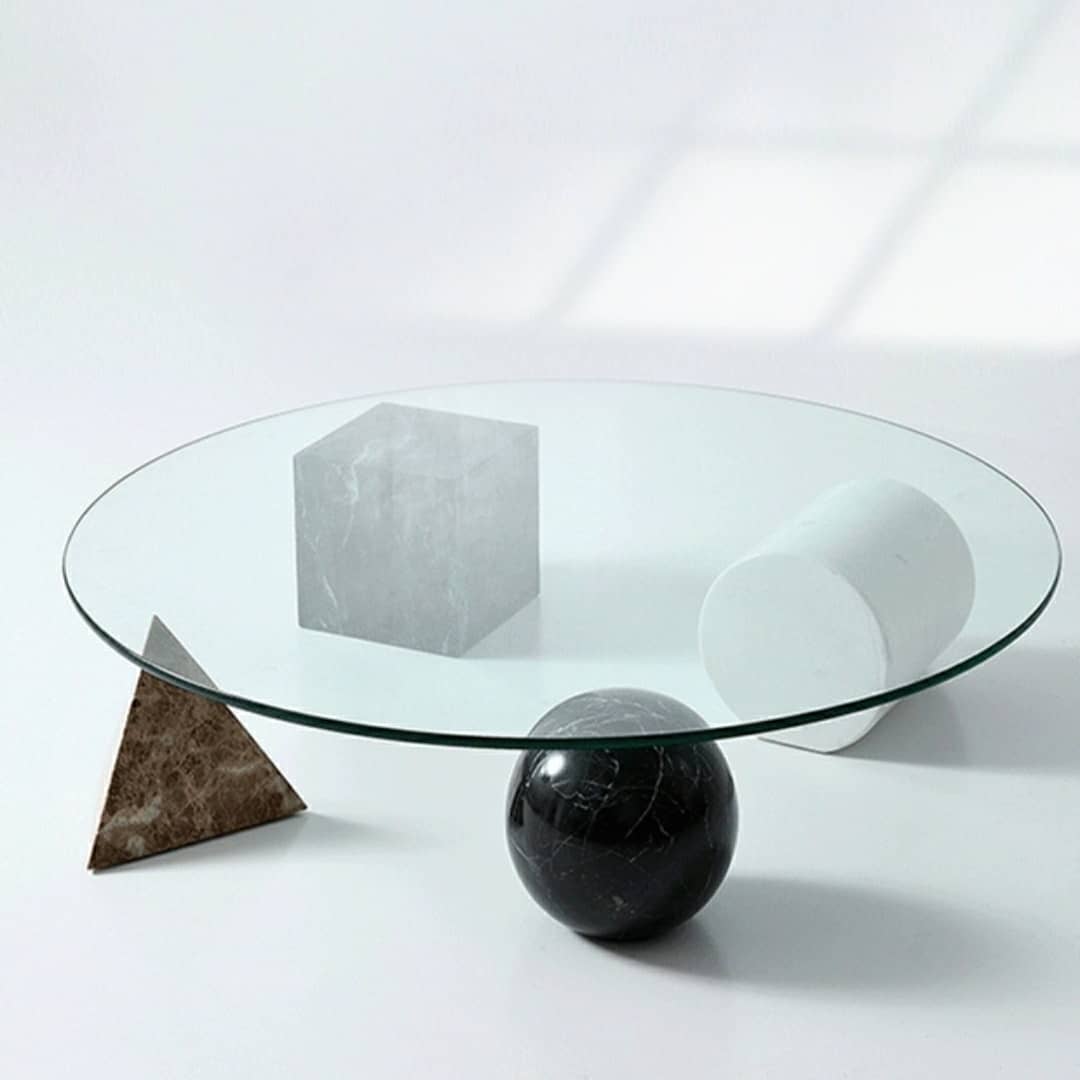 Настоящая уникальная вещь! Очень оригинальный приставной столик, изготовленный из двух материалов – закаленного стекла и различных пород натурального, отборного мрамора. Два вида столешниц – квадратной и круглой формы, на выбор. Геометрическое подстолье в виде четырех совершенных классических фигур: шара, куба, пирамиды и цилиндра.