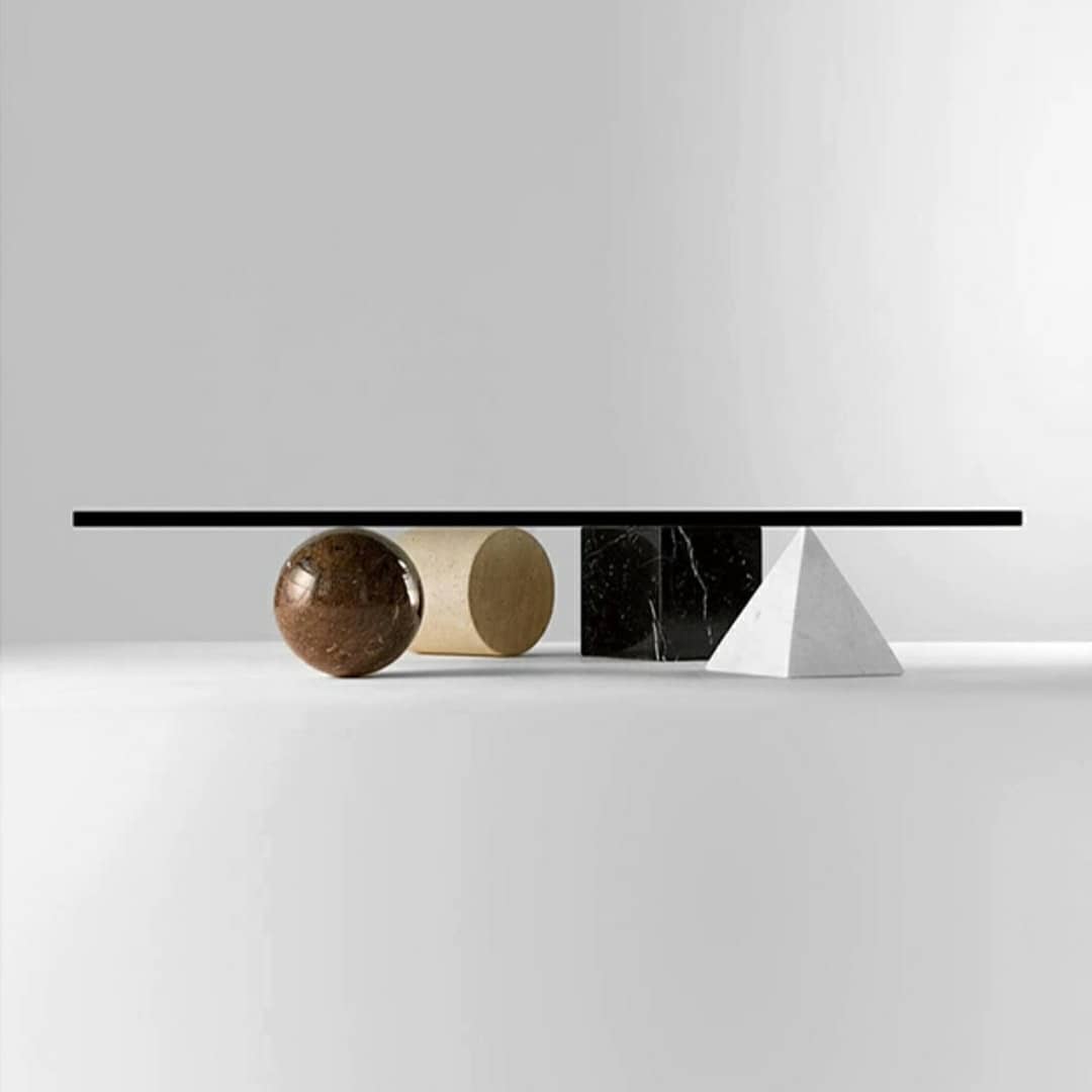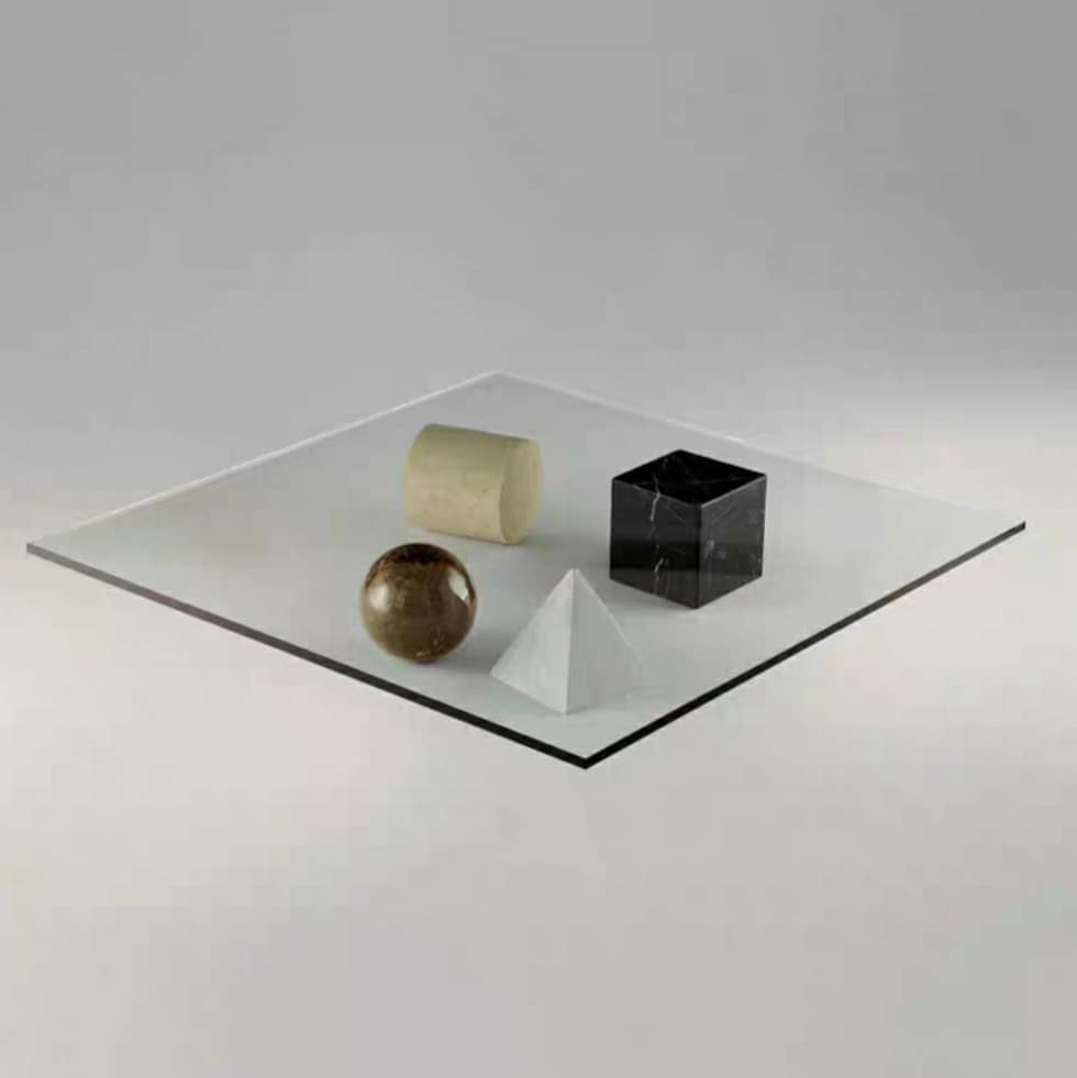 Настоящая уникальная вещь! Очень оригинальный приставной столик, изготовленный из двух материалов – закаленного стекла и различных пород натурального, отборного мрамора. Два вида столешниц – квадратной и круглой формы, на выбор. Геометрическое подстолье в виде четырех совершенных классических фигур: шара, куба, пирамиды и цилиндра.