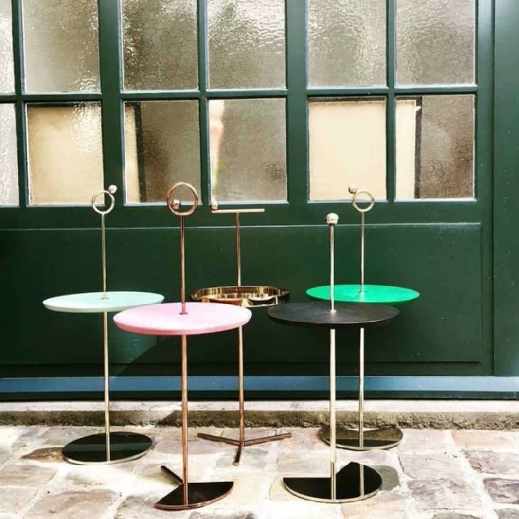 Есть столик со стеклянной столешницей, а есть столики с разноцветными столешницами из дерева, очень похожими на печеньки маракуны.