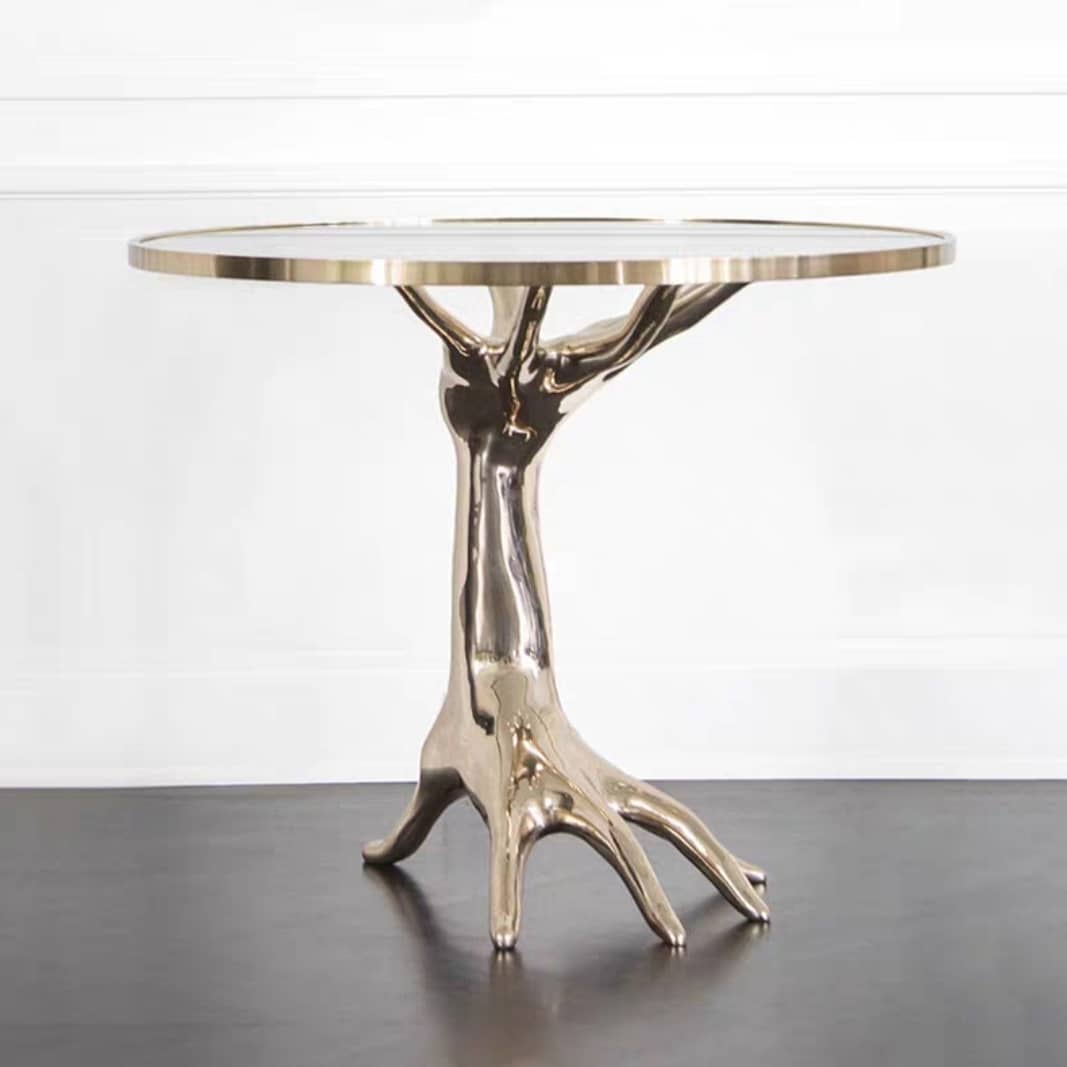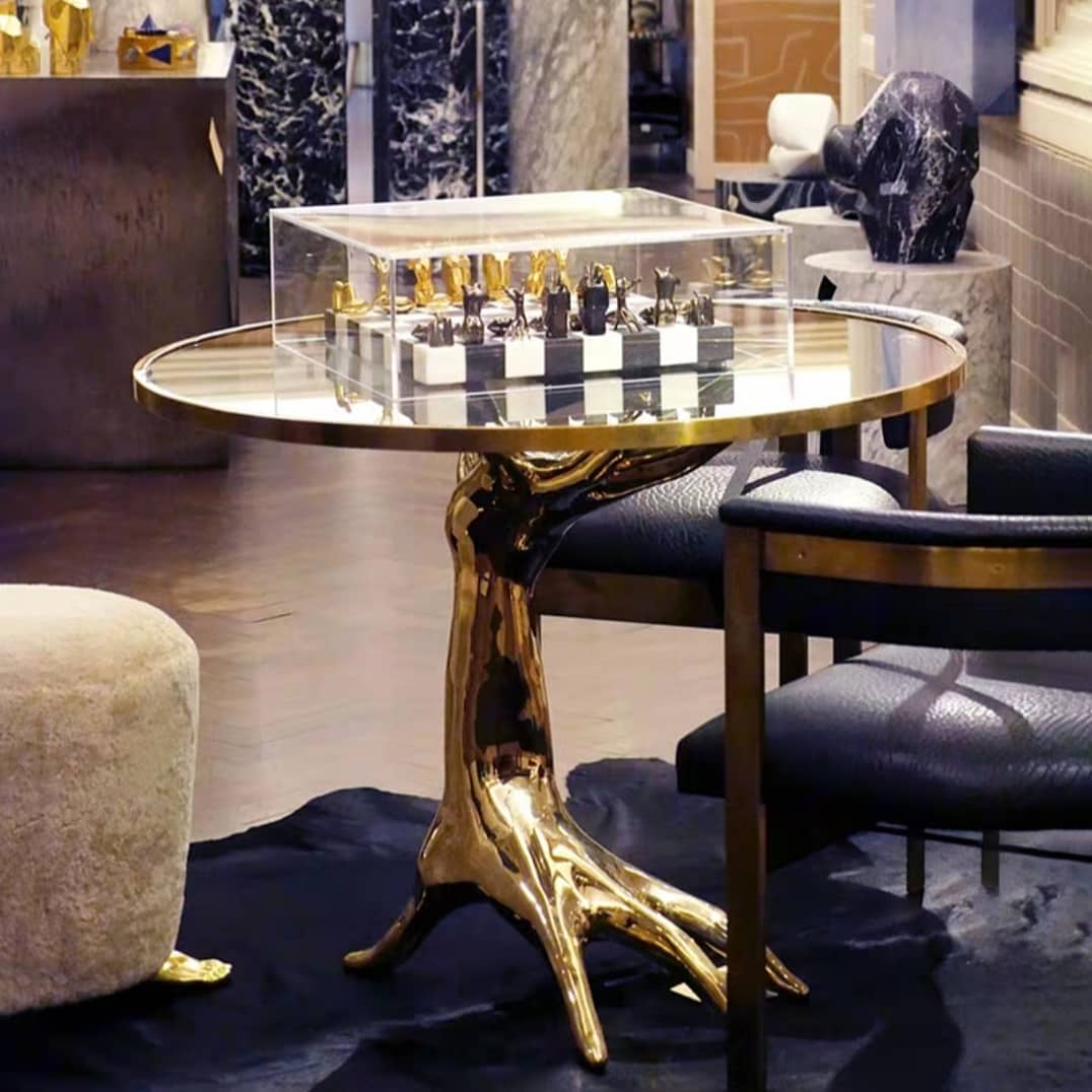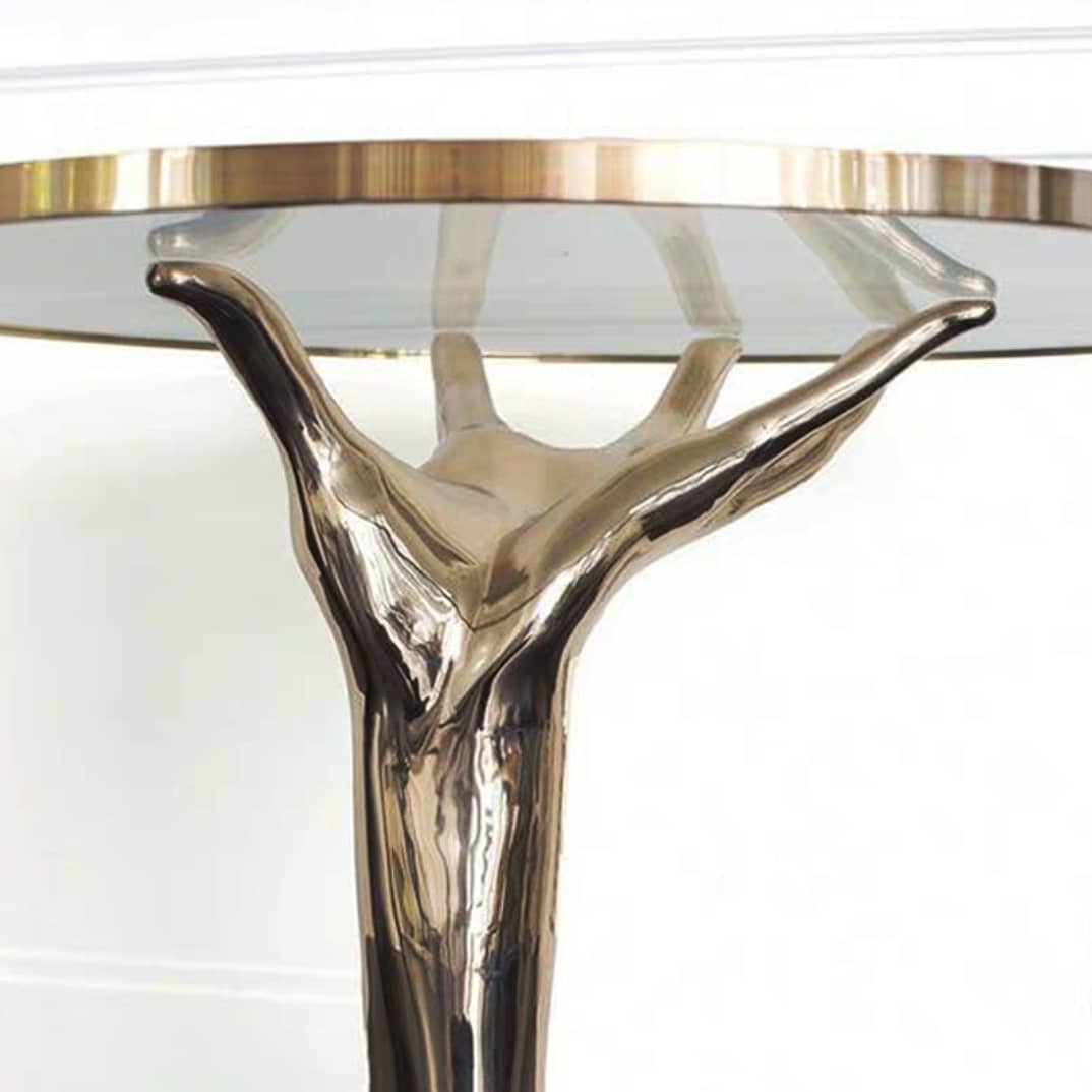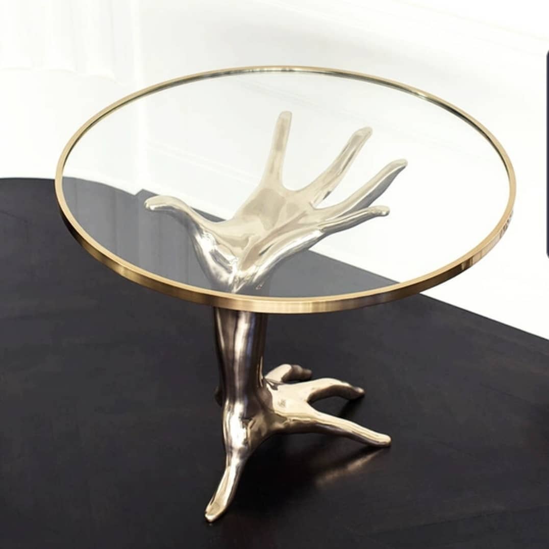 Стекло, латунь, дизайнерская фантазия, и ещё один столик становится похожим на произведение современного искусства, а может даже и является им. Для тех, кто хочет добавить в интерьер оригинальности, яркости и необычности.