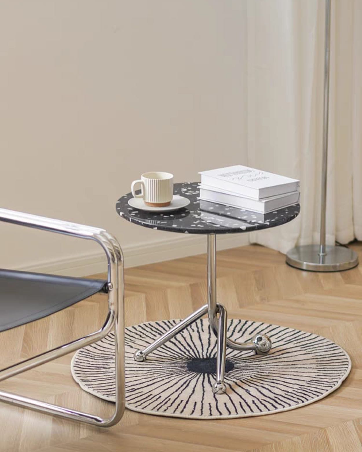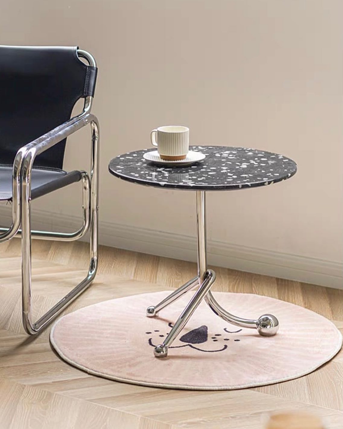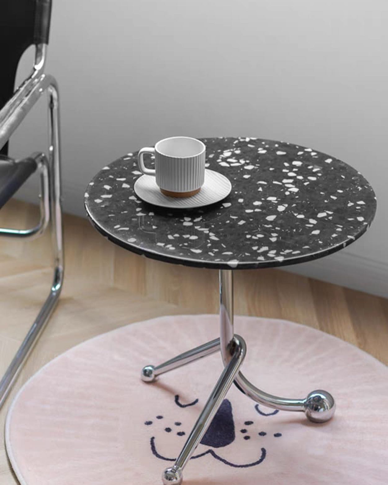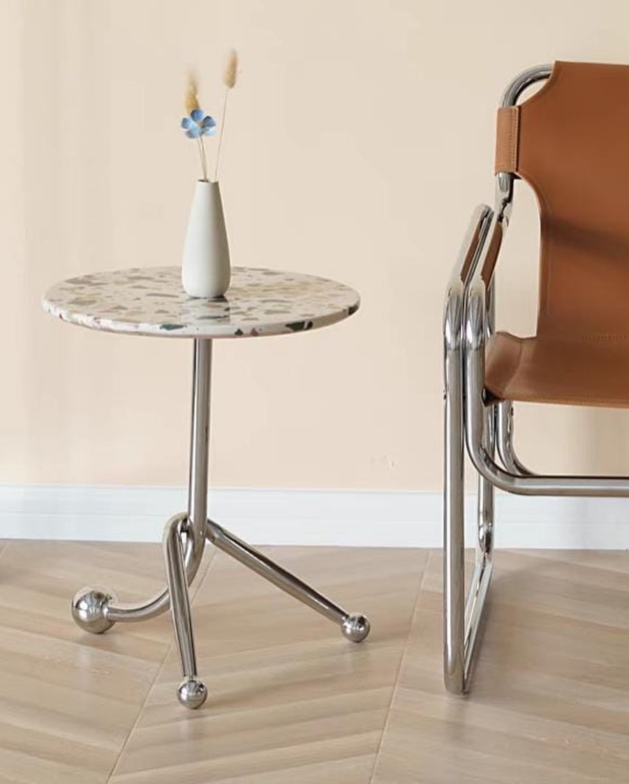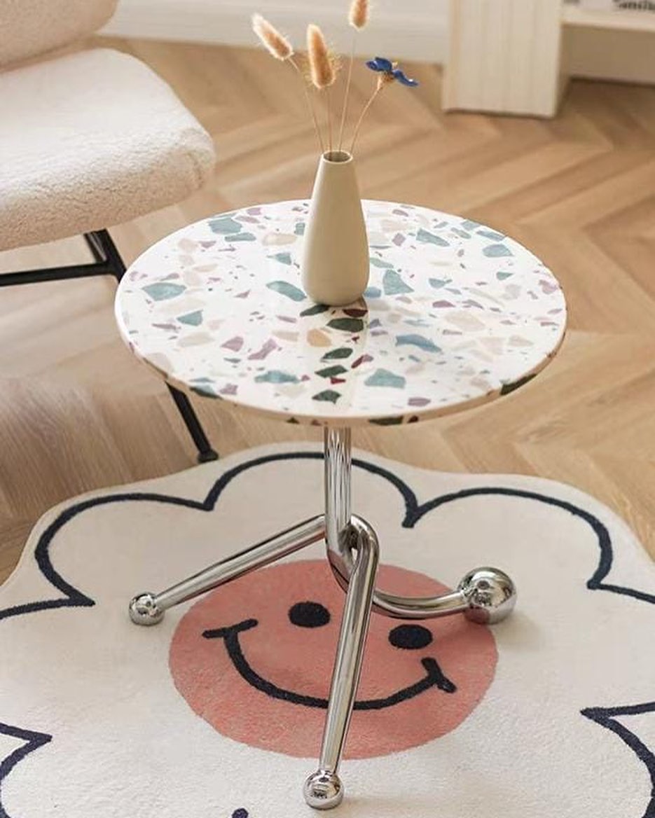 Стильные приставные дизайнерские столики Monsterior Shop. Очаровательная столешница из терраццо, подстолье – нержавеющая сталь. Премиум-качество. Отличное решение для современного интерьера гостиной или спальни.