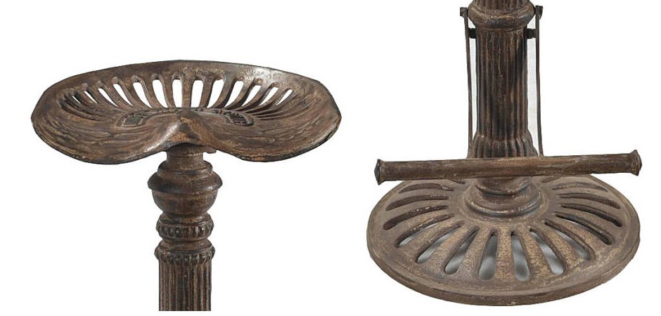 Тяжелый барный табурет из чугуна. Ножка стула напоминает фигурную колонну уличного фонаря, сидение имеет удобно изогнутую форму, которая не дает соскользнуть с табурета. Ногам на таком табурете тоже будет удобно - подножка-перекладина позволит расположить их с комфортом. Дизайн модели одинаково хорошо подойдет как эклектичным и классическим интерьерам, так и модному лофту.
