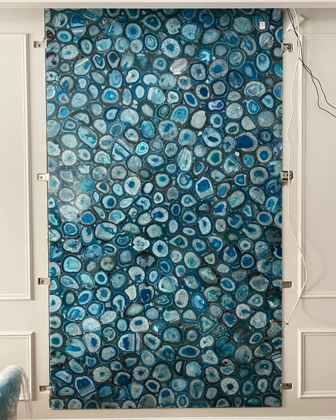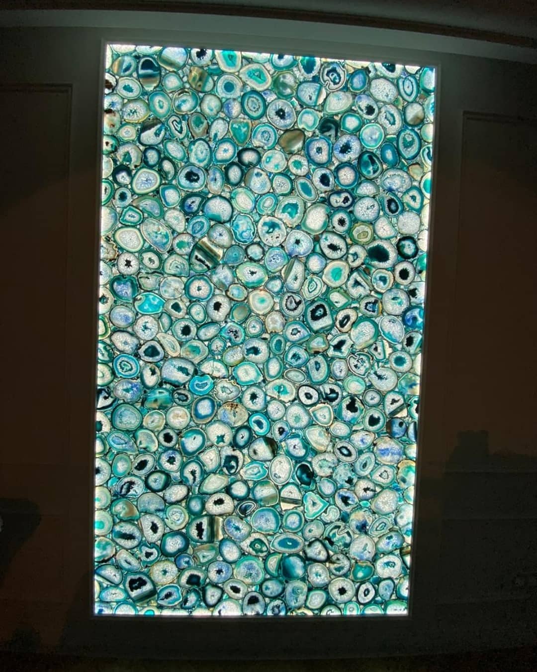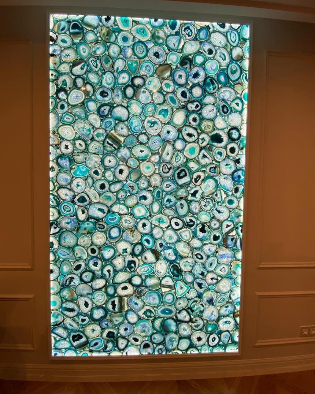 Роскошный слэб из голубого агата, созданный по заказу для украшения интерьера загородного дома. Потрясающая подсветка усиливает очарование – в темноте эта красота превращается в яркий «портал», сравнимый по эмоциональному воздействию с отдыхом на берегу теплого лазурного моря.