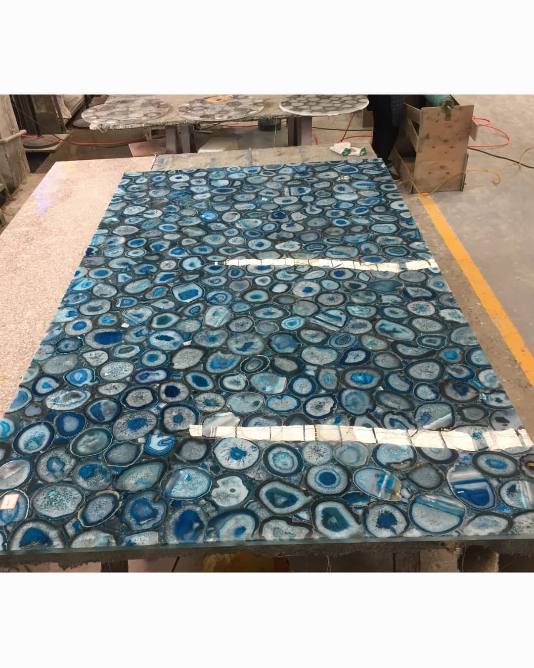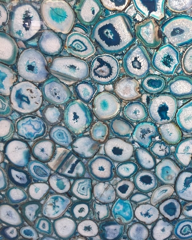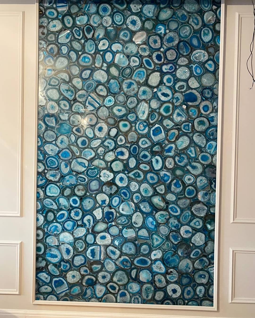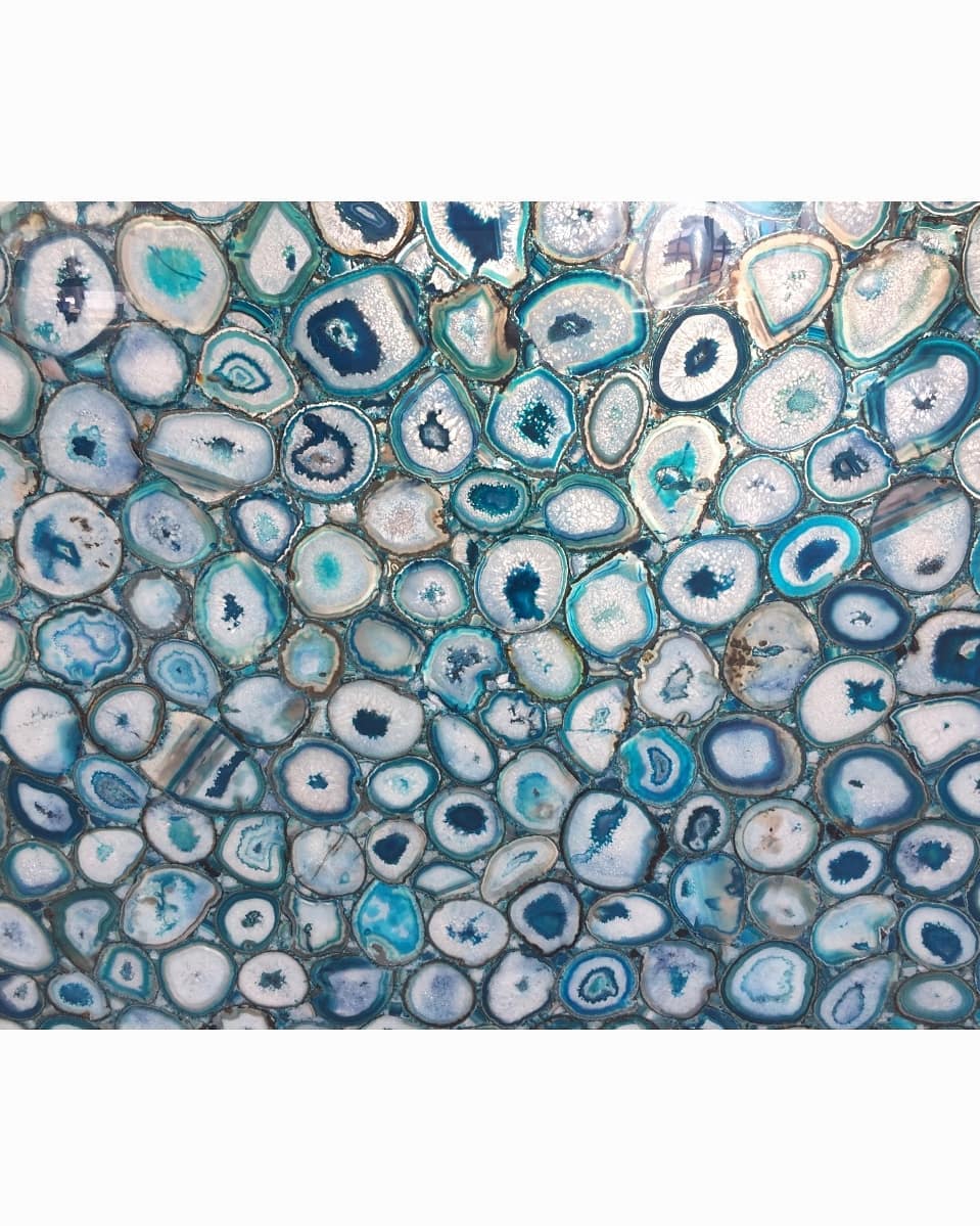 Роскошный слэб из голубого агата, созданный по заказу для украшения интерьера загородного дома. Потрясающая подсветка усиливает очарование – в темноте эта красота превращается в яркий «портал», сравнимый по эмоциональному воздействию с отдыхом на берегу теплого лазурного моря.