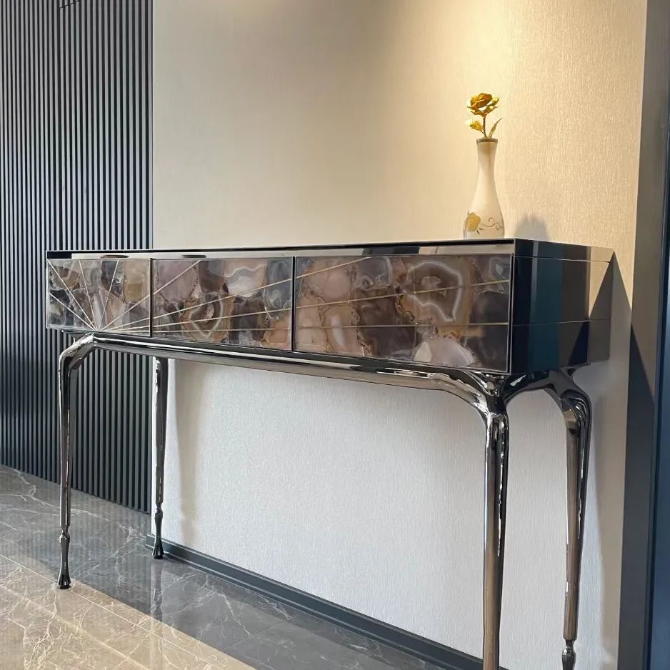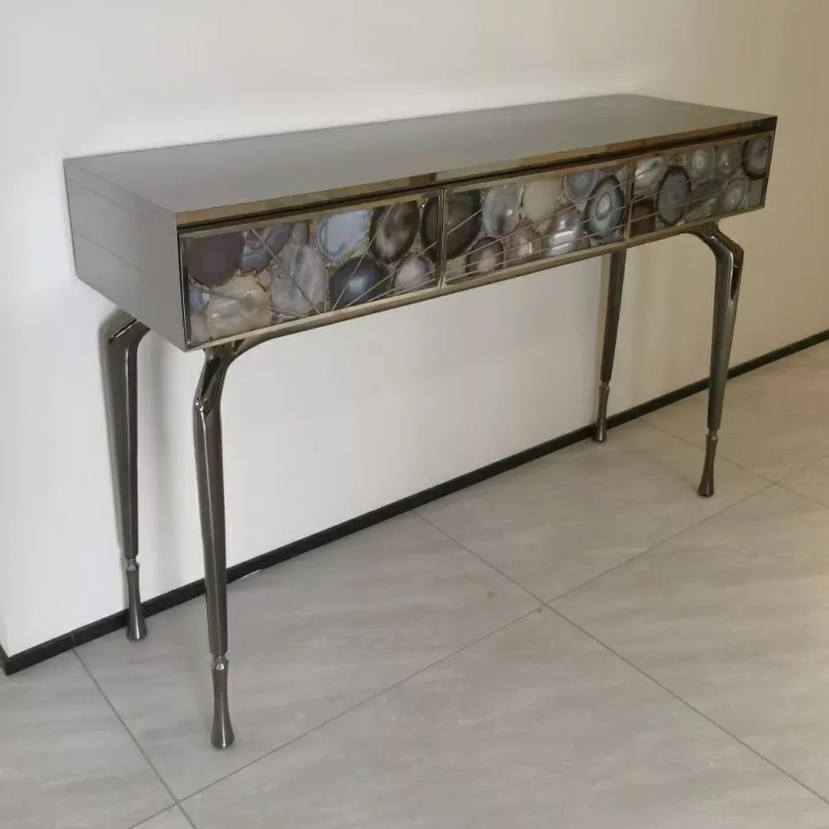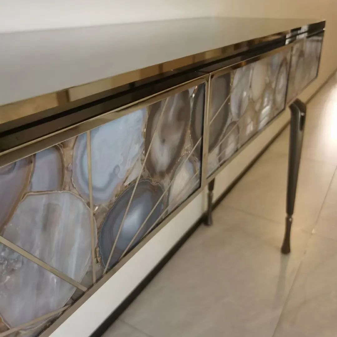 Роскошная и изящная консоль Monsterior Gems, как изысканное решение для современного, статусного интерьера. Различные виды отделки и полудрагоценных камней, на заказ. На фото – фасад из отборного агата, по вашему желанию мы изготовим консоль с малахитом, тигровым глазом и т.д. Станьте соавторами красоты, которая идеально впишется в ваше личное пространство!