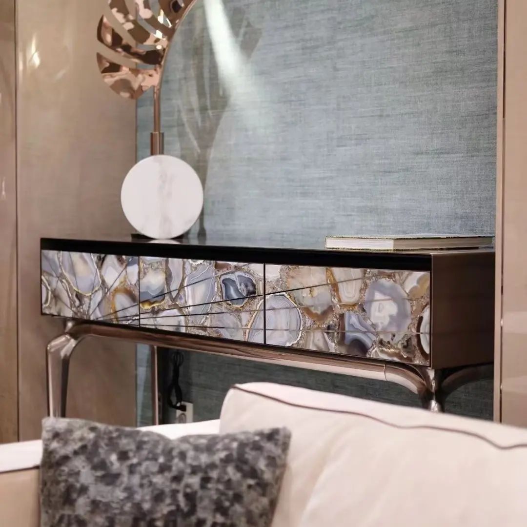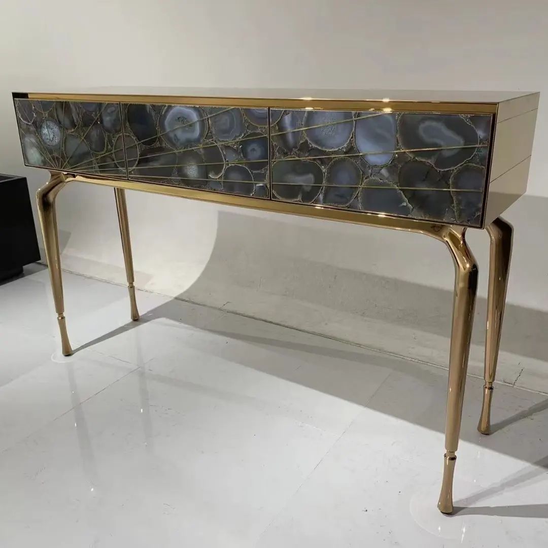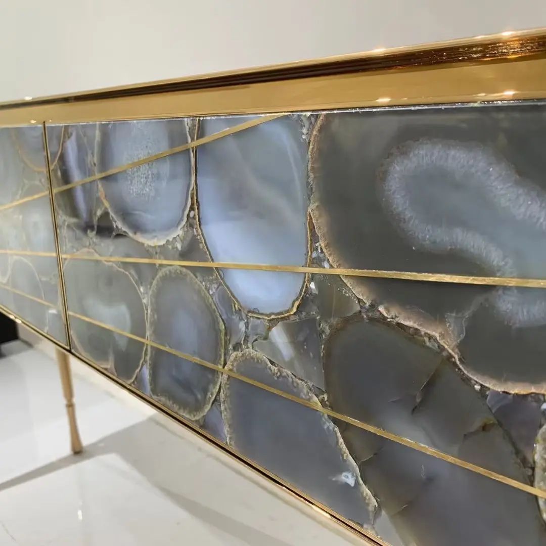 Роскошная и изящная консоль Monsterior Gems, как изысканное решение для современного, статусного интерьера. Различные виды отделки и полудрагоценных камней, на заказ. На фото – фасад из отборного агата, по вашему желанию мы изготовим консоль с малахитом, тигровым глазом и т.д. Станьте соавторами красоты, которая идеально впишется в ваше личное пространство!