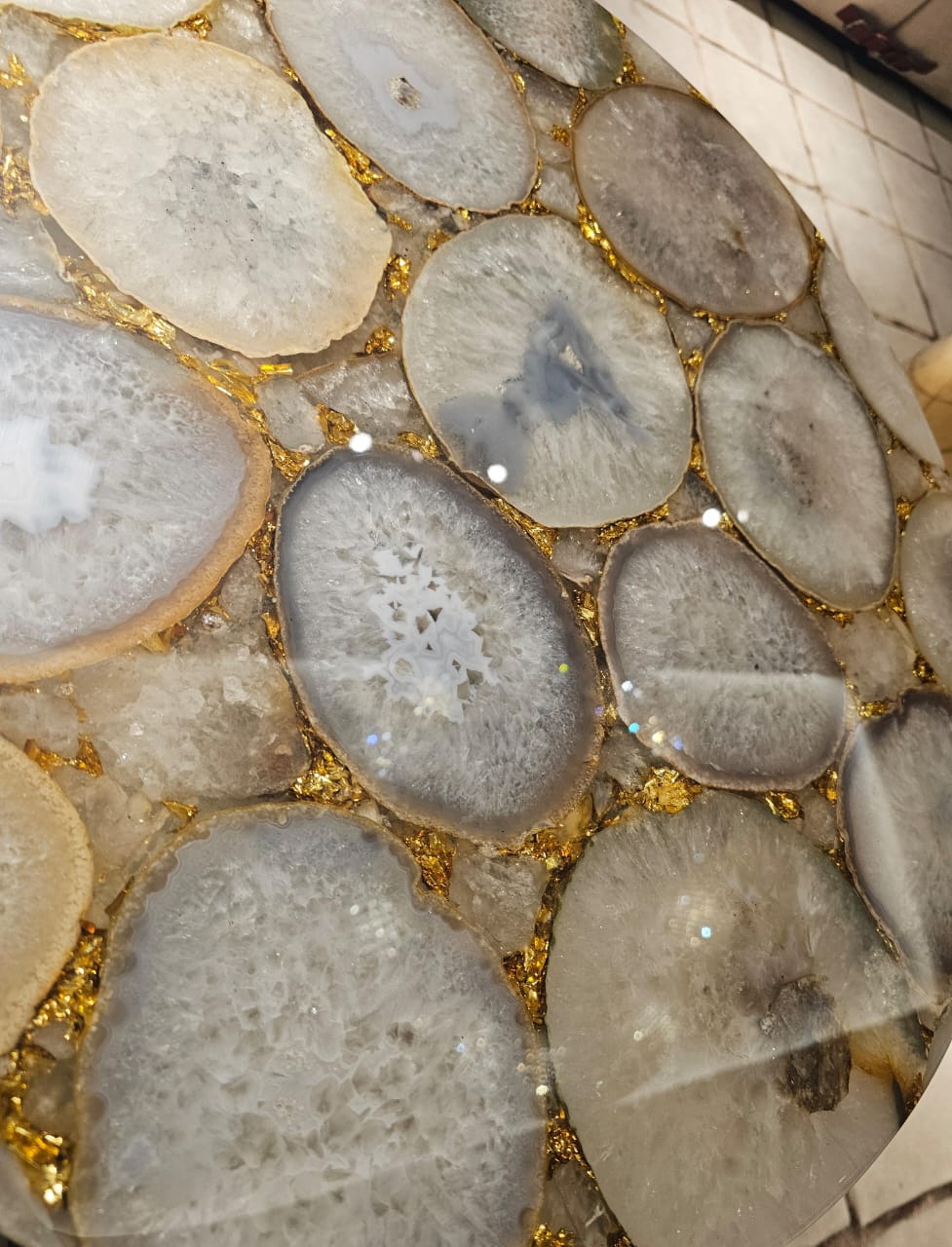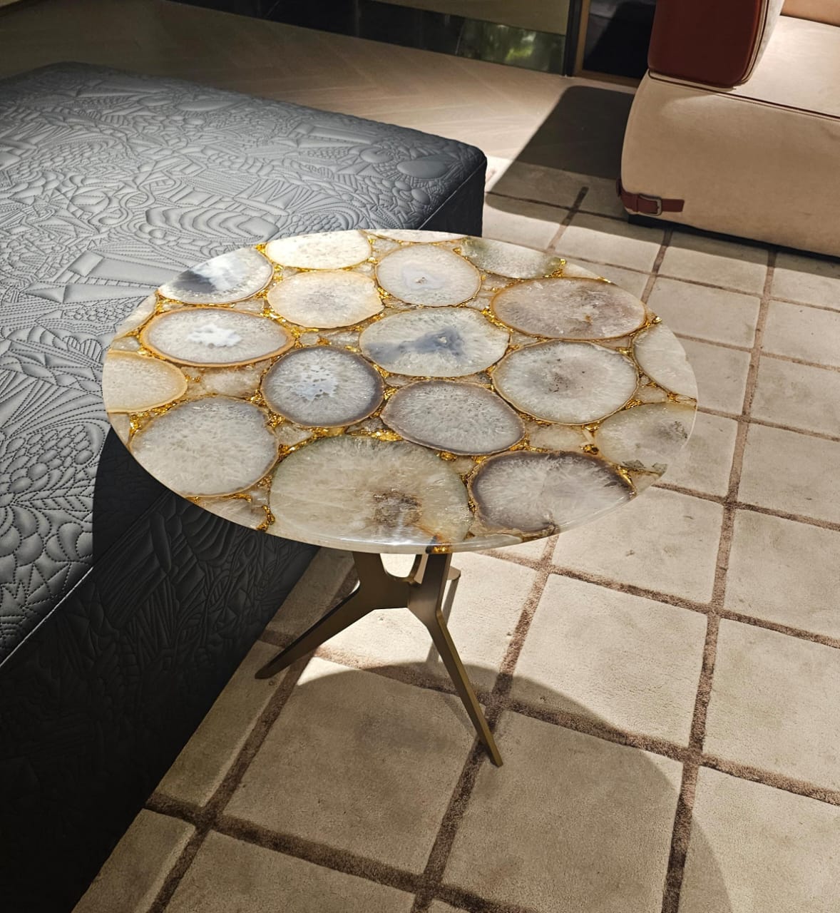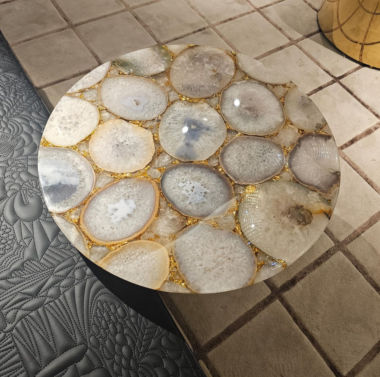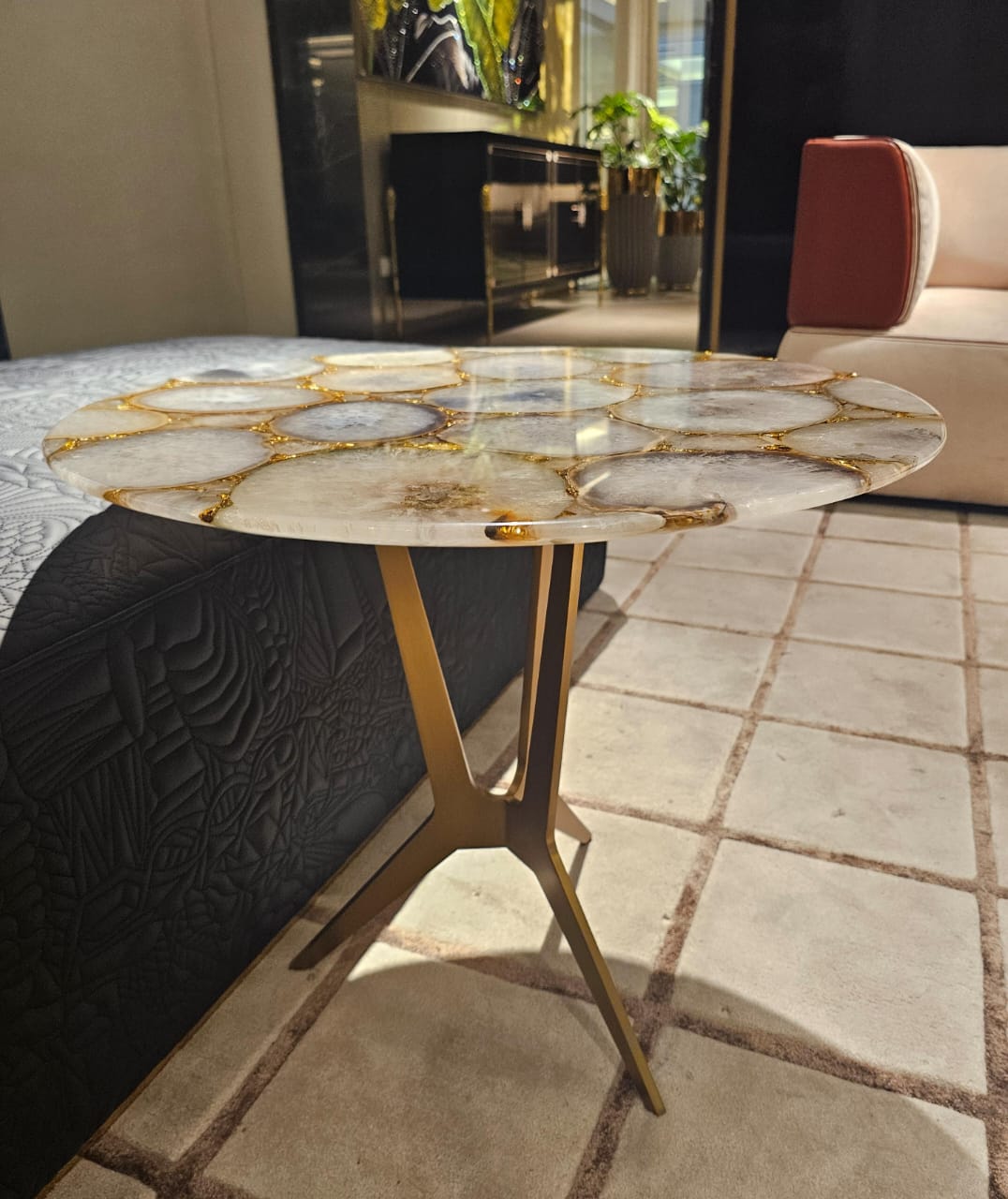 Изящный приставной/журнальный столик Monsterior Gems. Каждый – уникален и неповторим, как неповторимы срезы отборного агата с самых лучших бразильских месторождений. Стильный дизайн. Подстолье – благородная латунь и сусальное золото. Шикарное решение для украшения современной статусной гостиной или спальни.