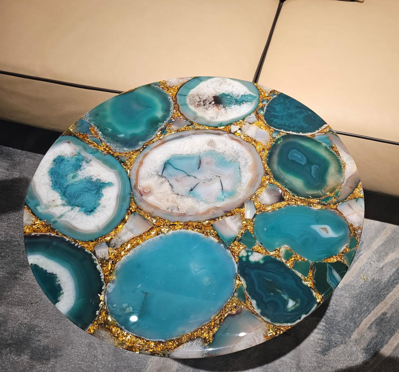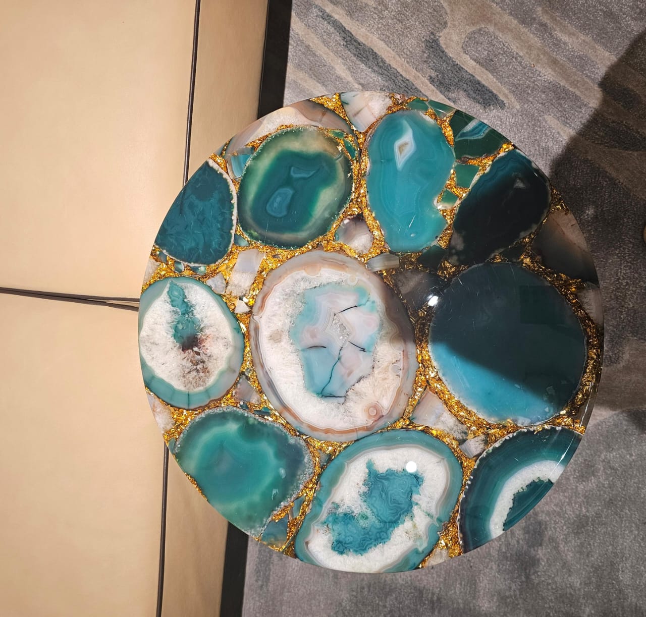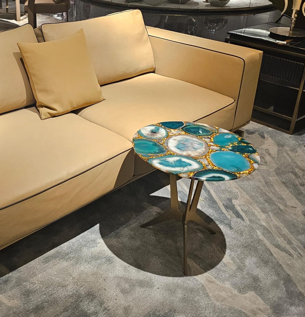 Изящный приставной/журнальный столик Monsterior Gems. Каждый – уникален и неповторим, как неповторимы срезы отборного агата с самых лучших бразильских месторождений. Стильный дизайн. Подстолье – благородная латунь и сусальное золото. Шикарное решение для украшения современной статусной гостиной или спальни.