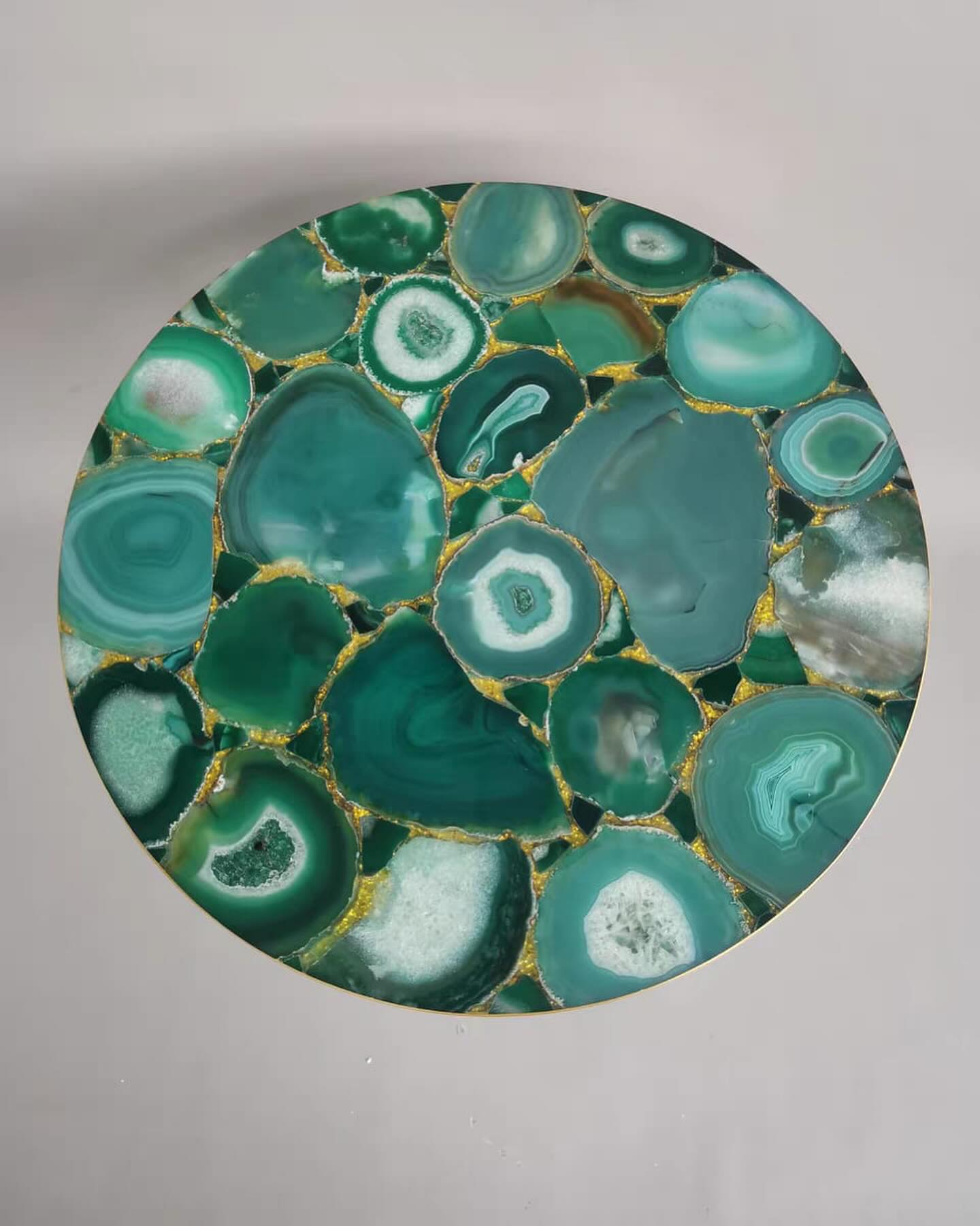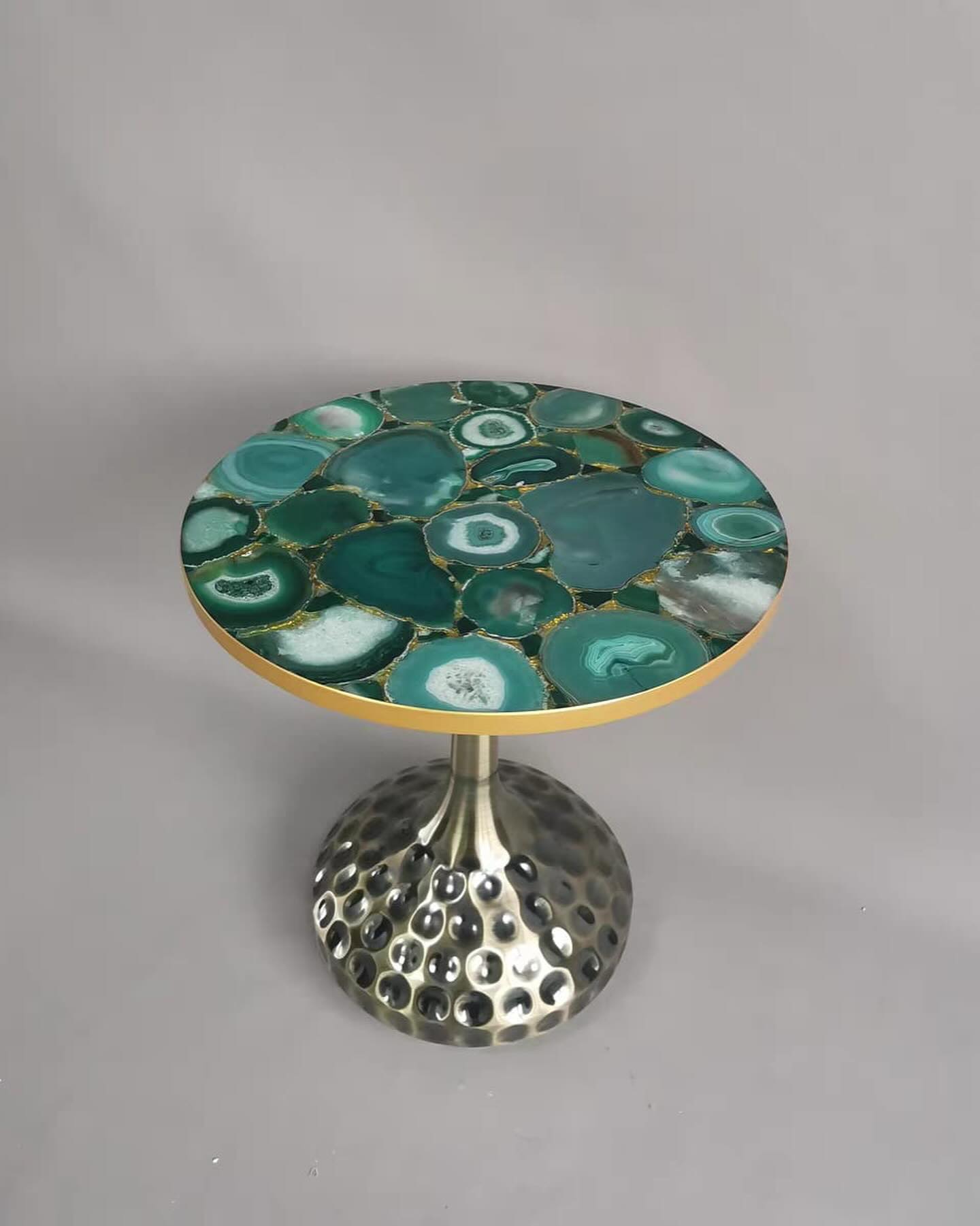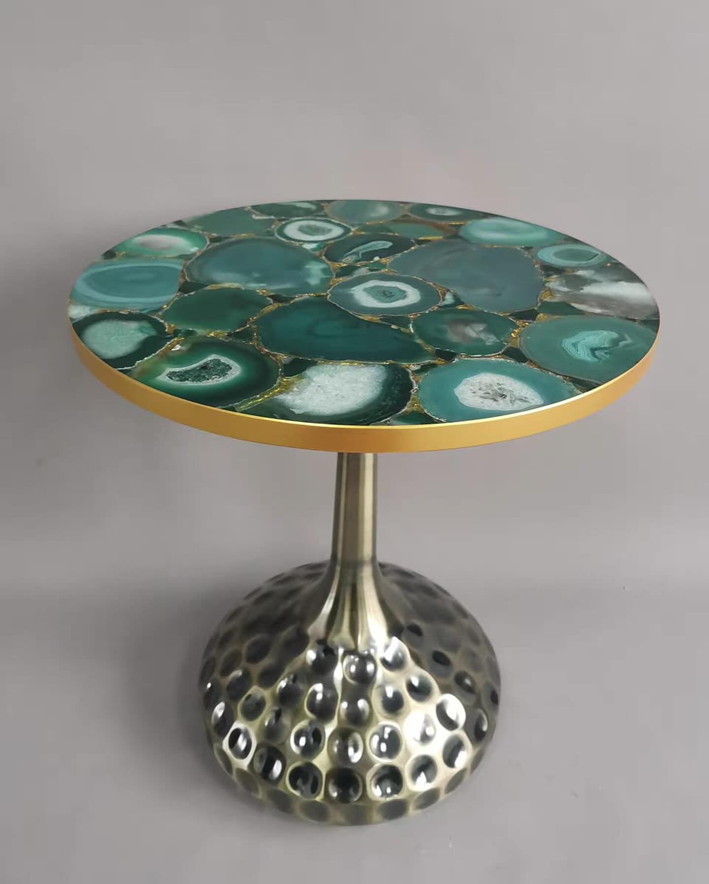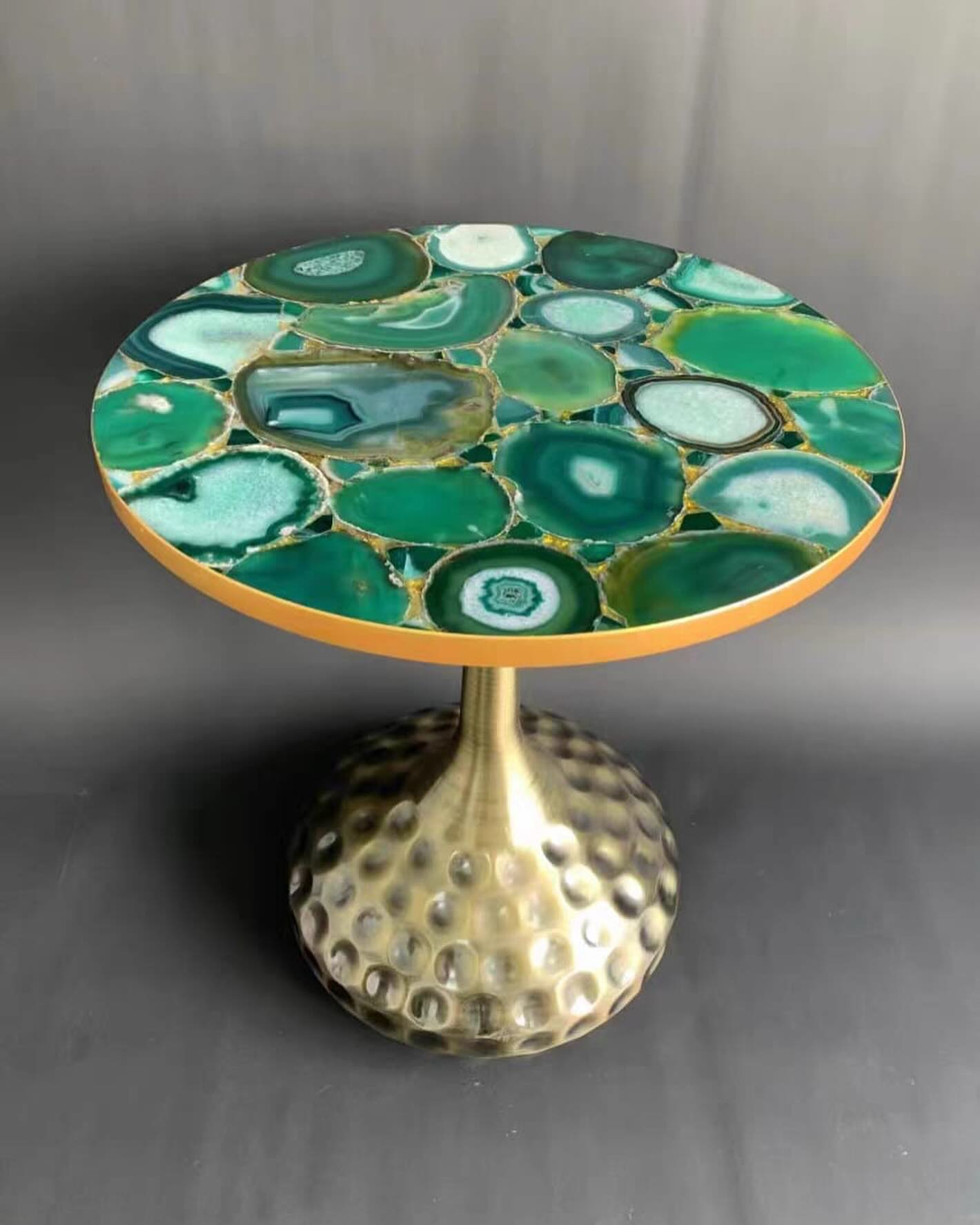 Классный приставной столик Monsterior Gems. Отличный и уникальный выбор для вашей гостиной или спальни – каждый столик, благодаря срезам отборного агата – неповторим. А ещё – сусальное золото и подстолье из нержавеющей стали.