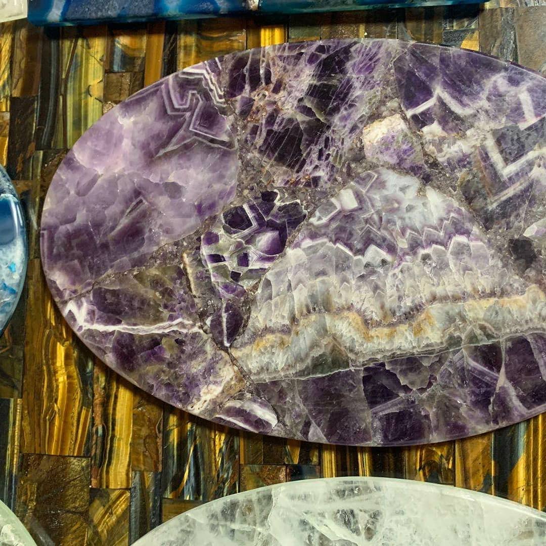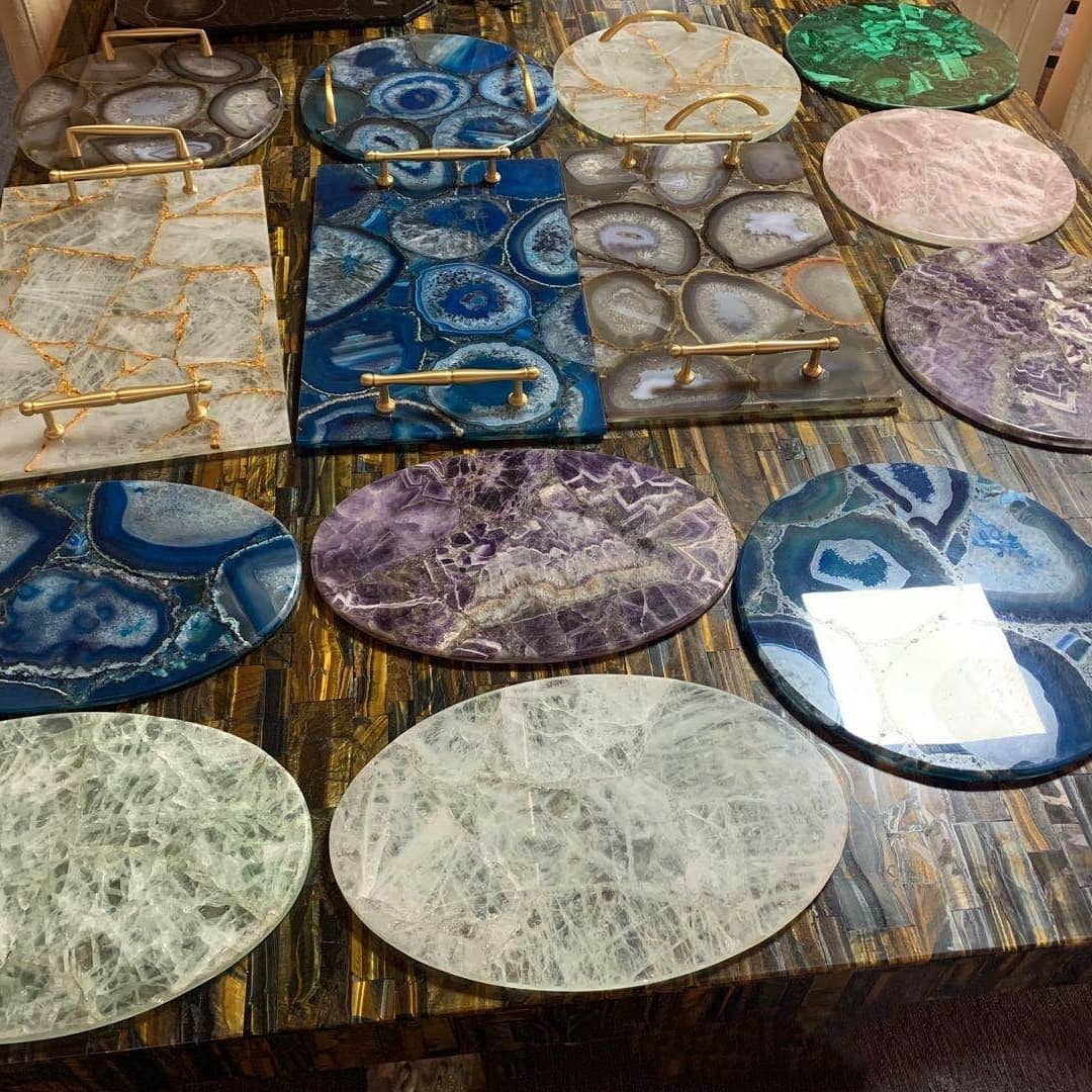 На массивной столешнице из тигрового глаза – яркая коллекция подносов и тарелочек, изготовленная из отборных самоцветов – агата, аметиста, кварца и т.д.