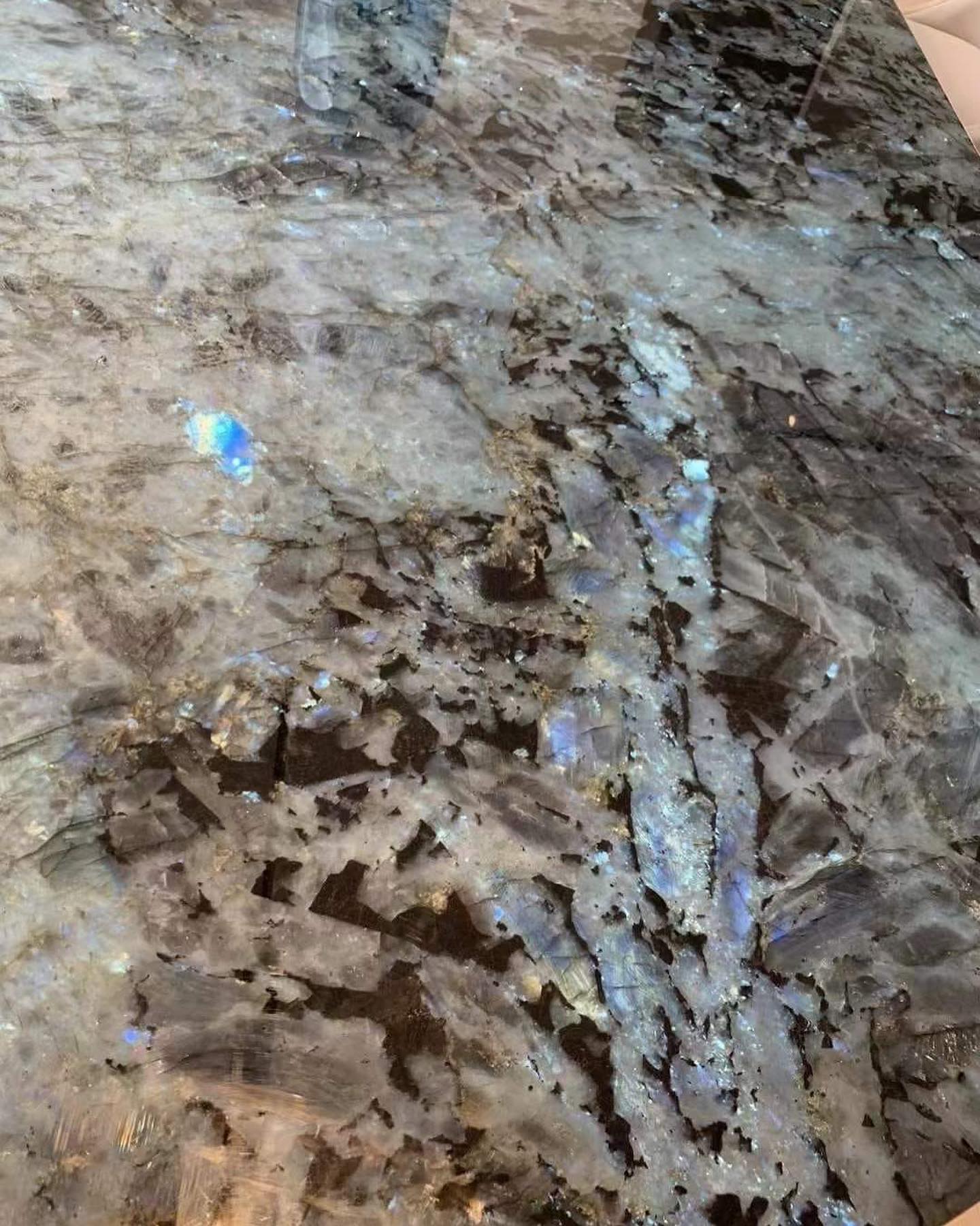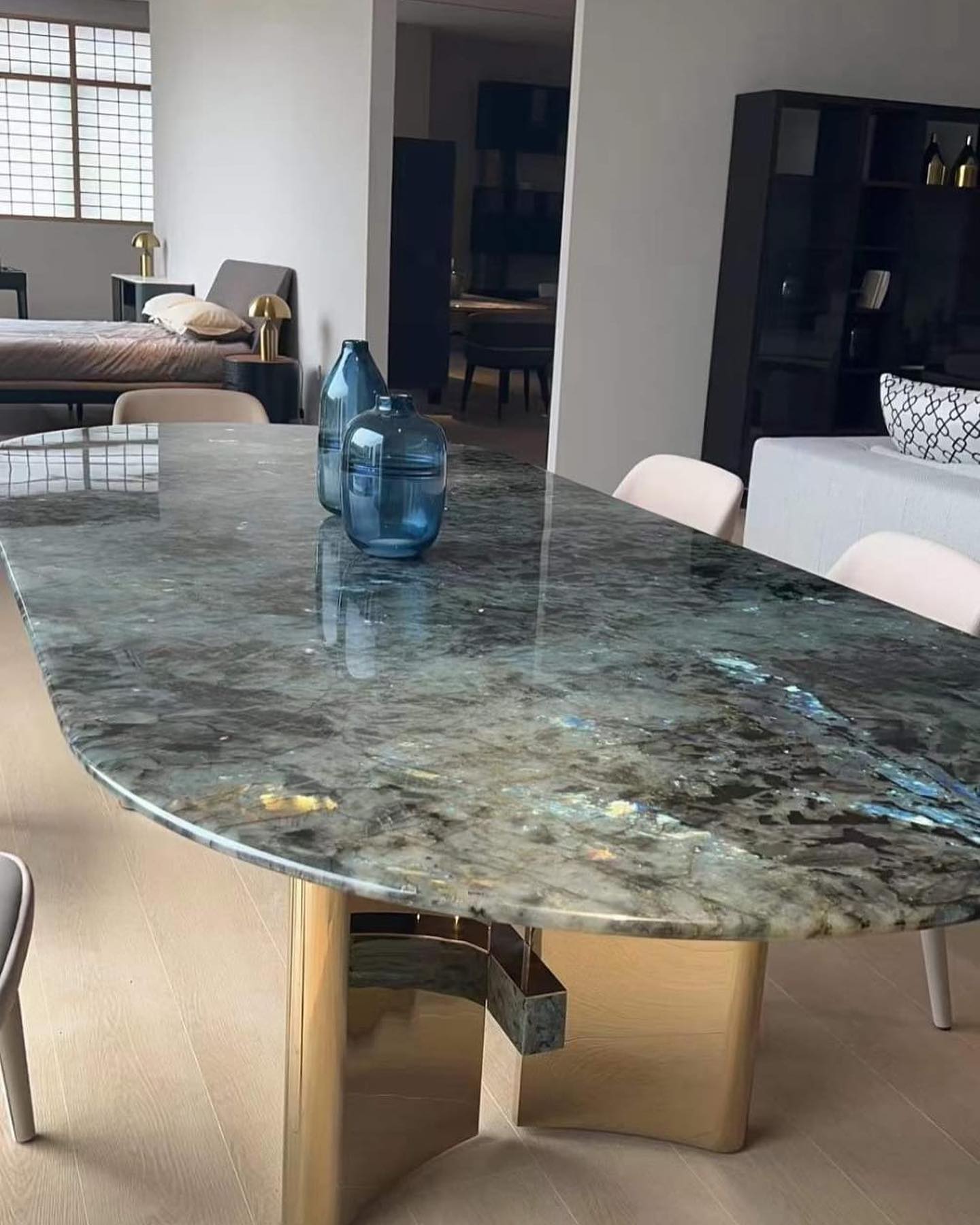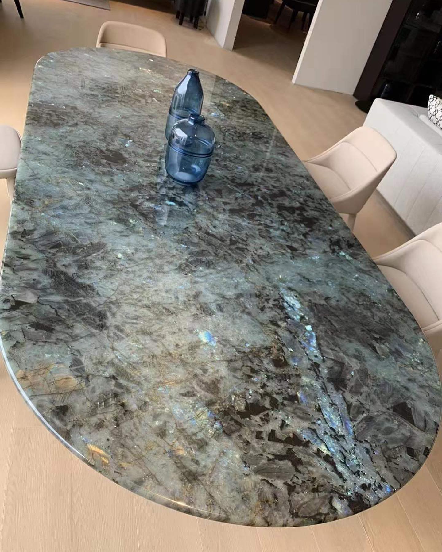 Роскошный обеденный стол Monsterior Gems со столешницей, изготовленной из отборного, сверкающего лабрадорита по заказу, для проекта на Новой Риге. Премиальное качество, отличное и яркое решения для современного, статусного интерьера.
