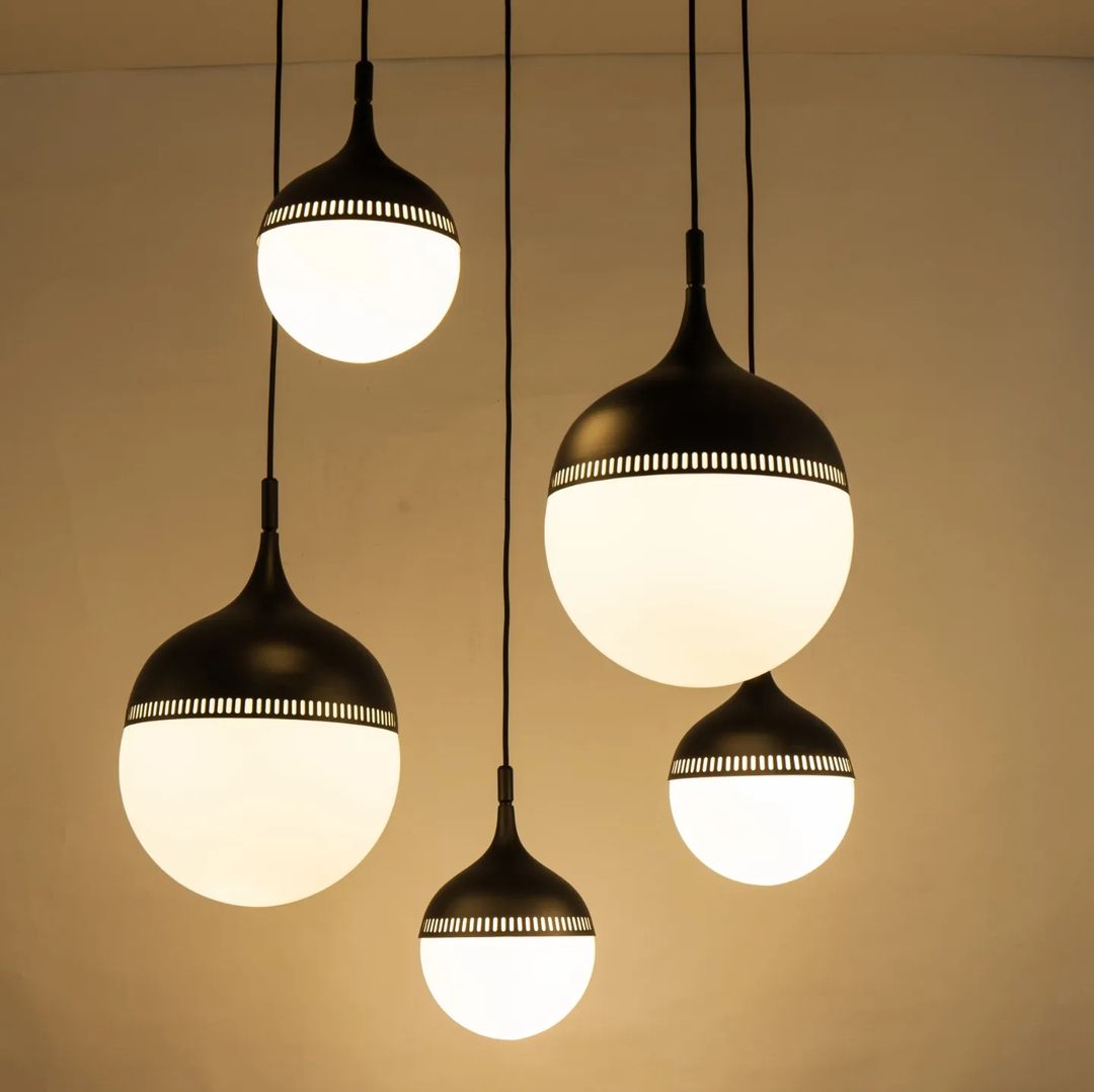 Стильная и изящная дизайнерская люстра для качественного украшения вашего личного пространства! Пять ярких сфер – в тёмном или золотистом обрамлении, на выбор.