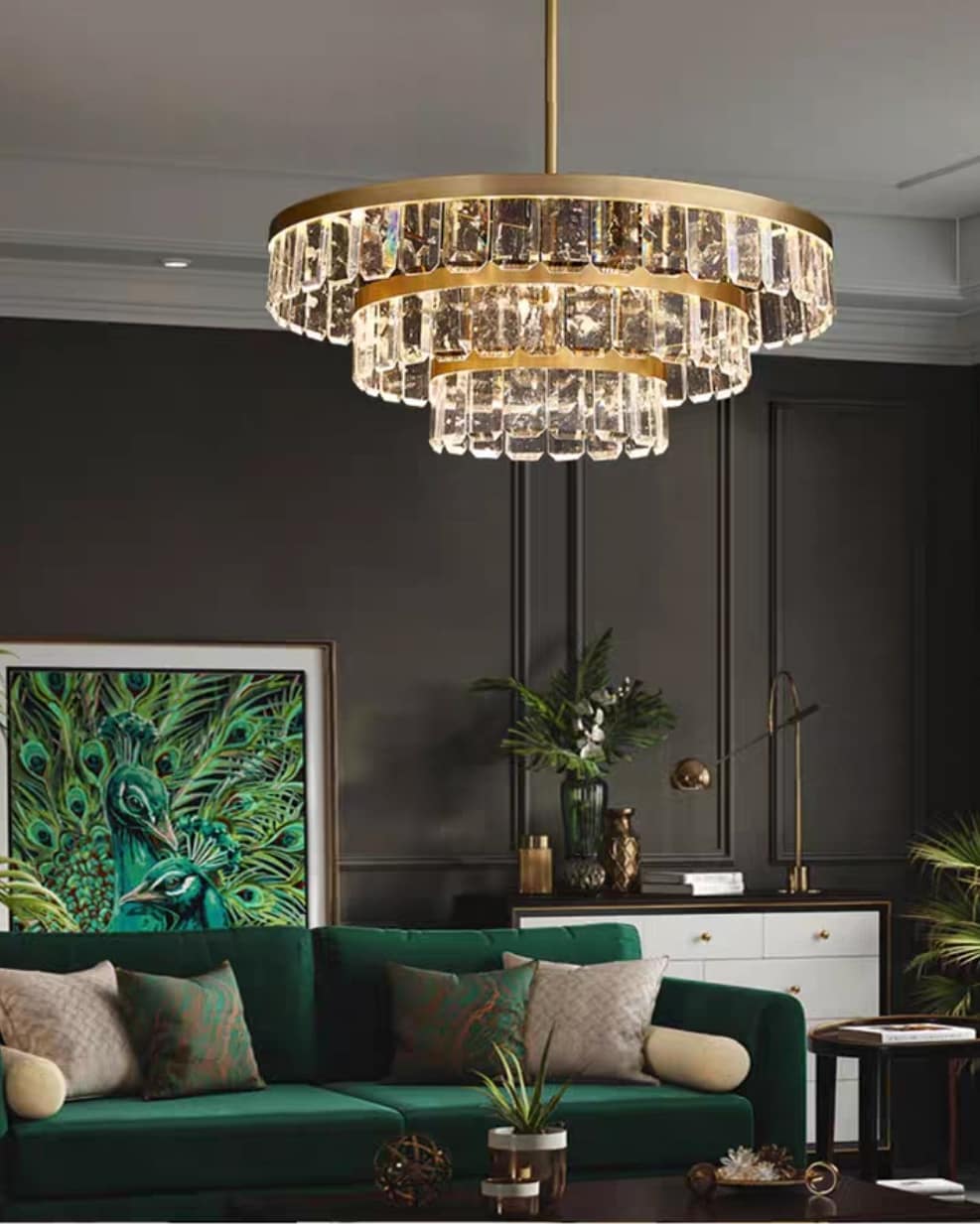 Дизайнерская люстра ручной работы для солидной гостиной. Натуральные кристаллы горного хрусталя в сочетании с благородной латунью. Изящная красота и яркий источник комфортного и экологичного света.