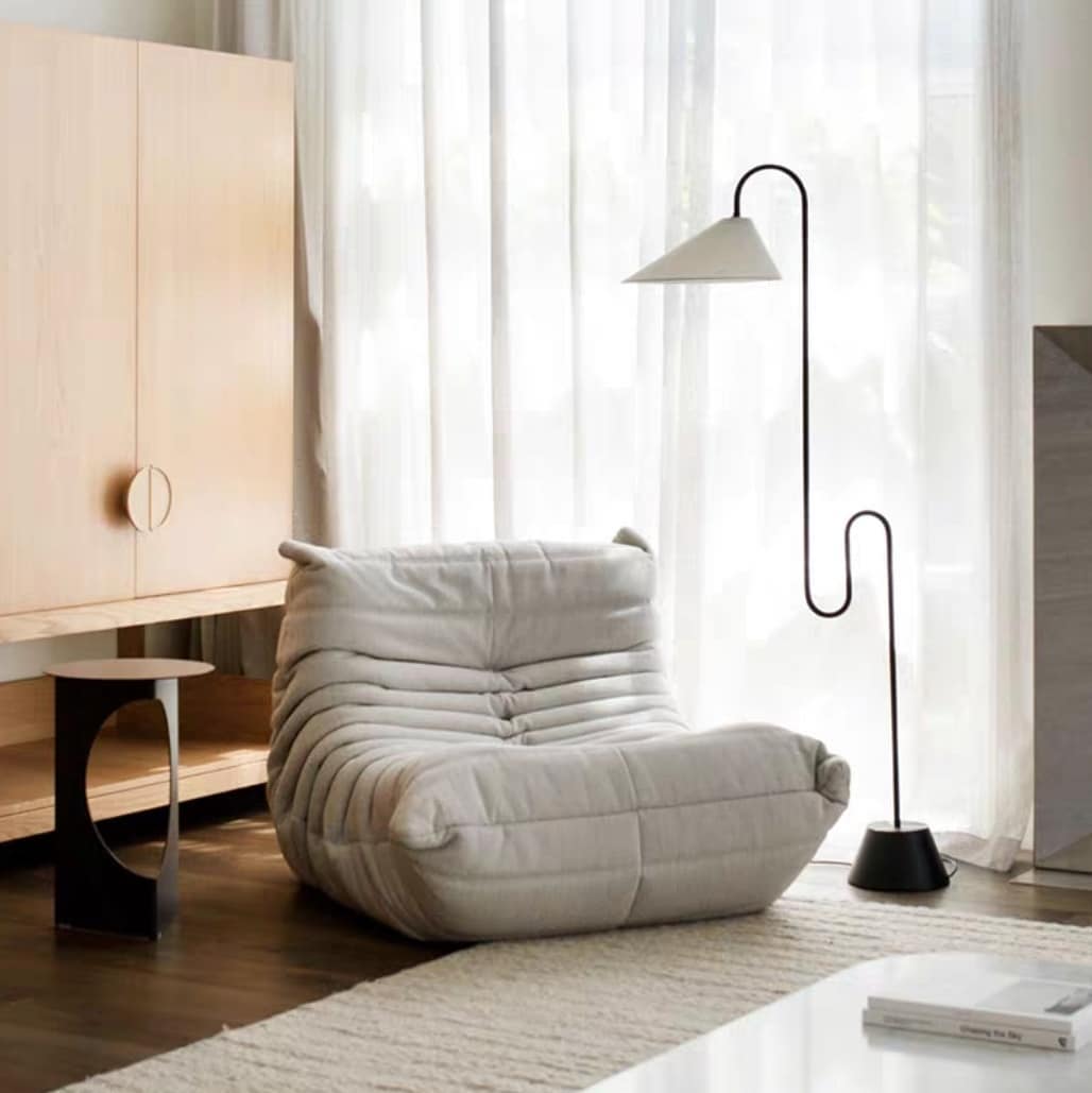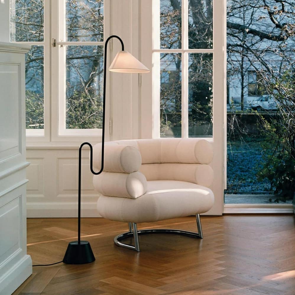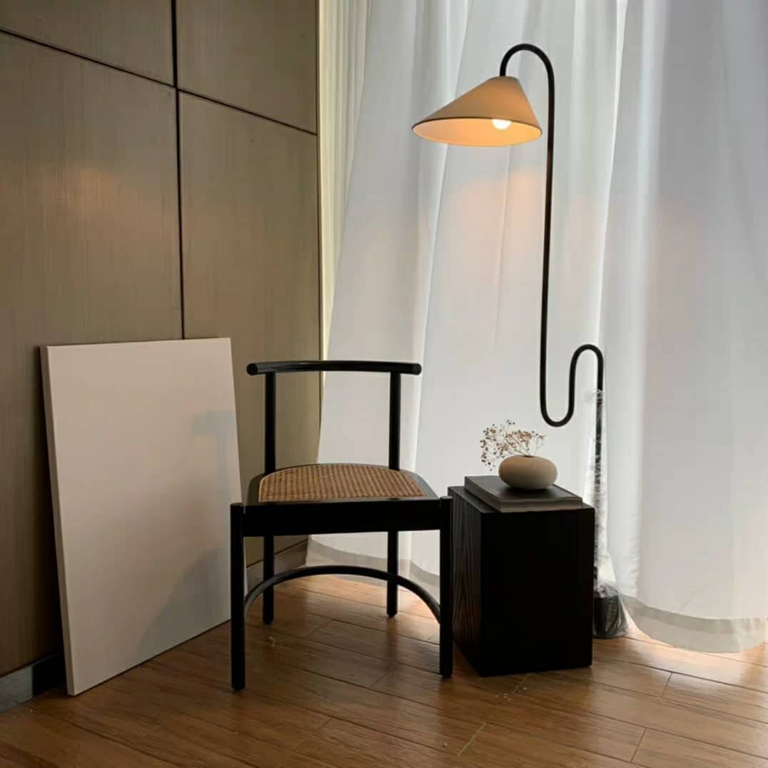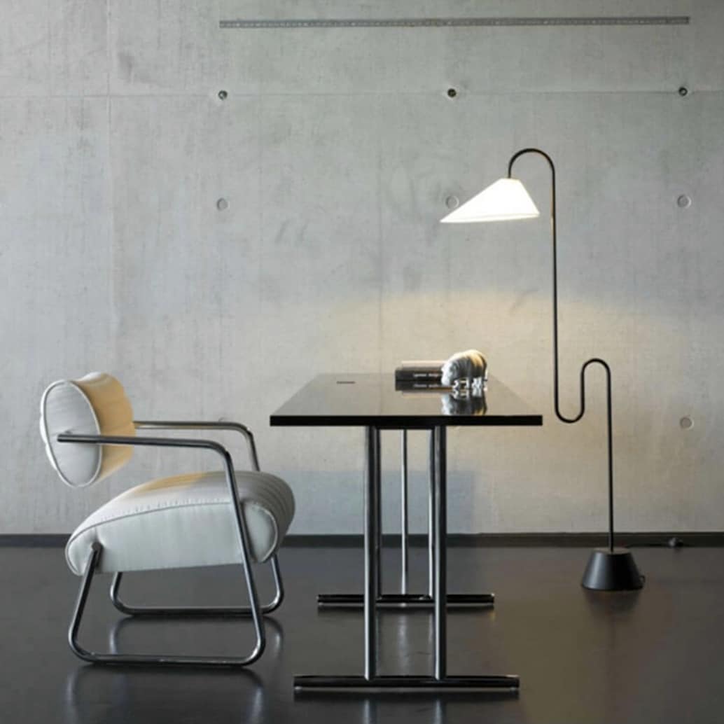 Изогнутая, утонченная «ножка» отлично сочетается с роскошным абажуром и оригинальным основанием. Тот самый случай, когда можно смело упомянуть о теплом, «ламповом», в прямом смысле, свете.