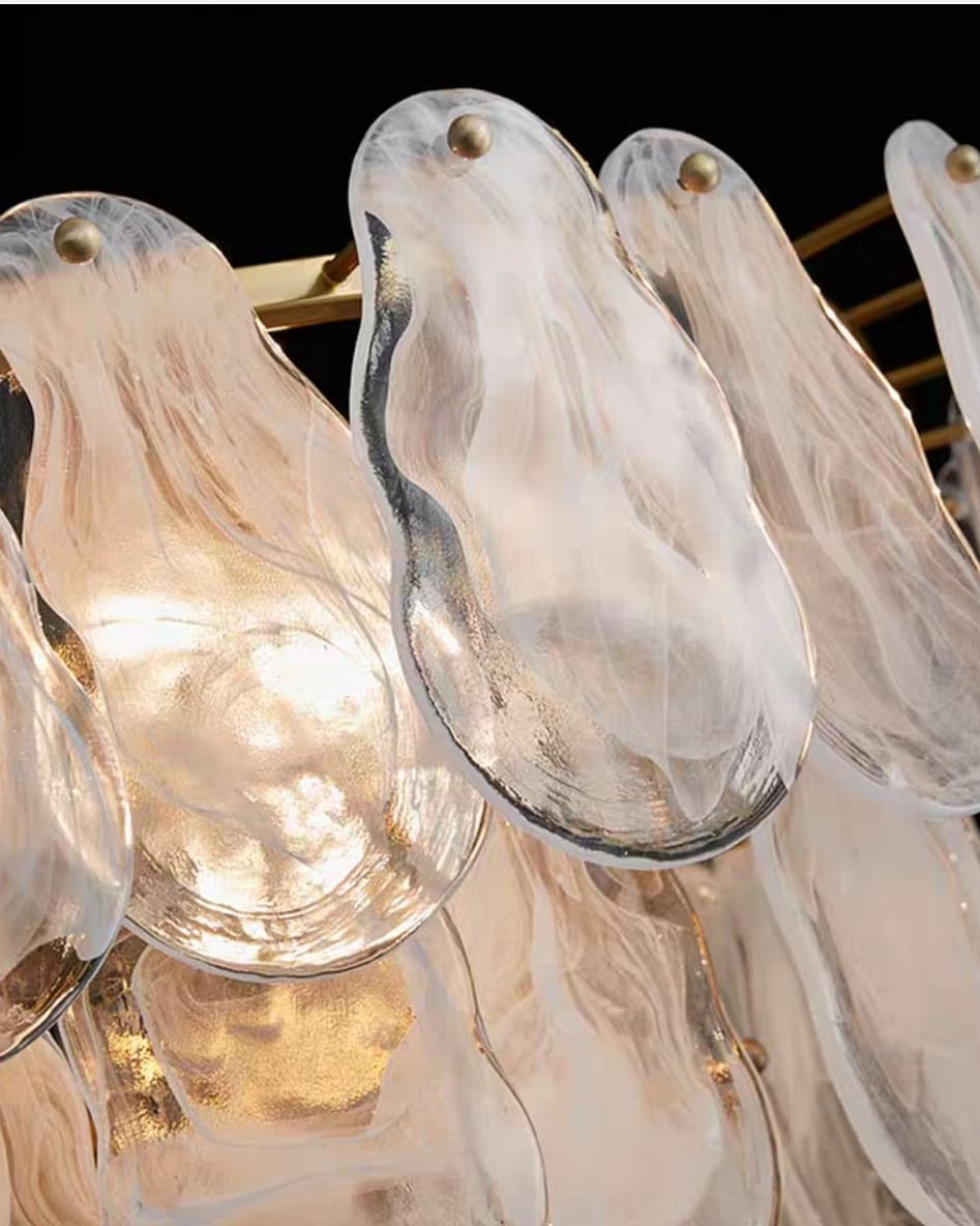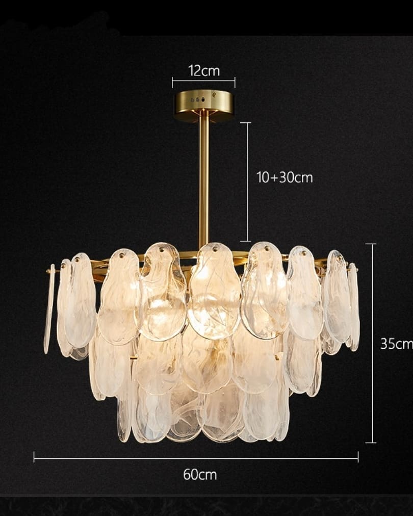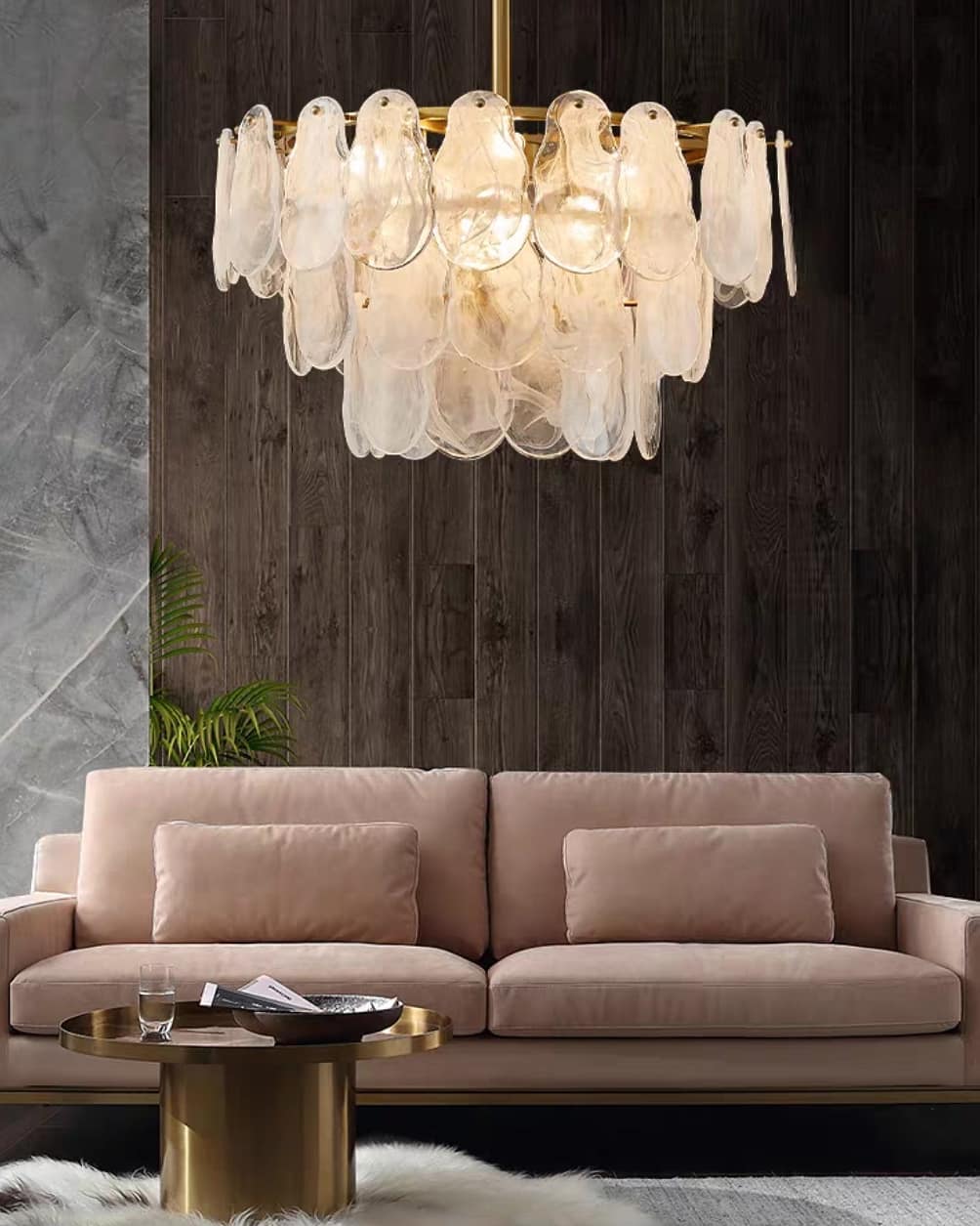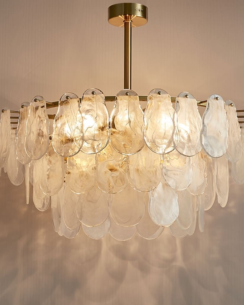 Стекло, так похожее на подтаявшие льдинки в очаровательном сочетании с корпусом из благородной латуни и экологичным, комфортным светом. Роскошное решение для солидной современной гостиной.