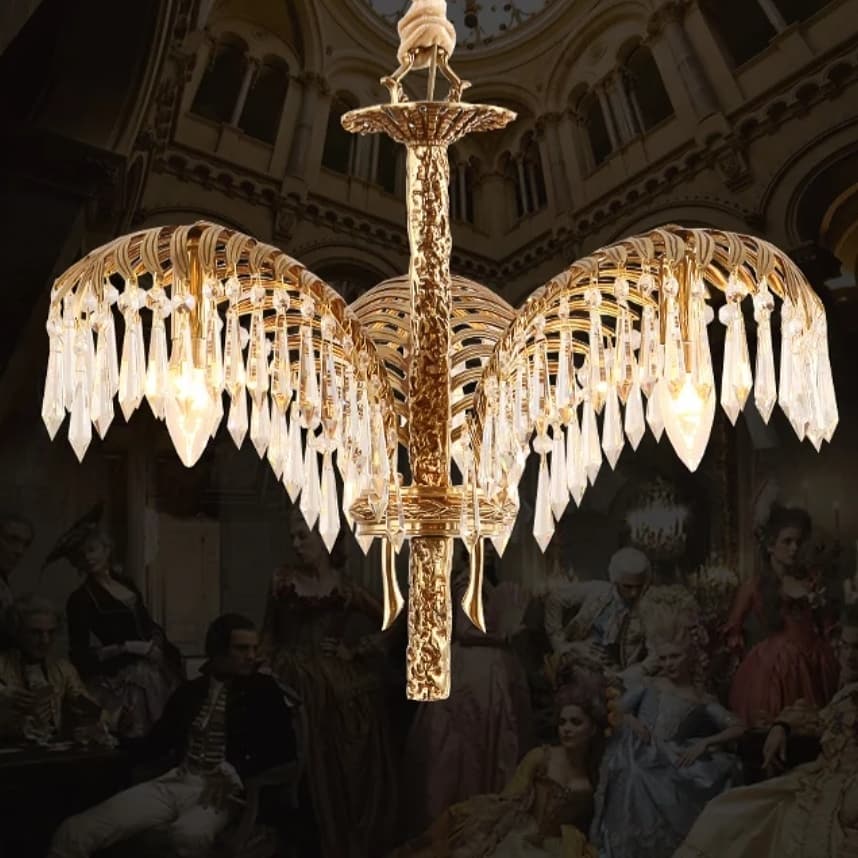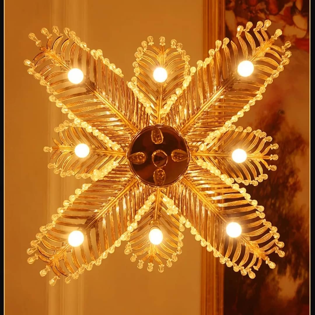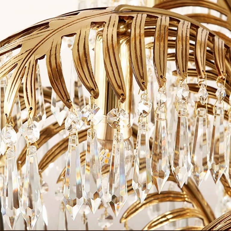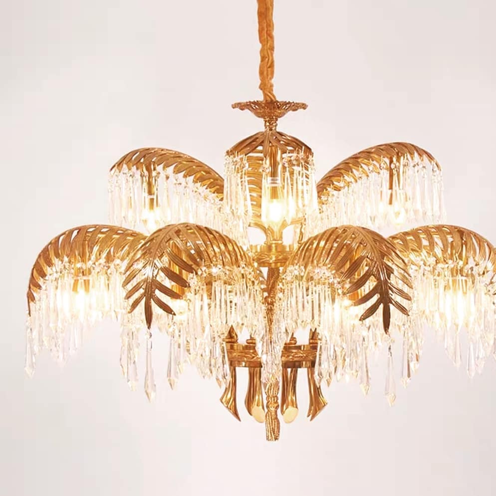 Каскадные хрустальные подвески на золотых пальмовых листьях наливаются светом и наполняют пространство бриллиантовым мерцанием.