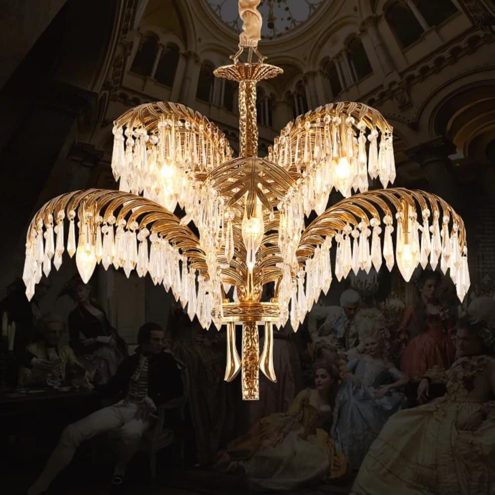 Каскадные хрустальные подвески на золотых пальмовых листьях наливаются светом и наполняют пространство бриллиантовым мерцанием.
