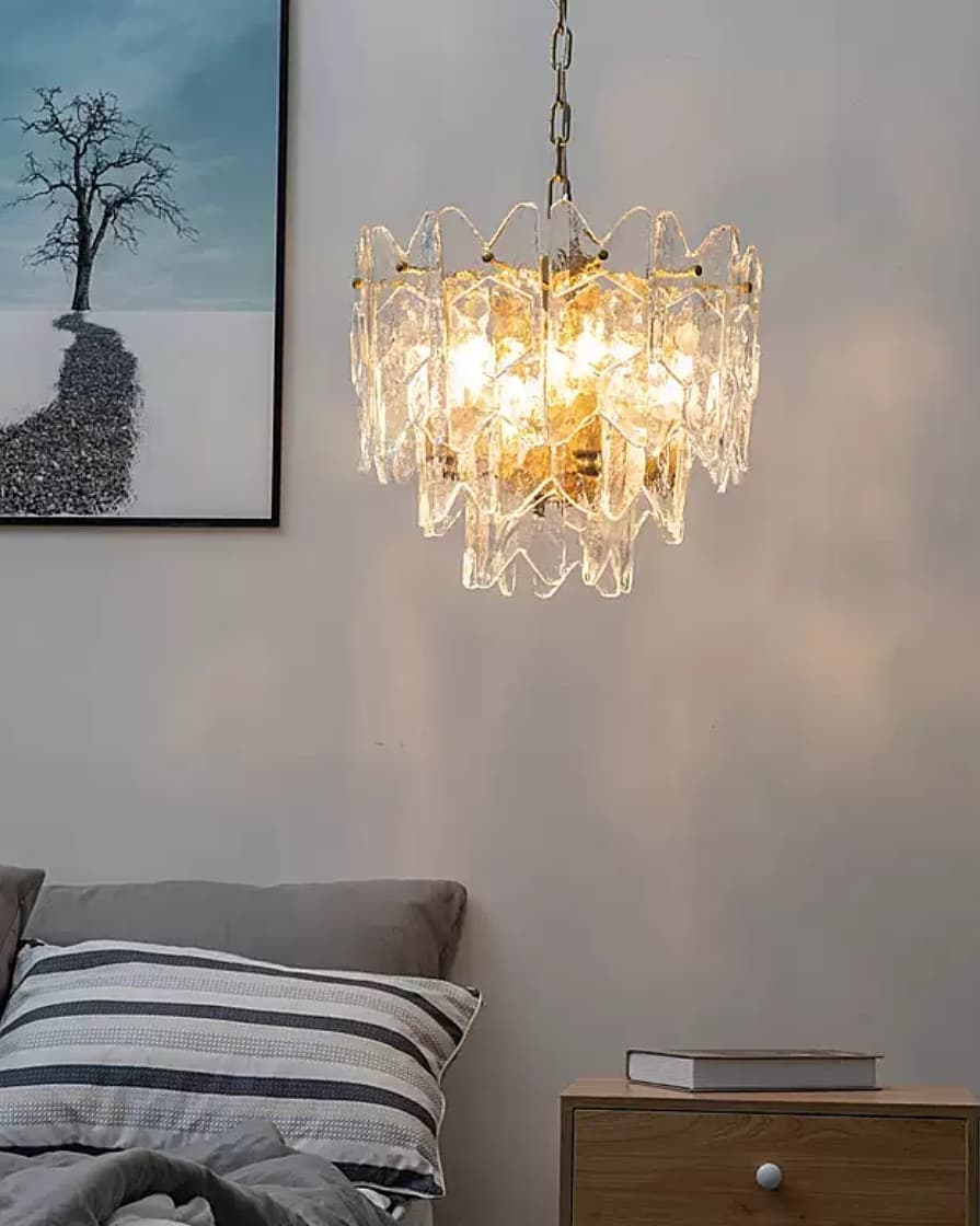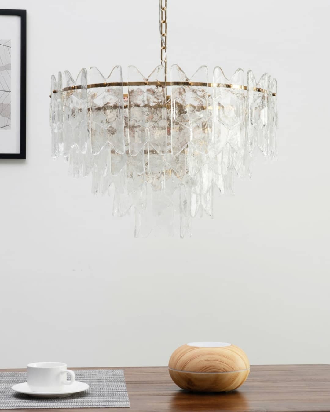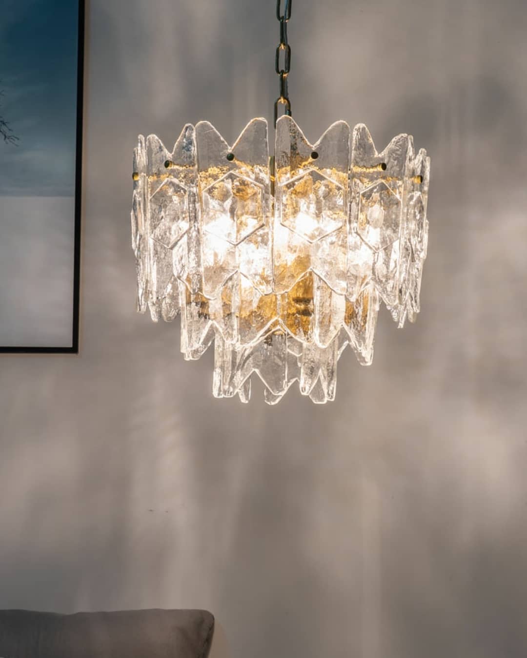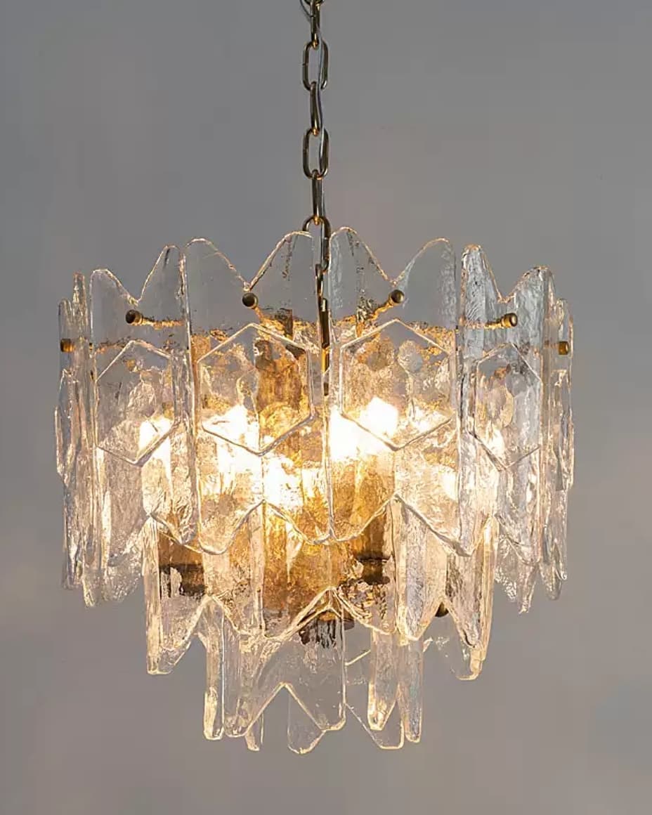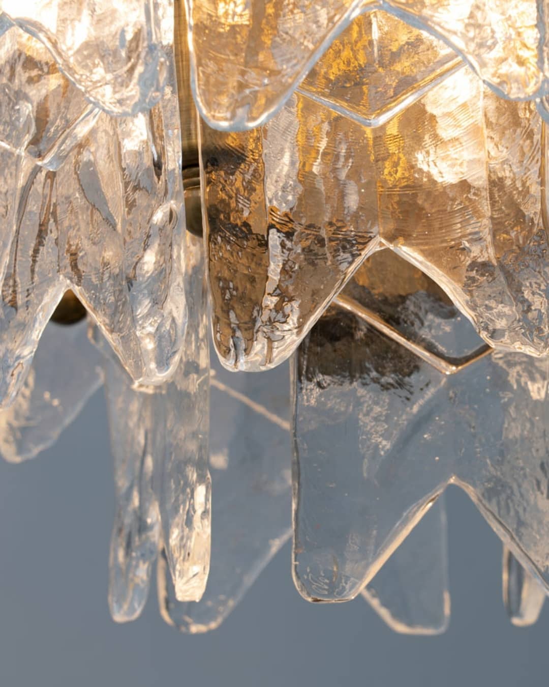 Роскошная люстра ручной работы из латуни и стекла, похожего на сверкающие кусочки льда. Классическая форма в винтажном стиле. Отлично впишется в интерьер современной гостиной. Комфортный и теплый свет в вашем интерьере.
