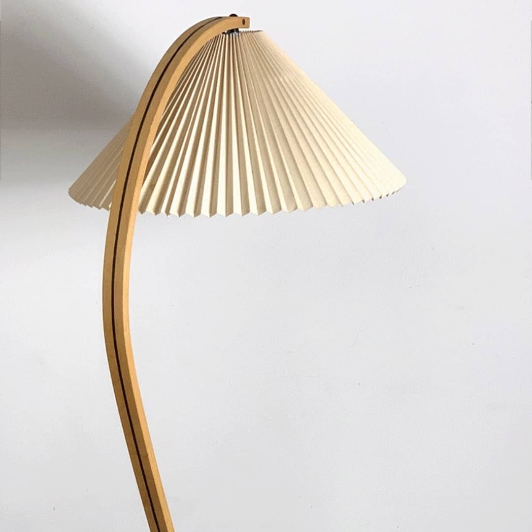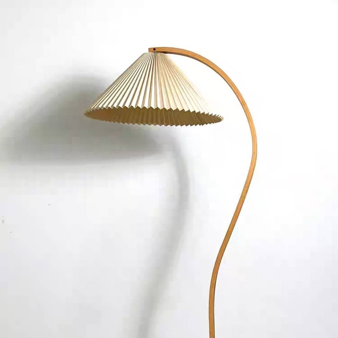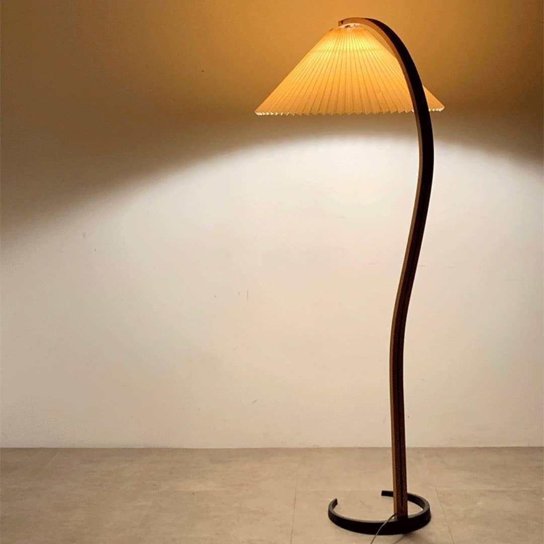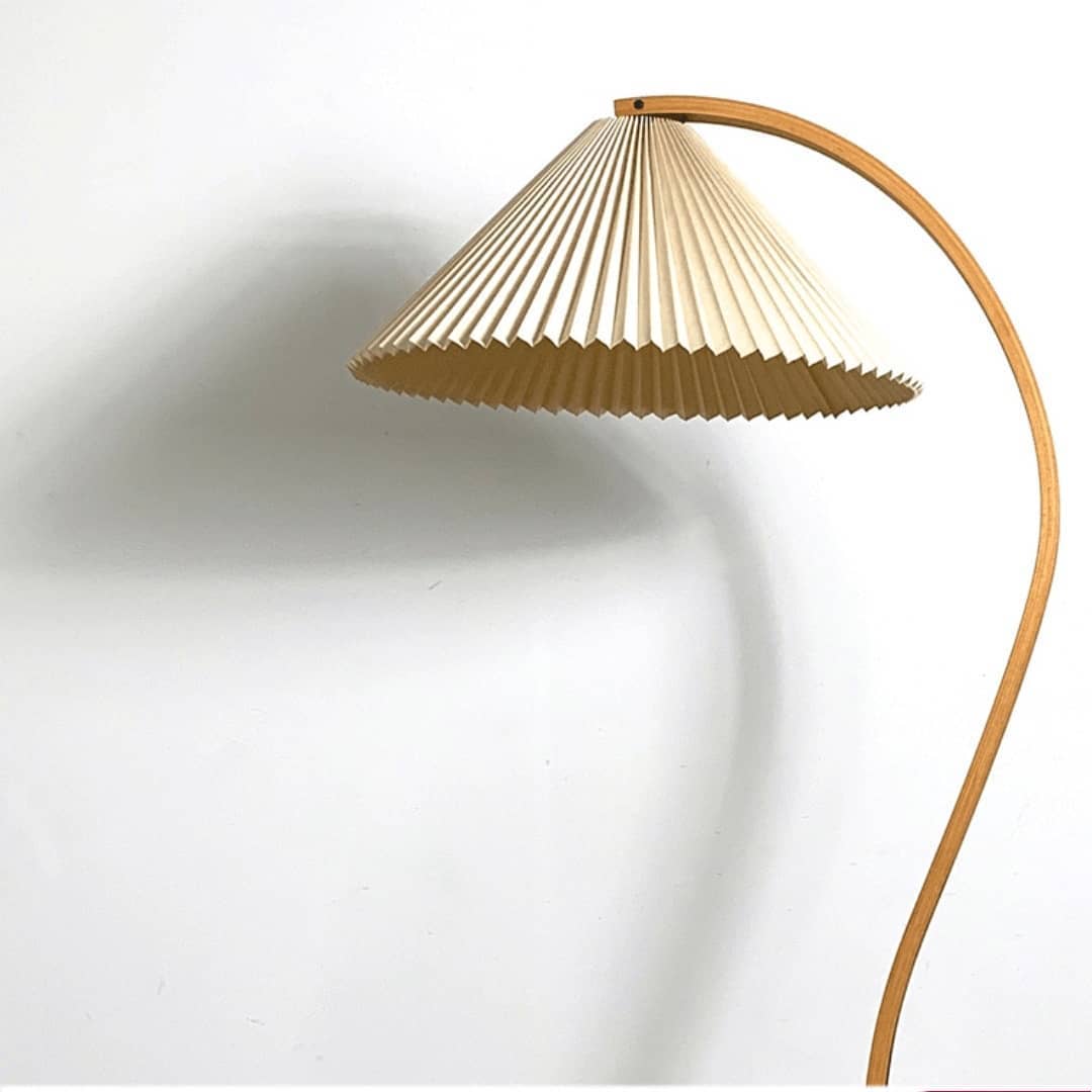 Симпатичный напольный светильник, в скандинавском стиле, с легкой ностальгической ноткой, дизайном – середины ХХ века. Натуральные материалы – тик, береза. Аккуратный плиссированный абажур.