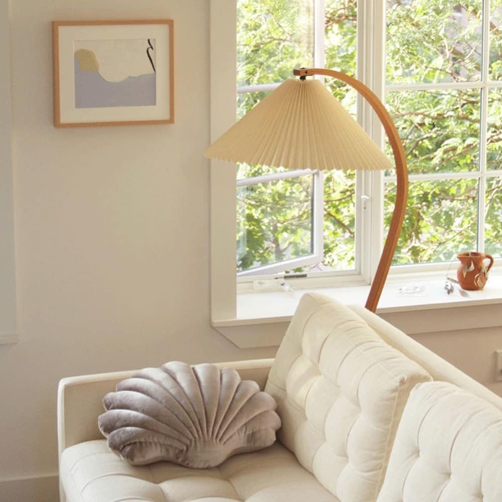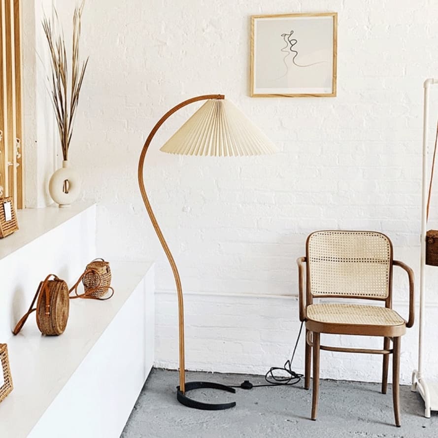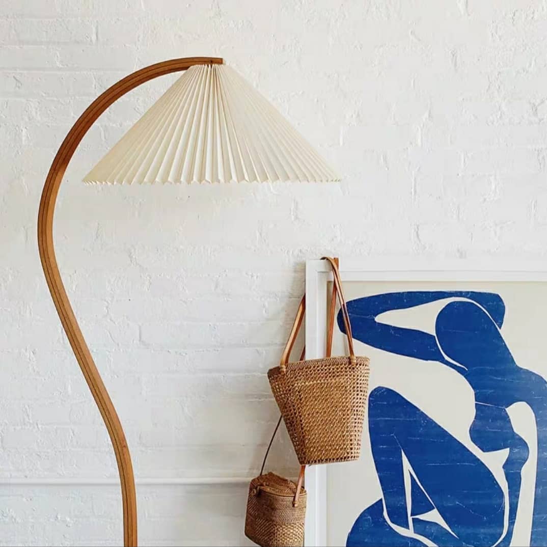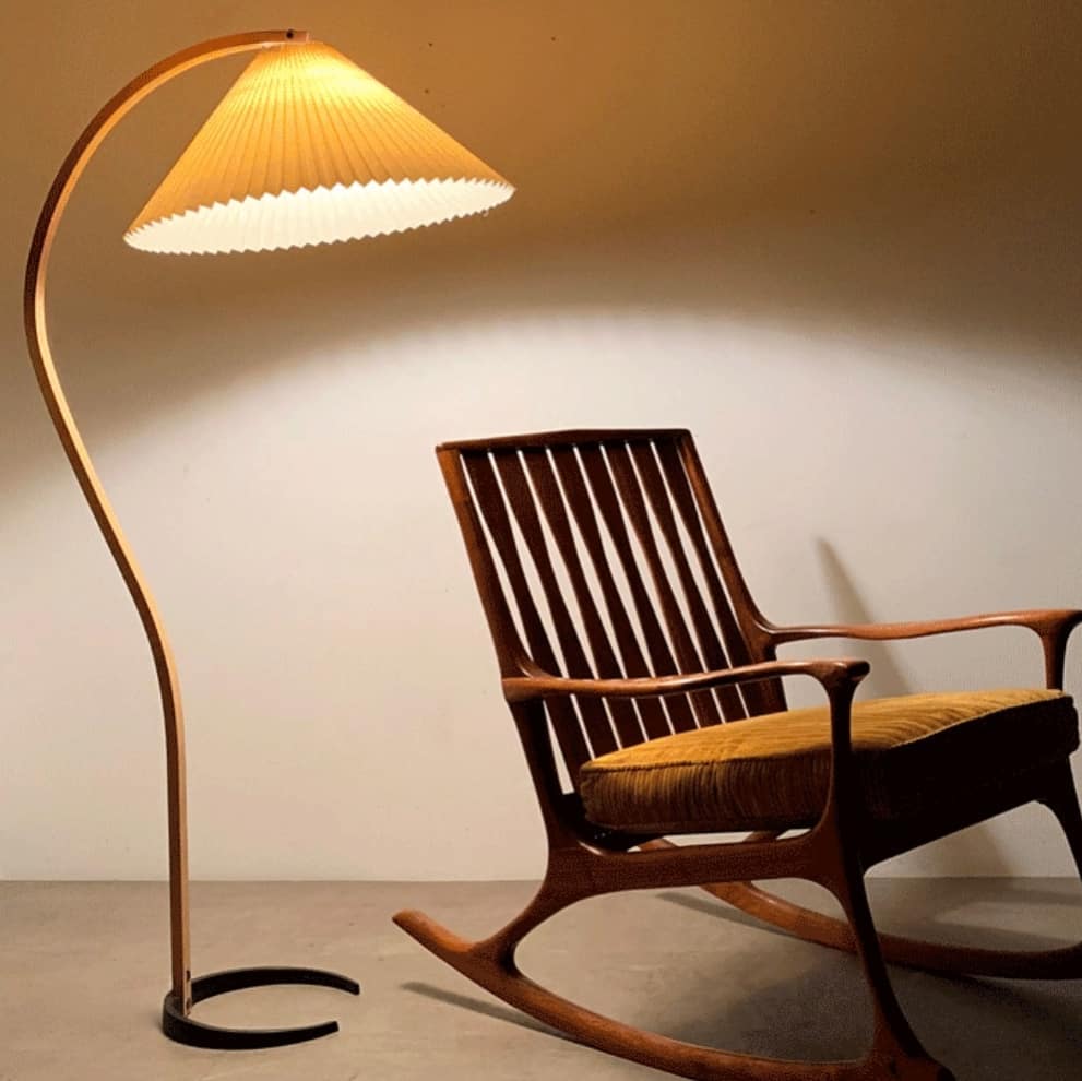 Симпатичный напольный светильник, в скандинавском стиле, с легкой ностальгической ноткой, дизайном – середины ХХ века. Натуральные материалы – тик, береза. Аккуратный плиссированный абажур.